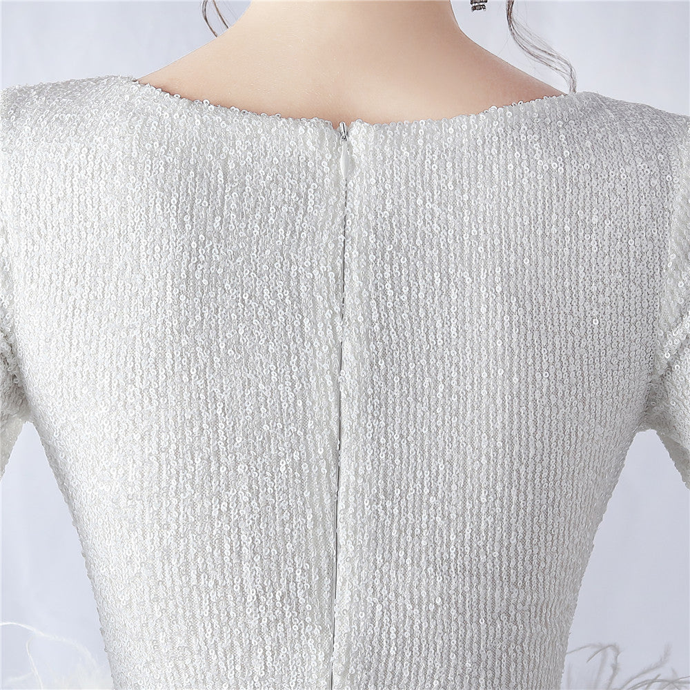 A maxi dress with a slim silhouette that skims the frame. A V-neckline with feathered sequin accents and a side split define its refined, formal look.