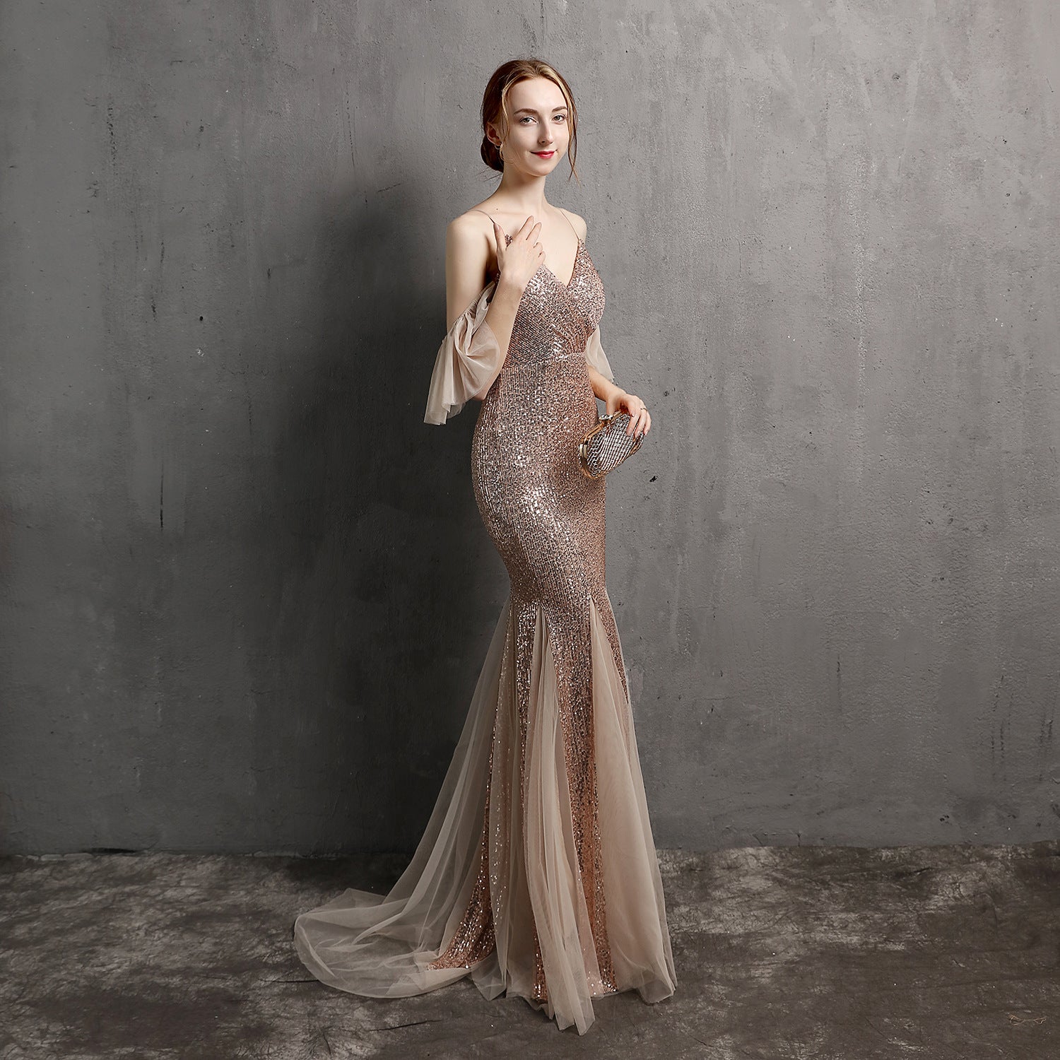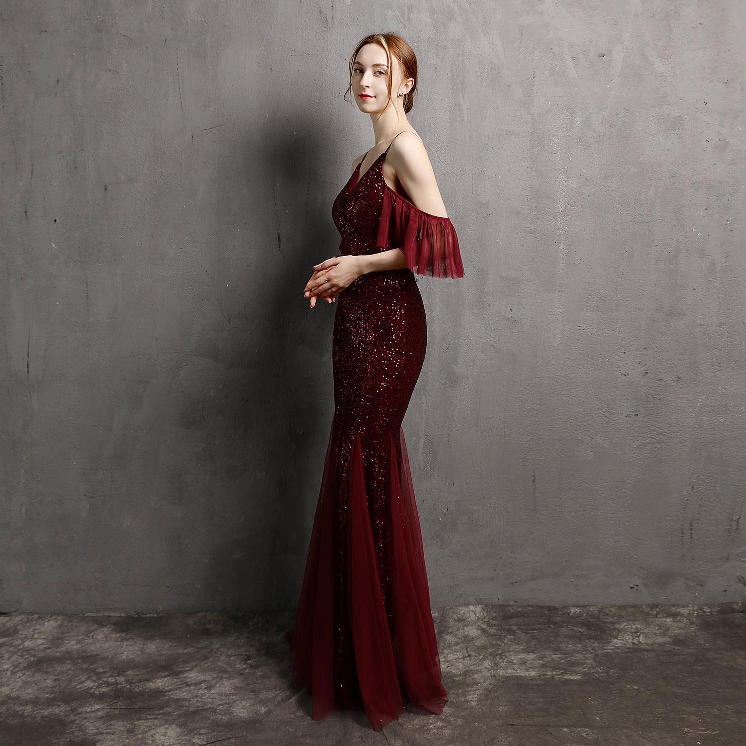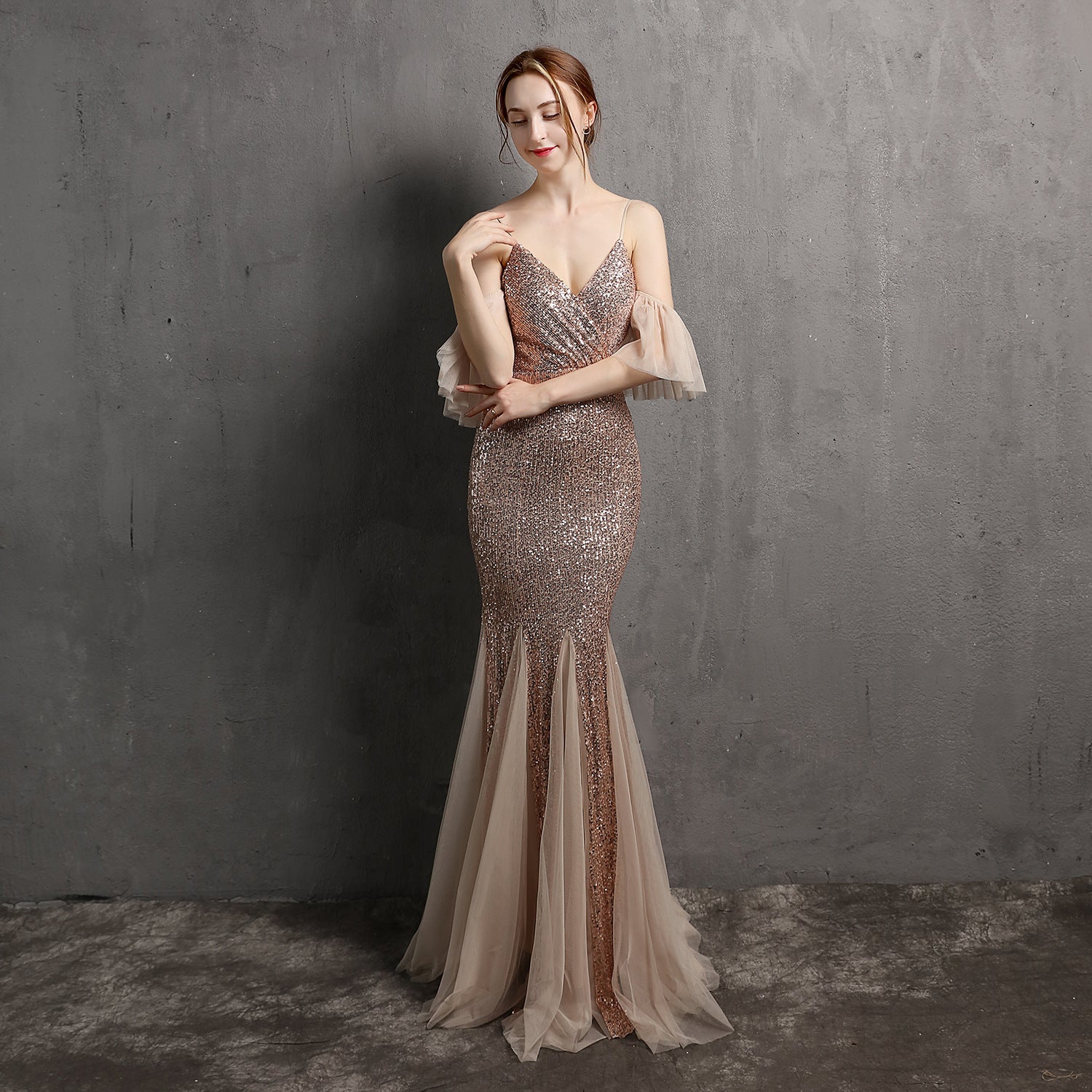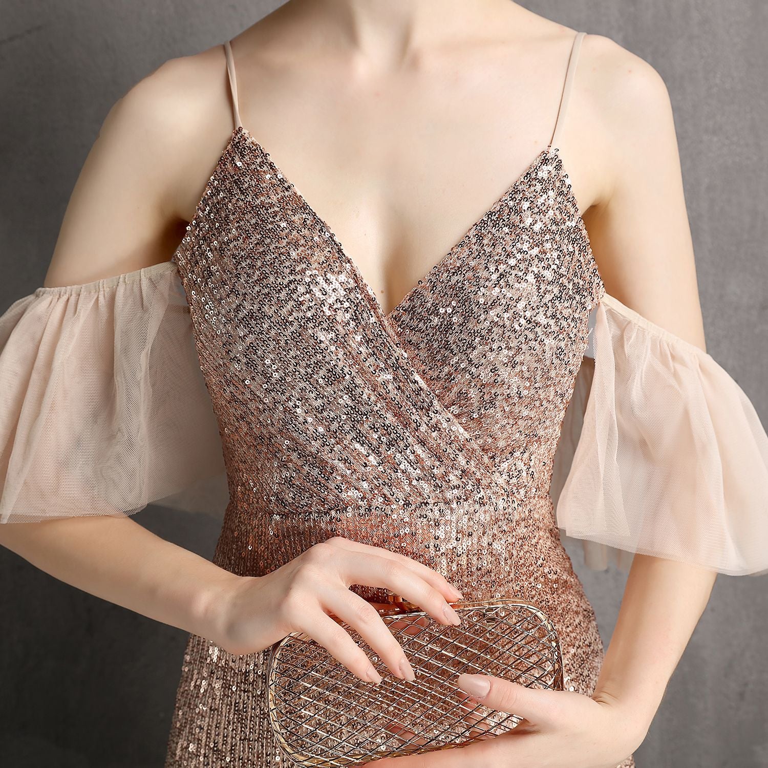 An elegant sequin maxi with a slim silhouette. The V-neckline and fishtail detail are accented by sequins for subtle shine.