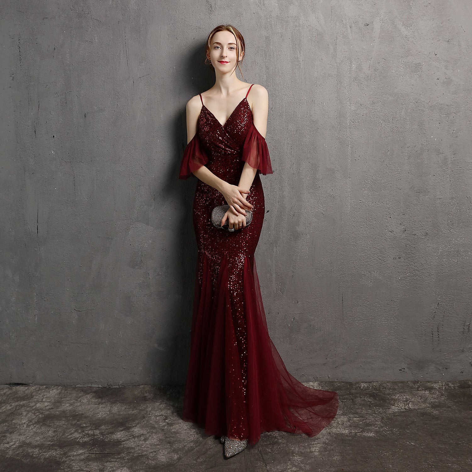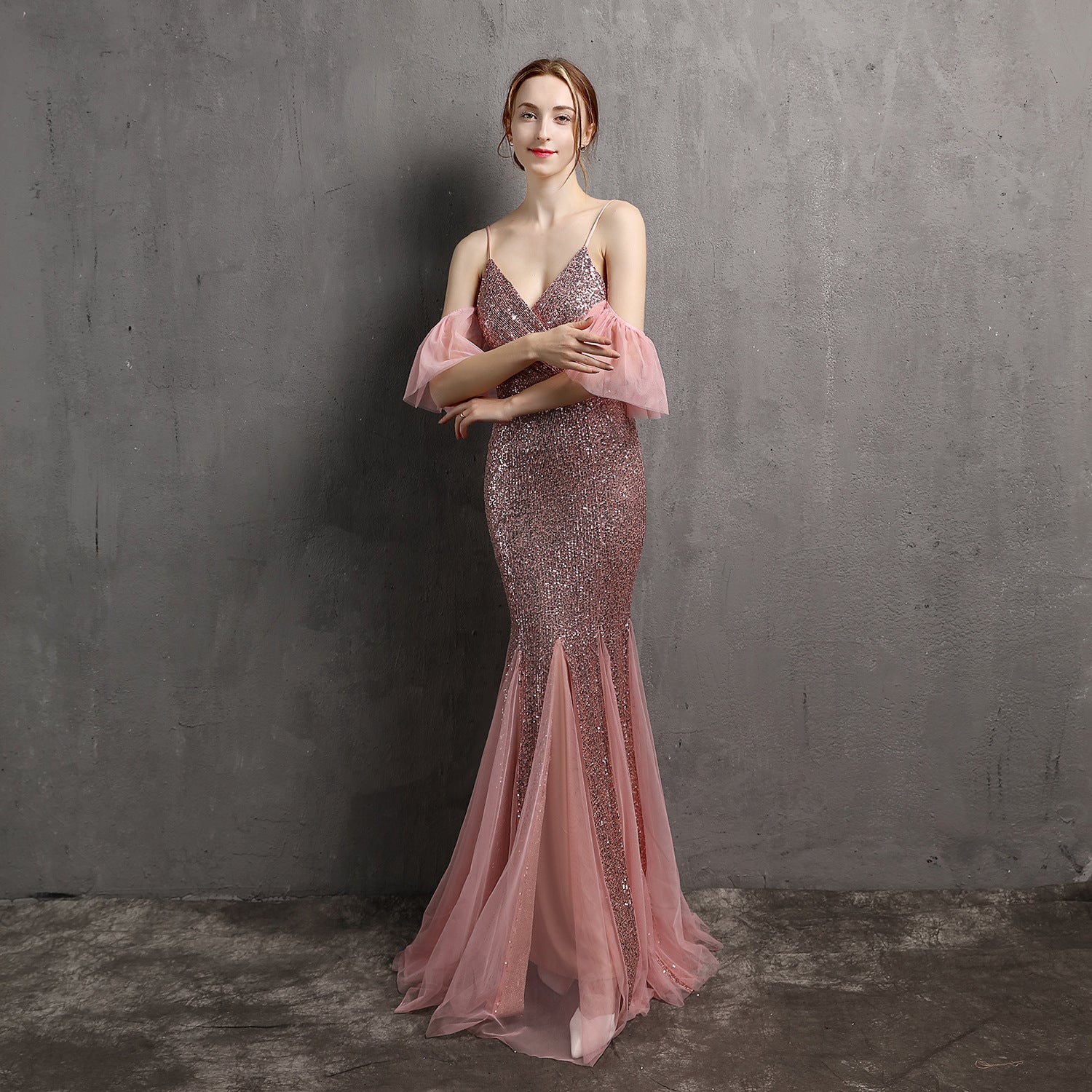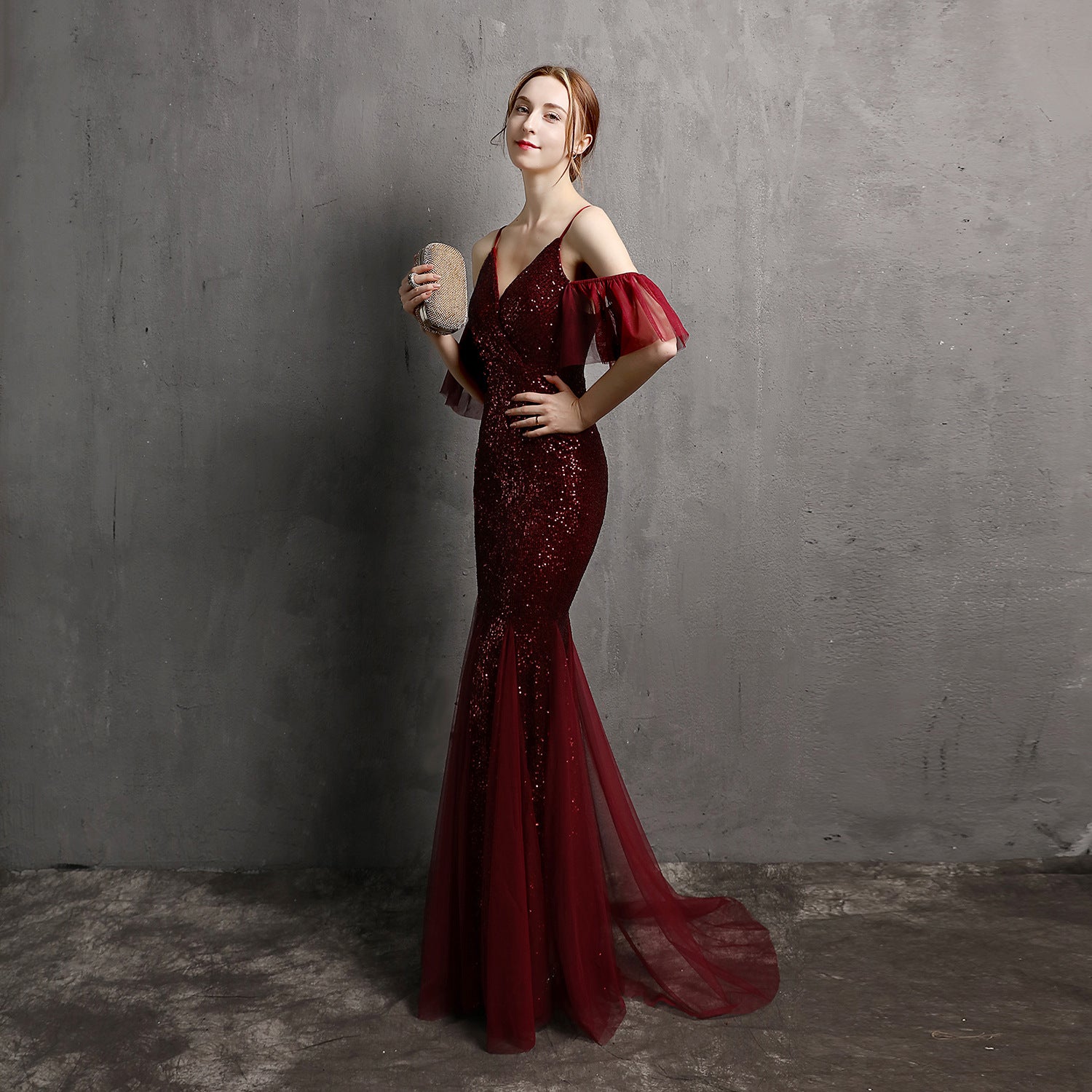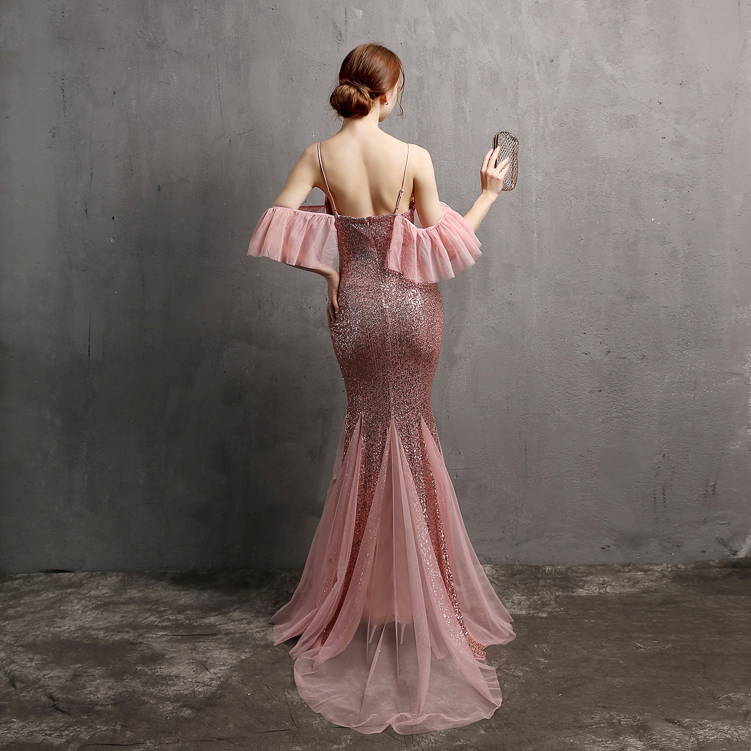 An elegant sequin maxi with a slim silhouette. The V-neckline and fishtail detail are accented by sequins for subtle shine.