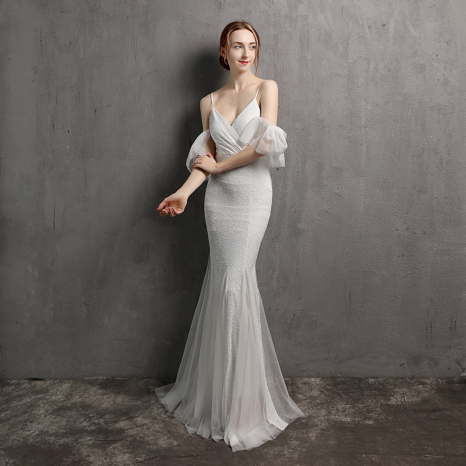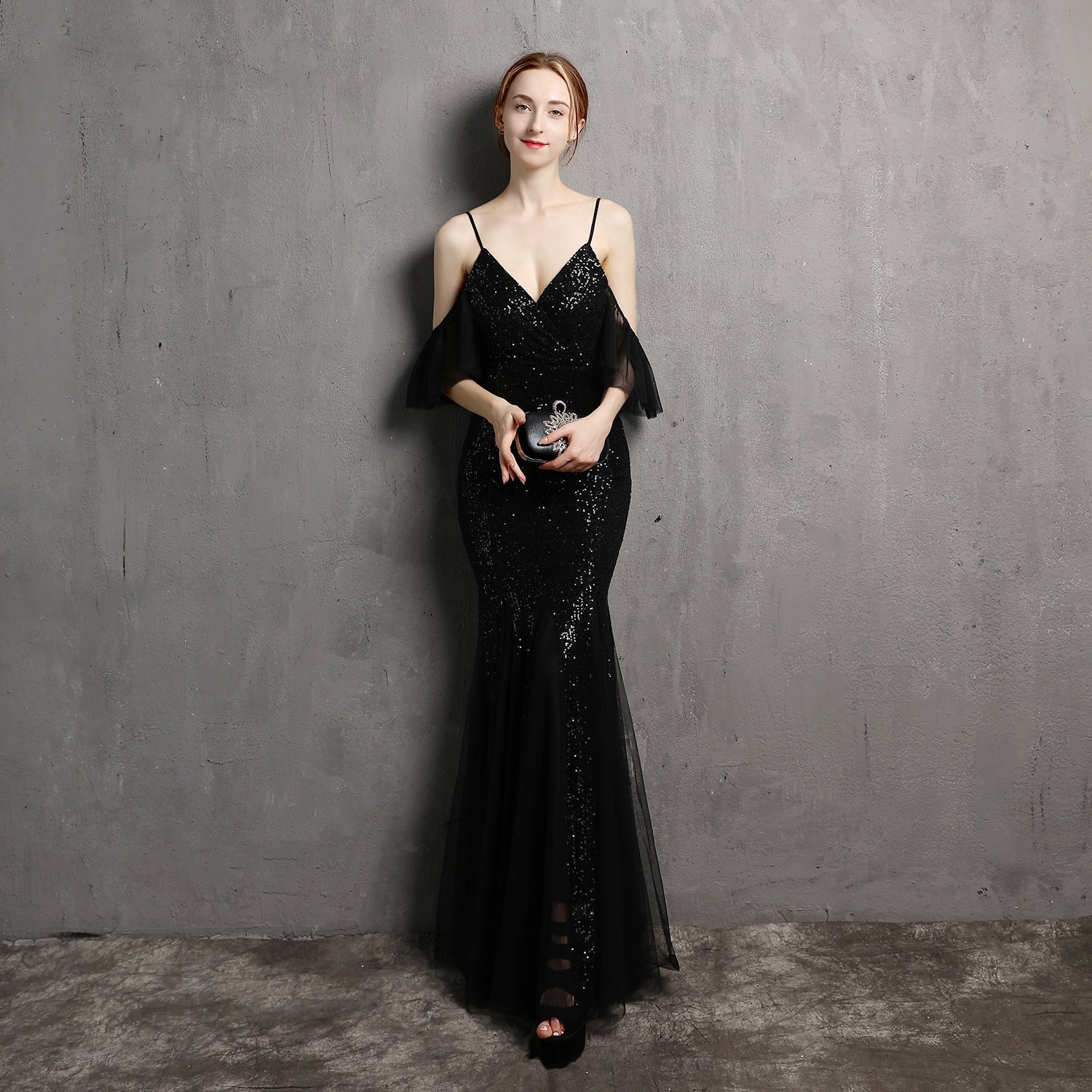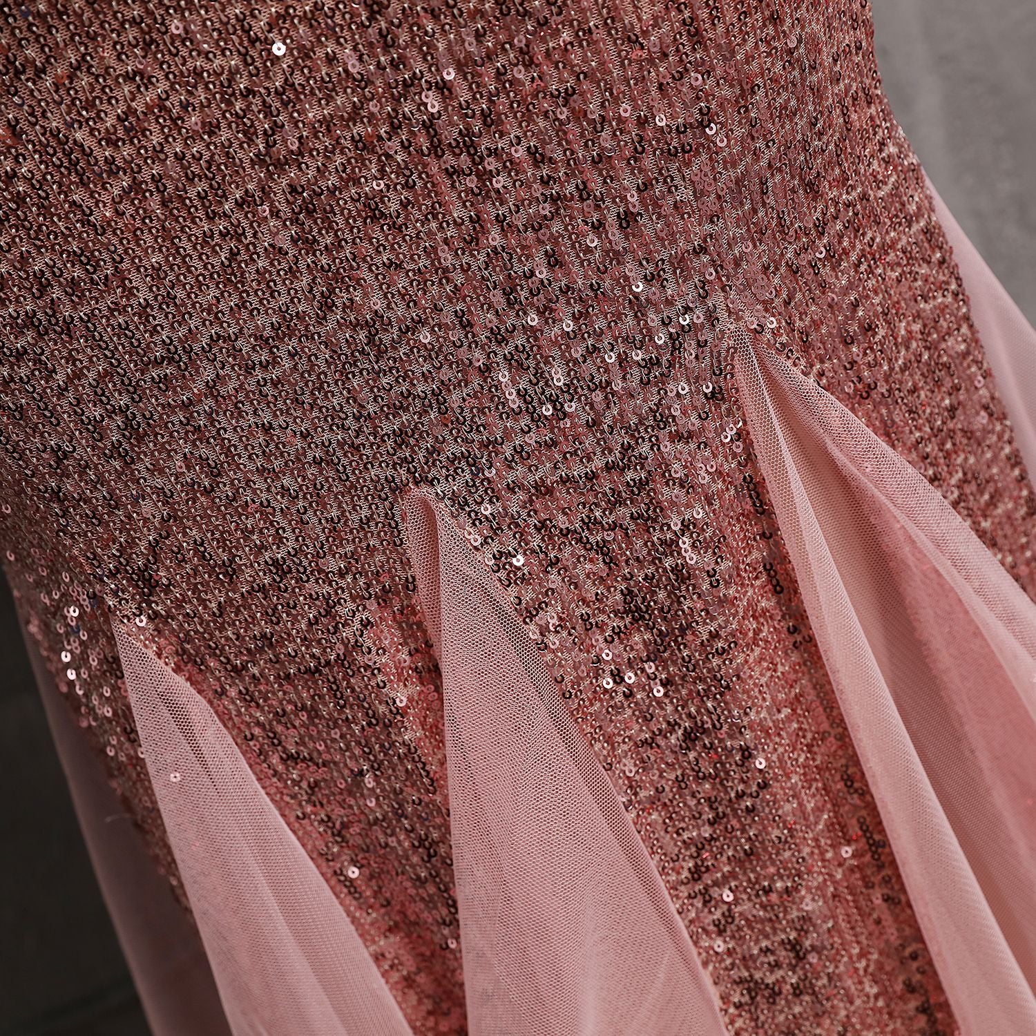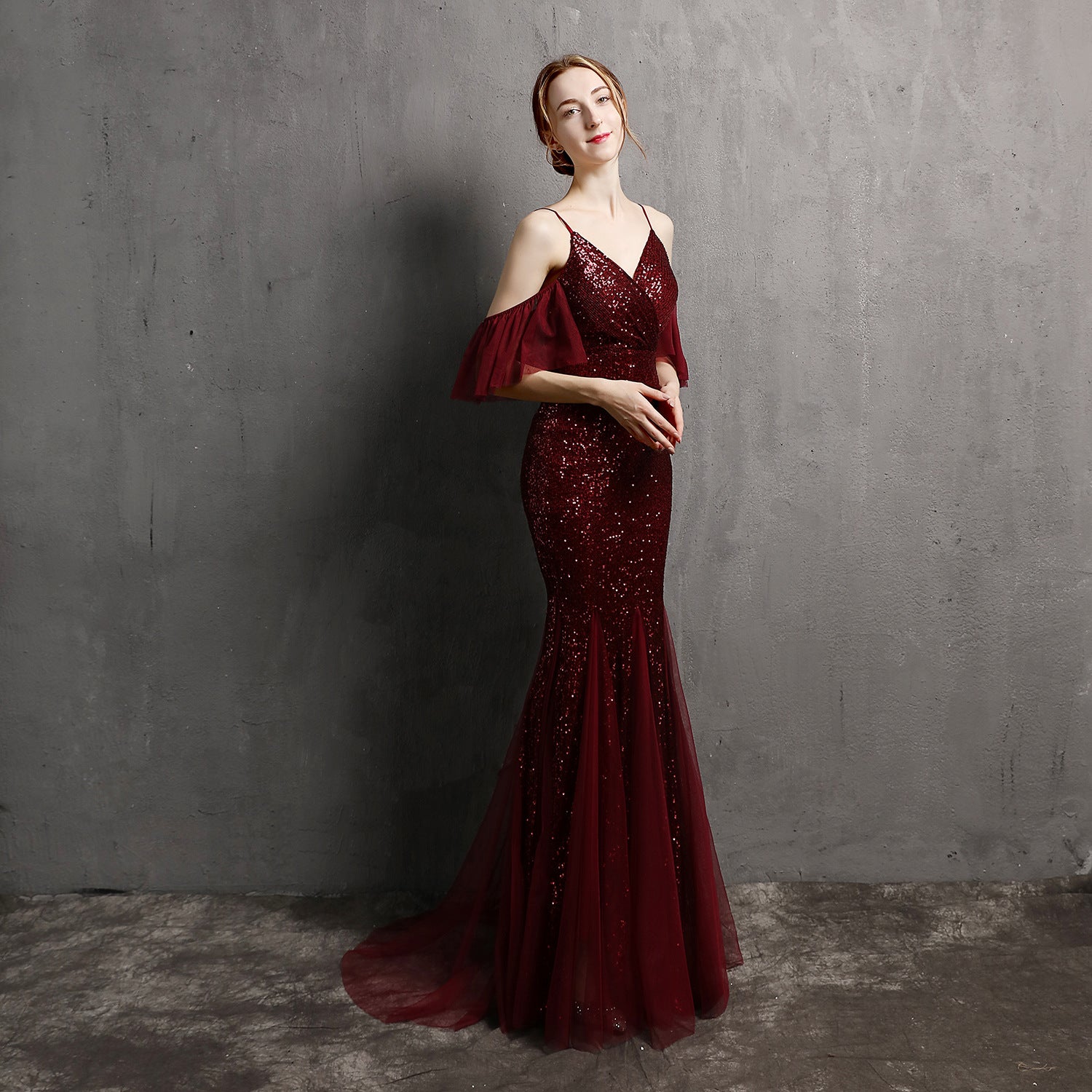 An elegant sequin maxi with a slim silhouette. The V-neckline and fishtail detail are accented by sequins for subtle shine.