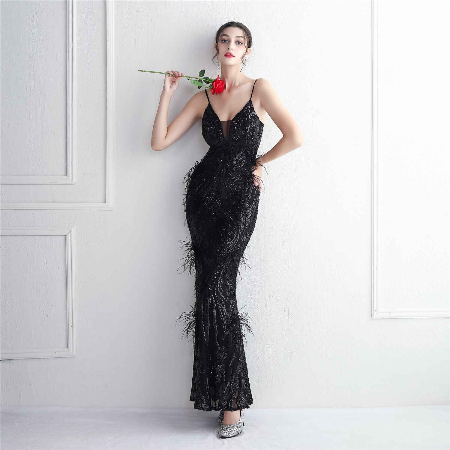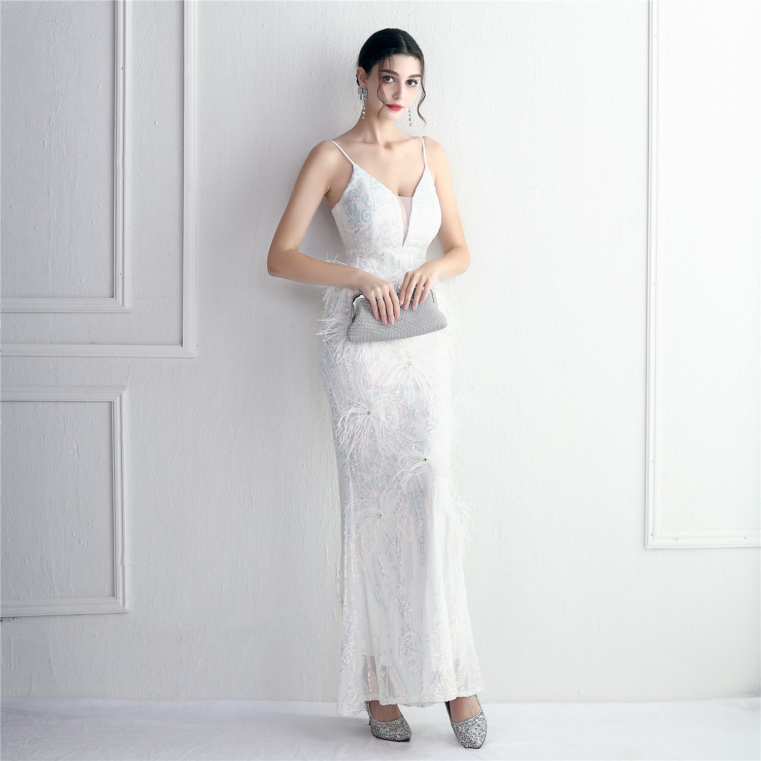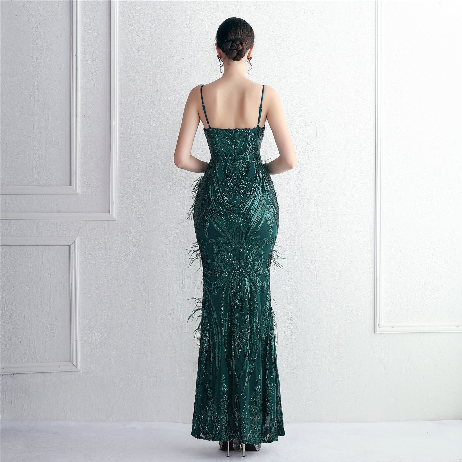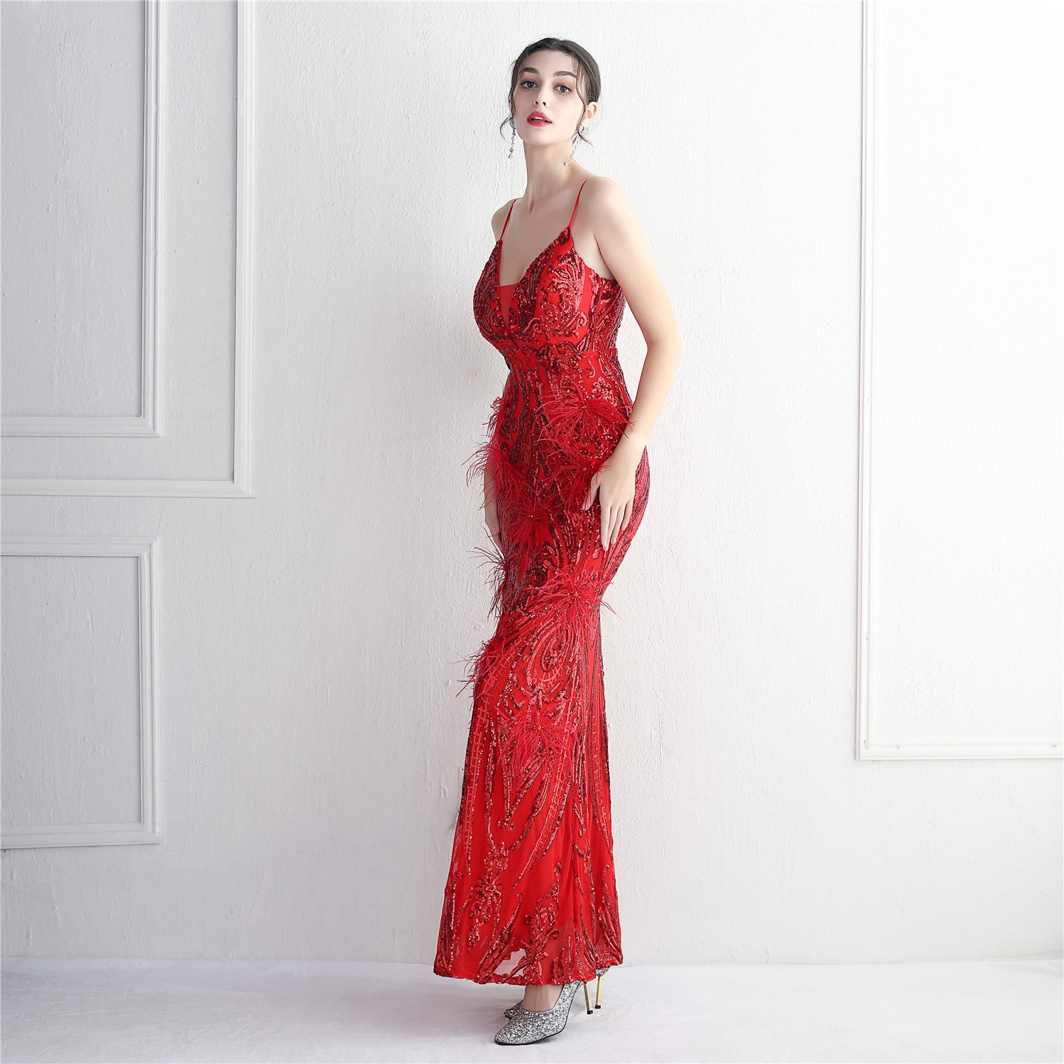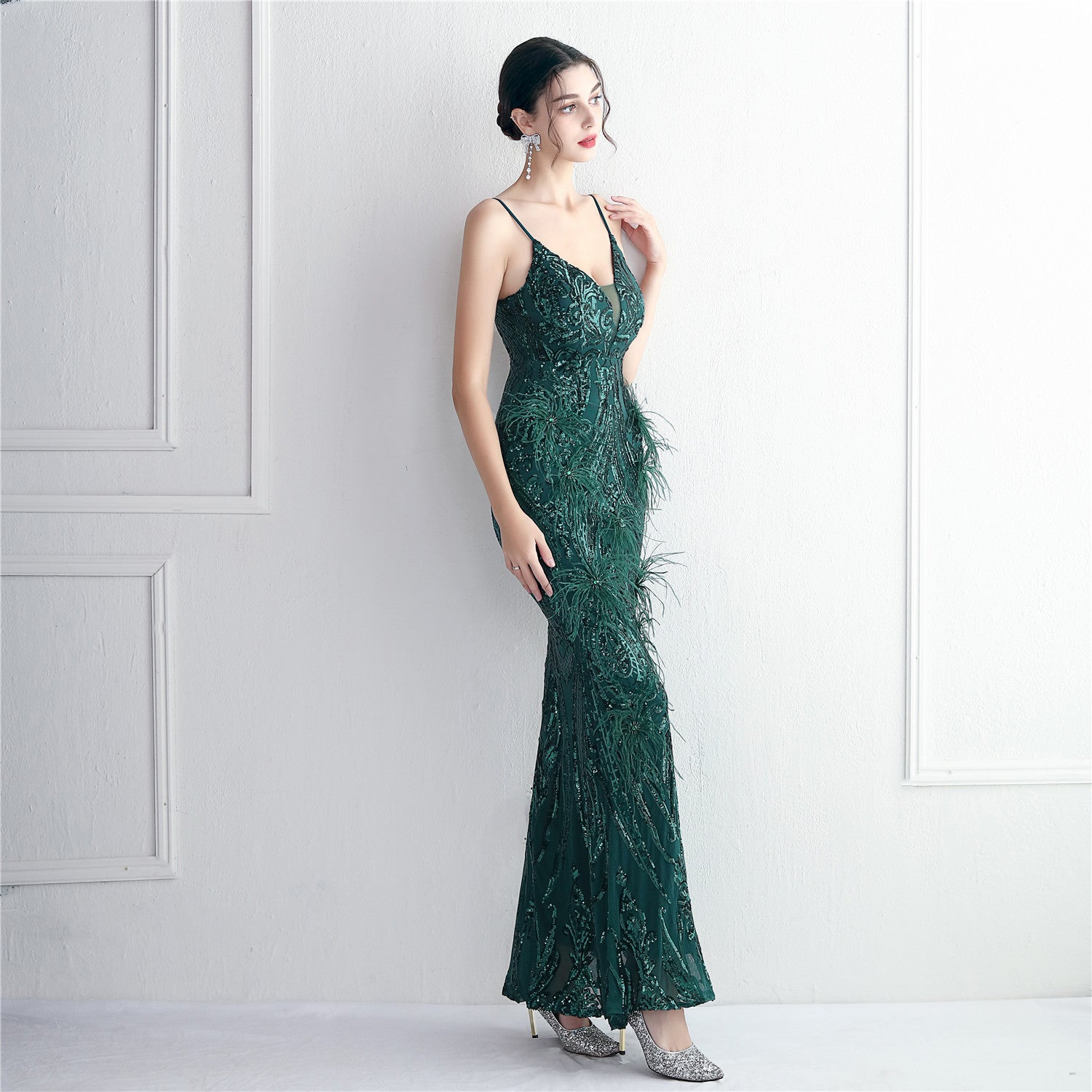 A slim, fishtail maxi forms a streamlined silhouette. A V-neck and refined embellishments—sequins, beads, feather accents and lace/tulle details—complete the look.