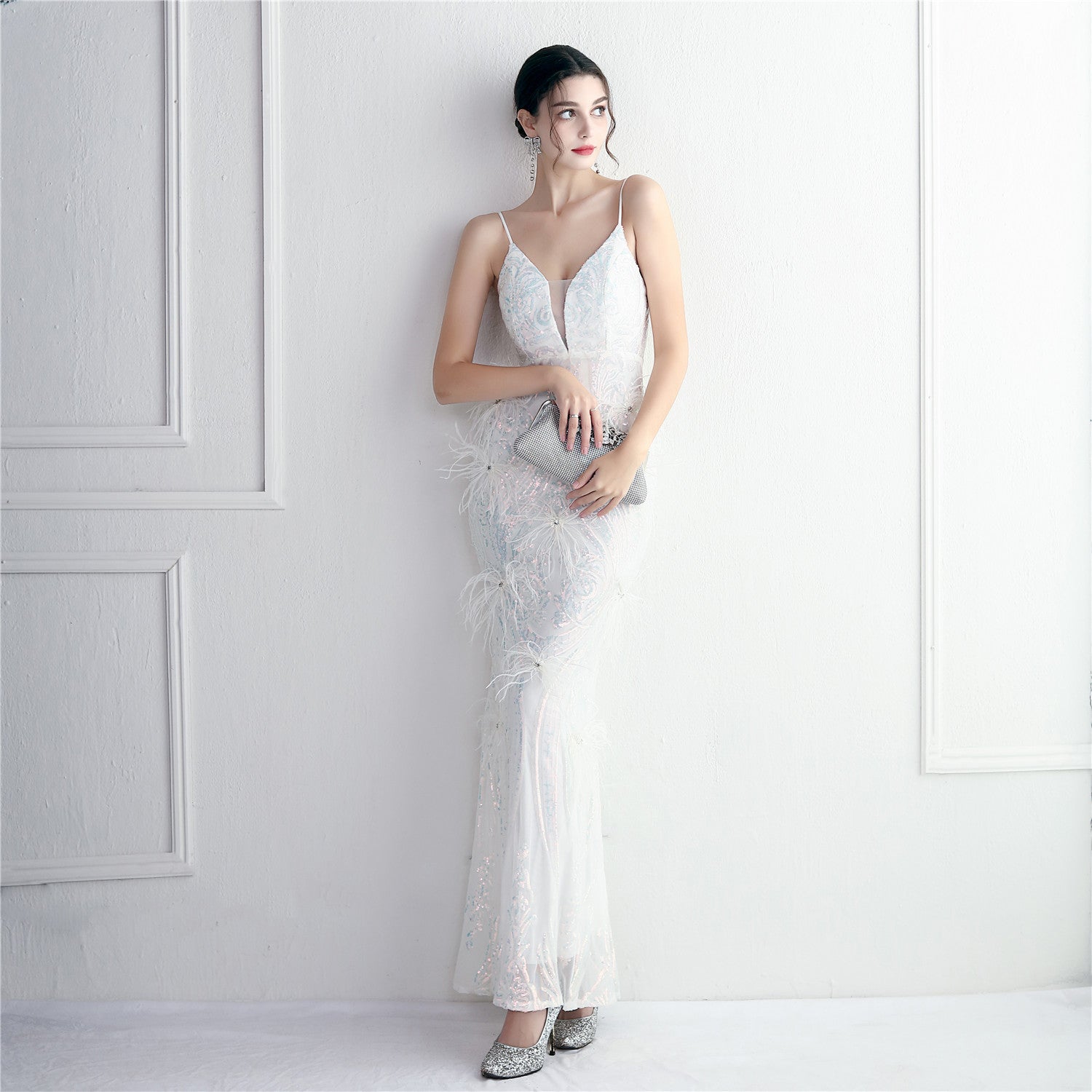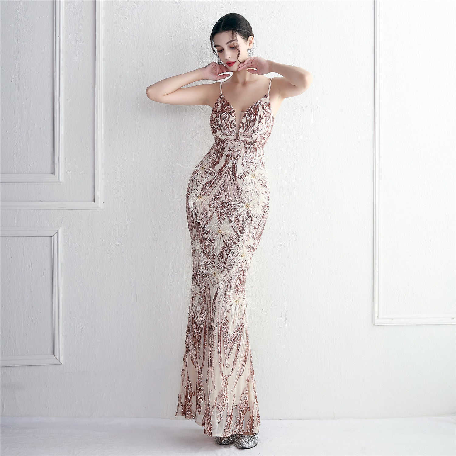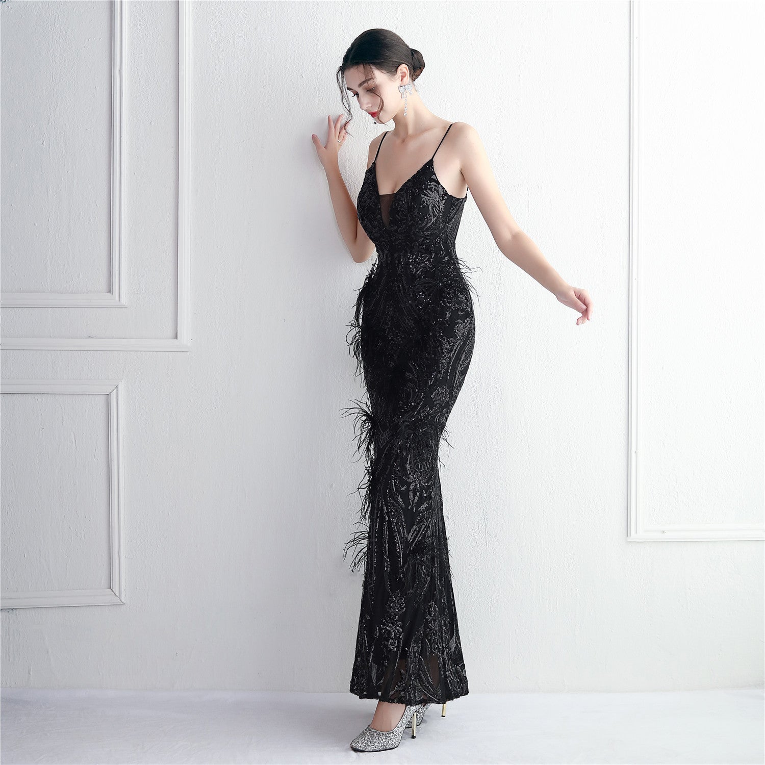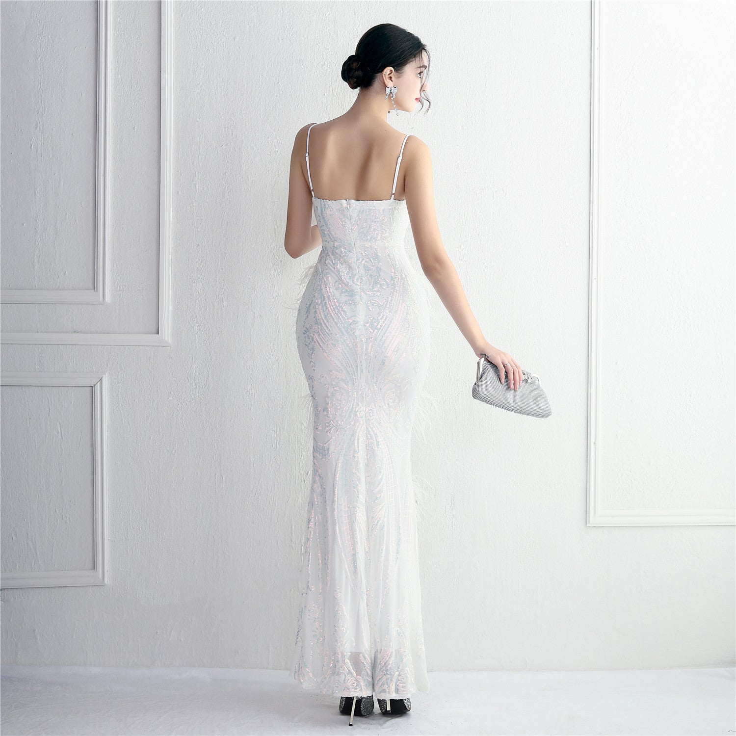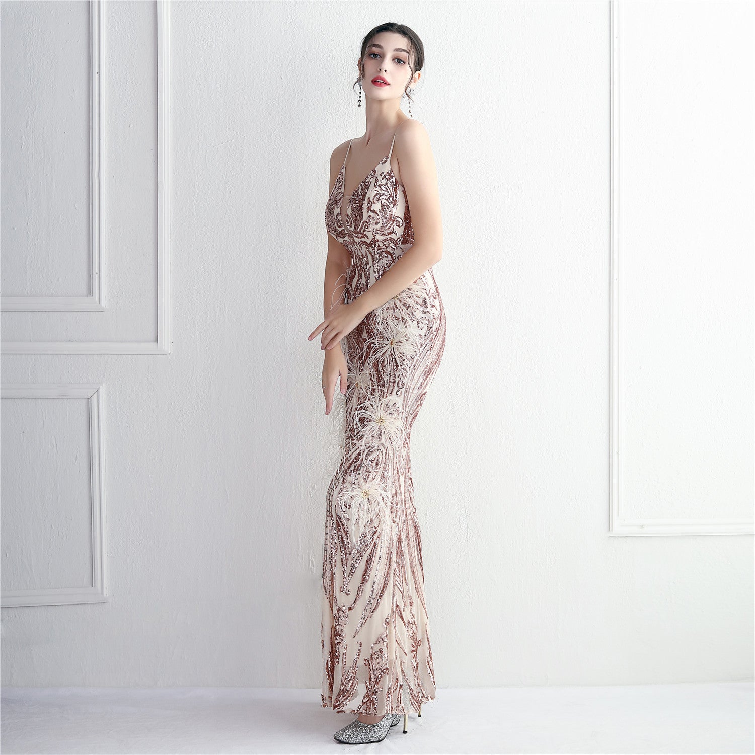 A slim, fishtail maxi forms a streamlined silhouette. A V-neck and refined embellishments—sequins, beads, feather accents and lace/tulle details—complete the look.