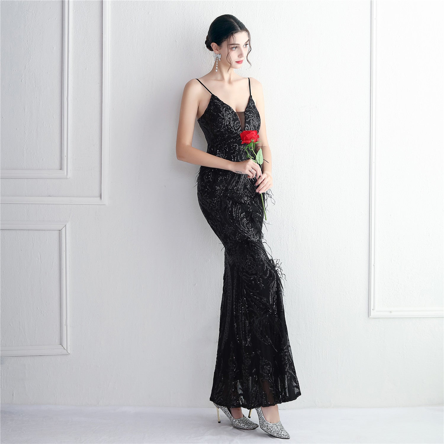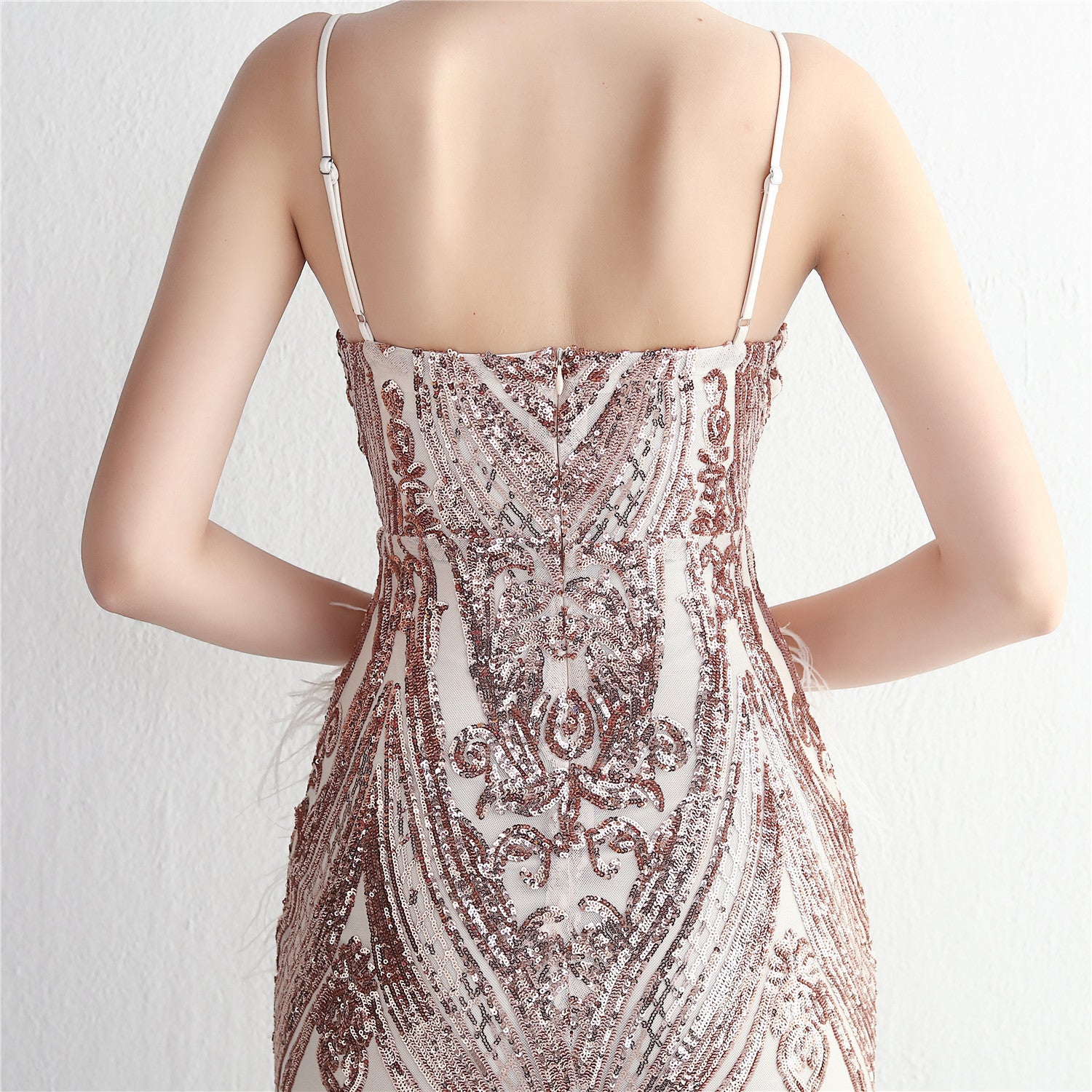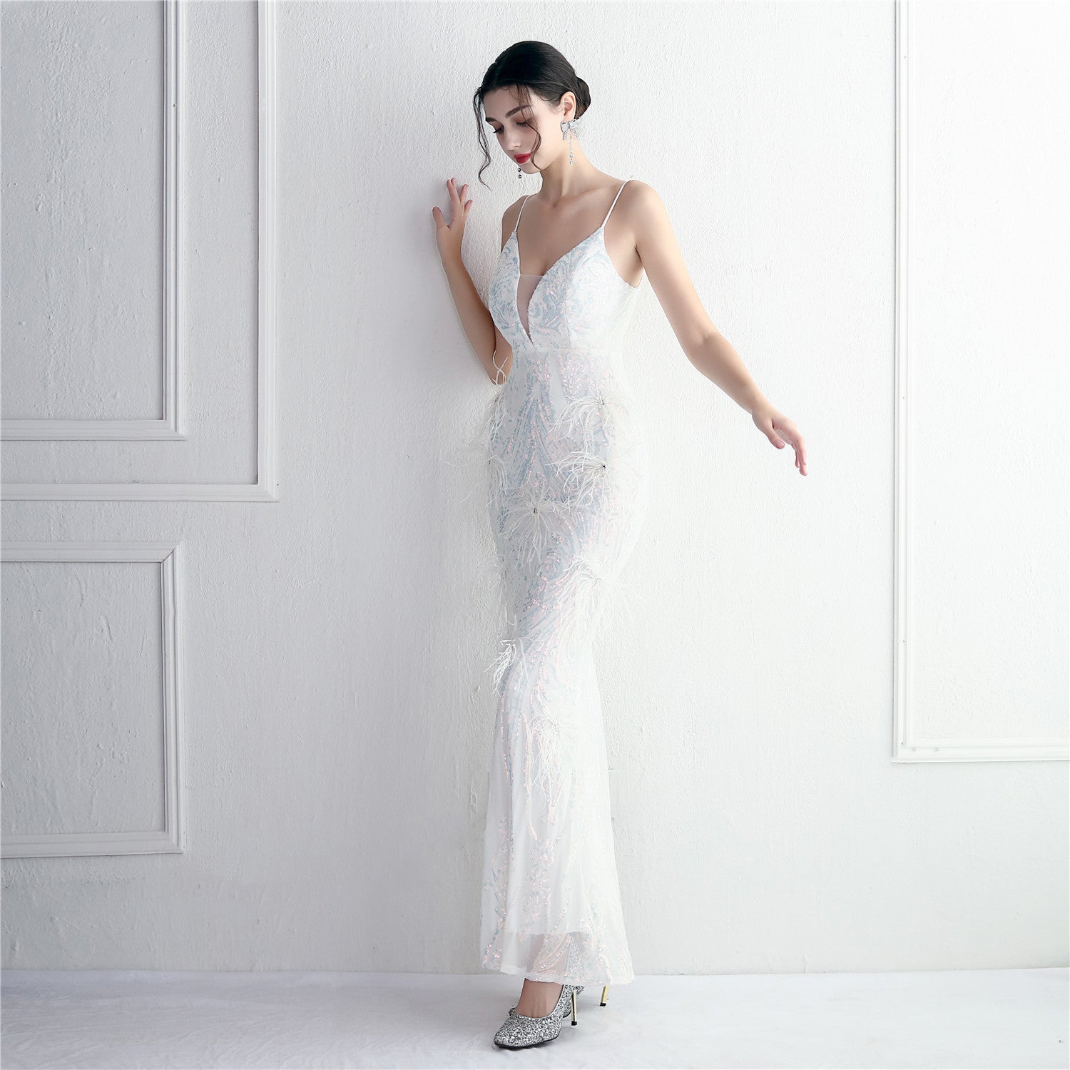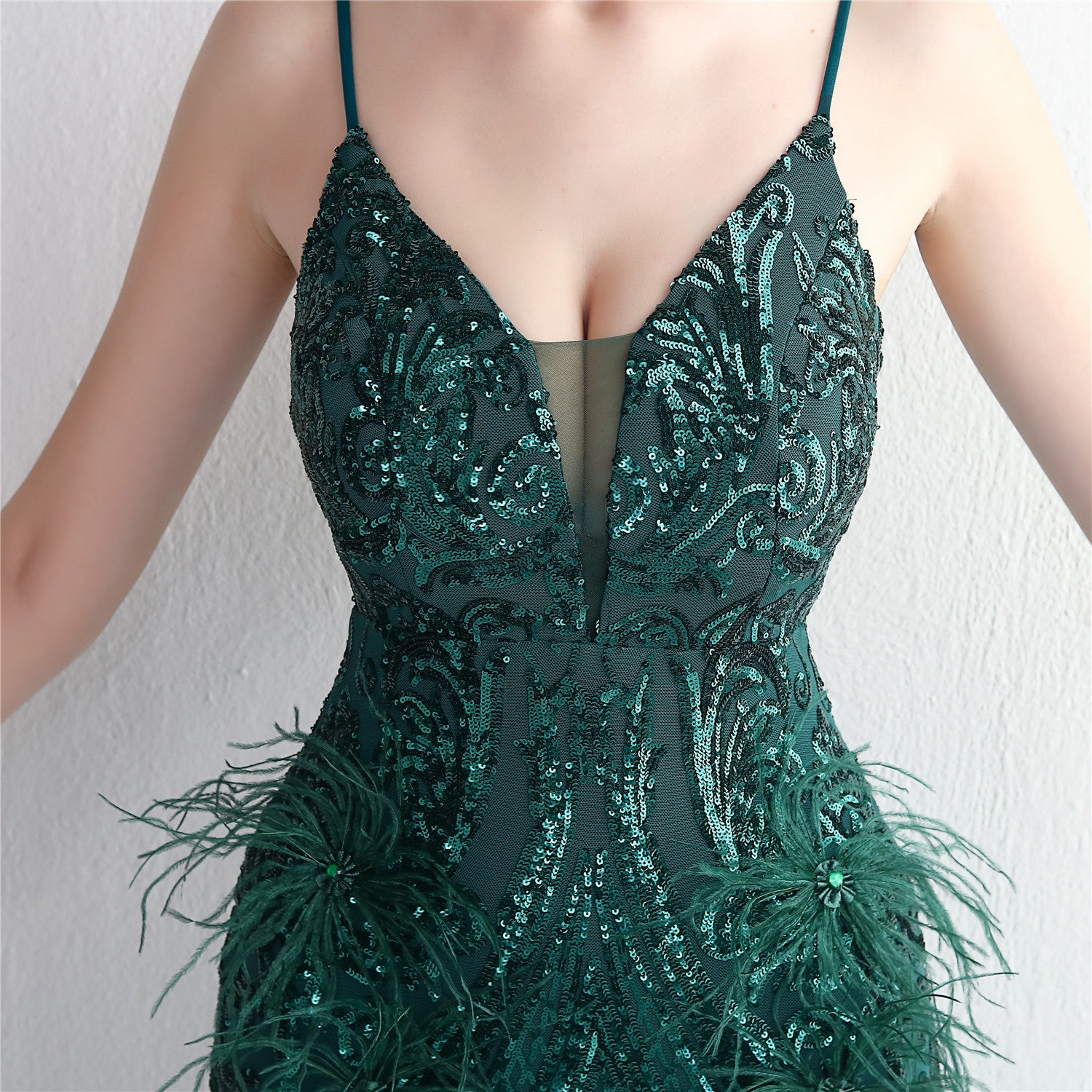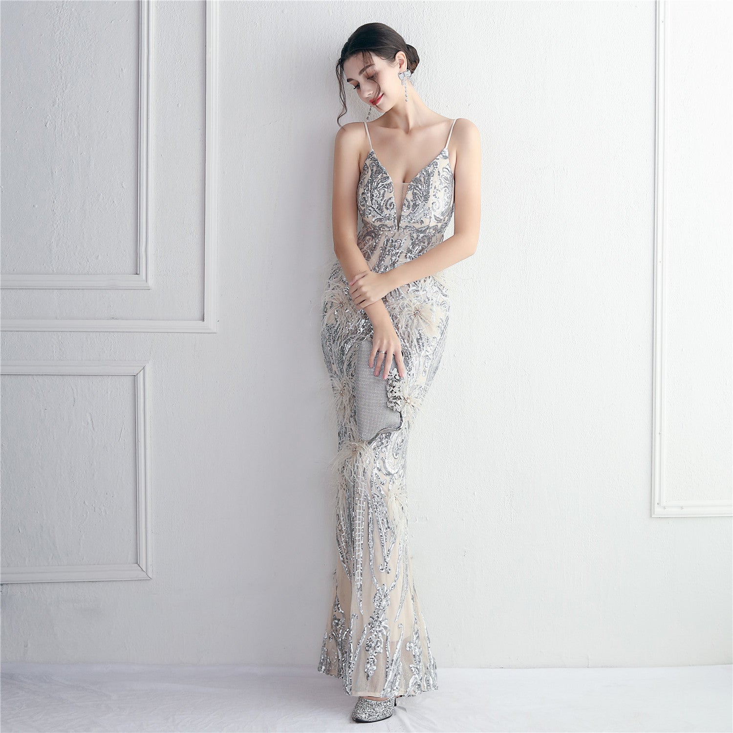 A slim, fishtail maxi forms a streamlined silhouette. A V-neck and refined embellishments—sequins, beads, feather accents and lace/tulle details—complete the look.