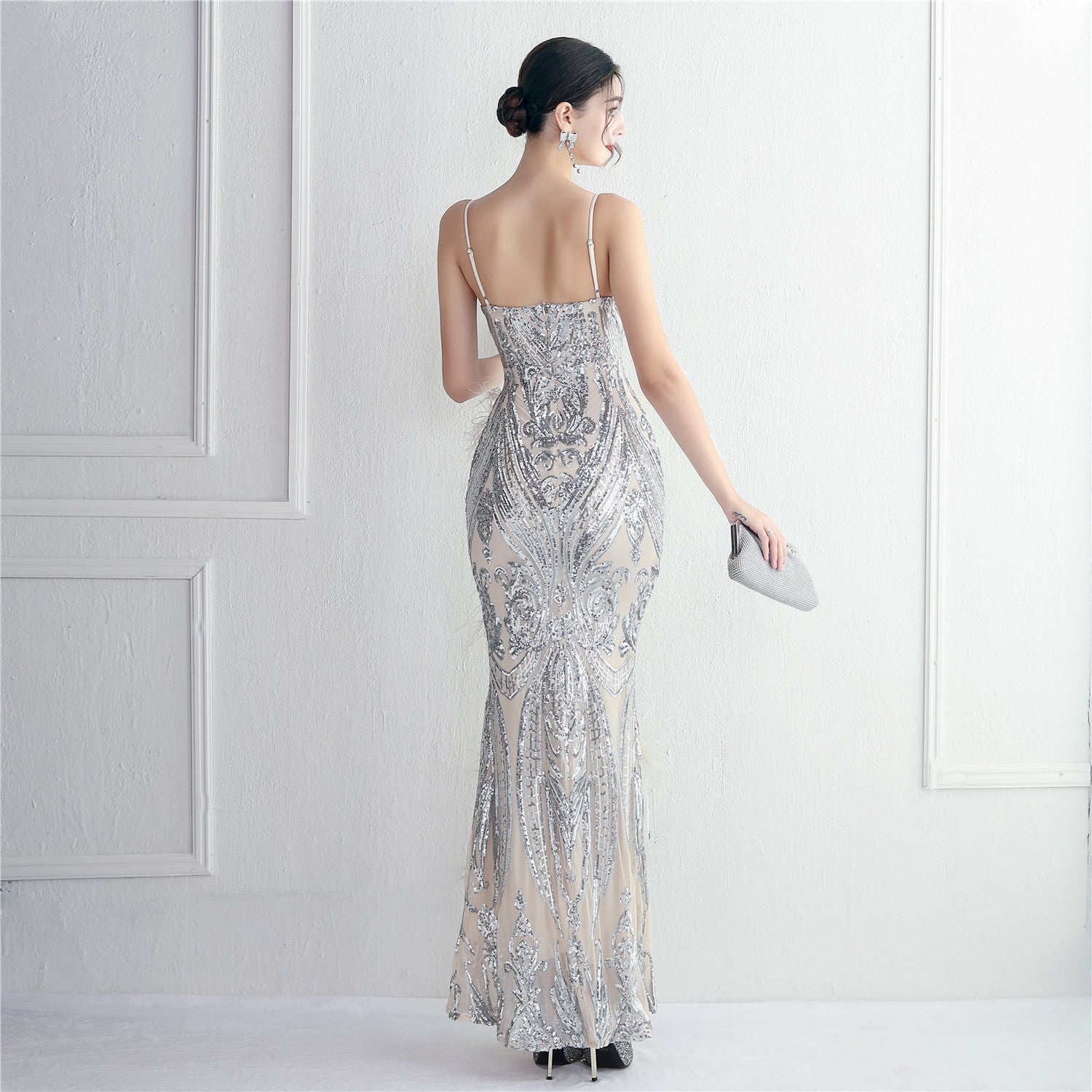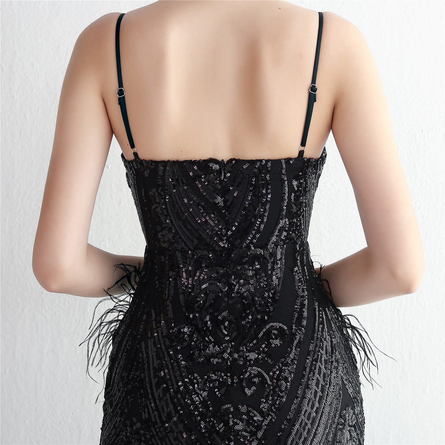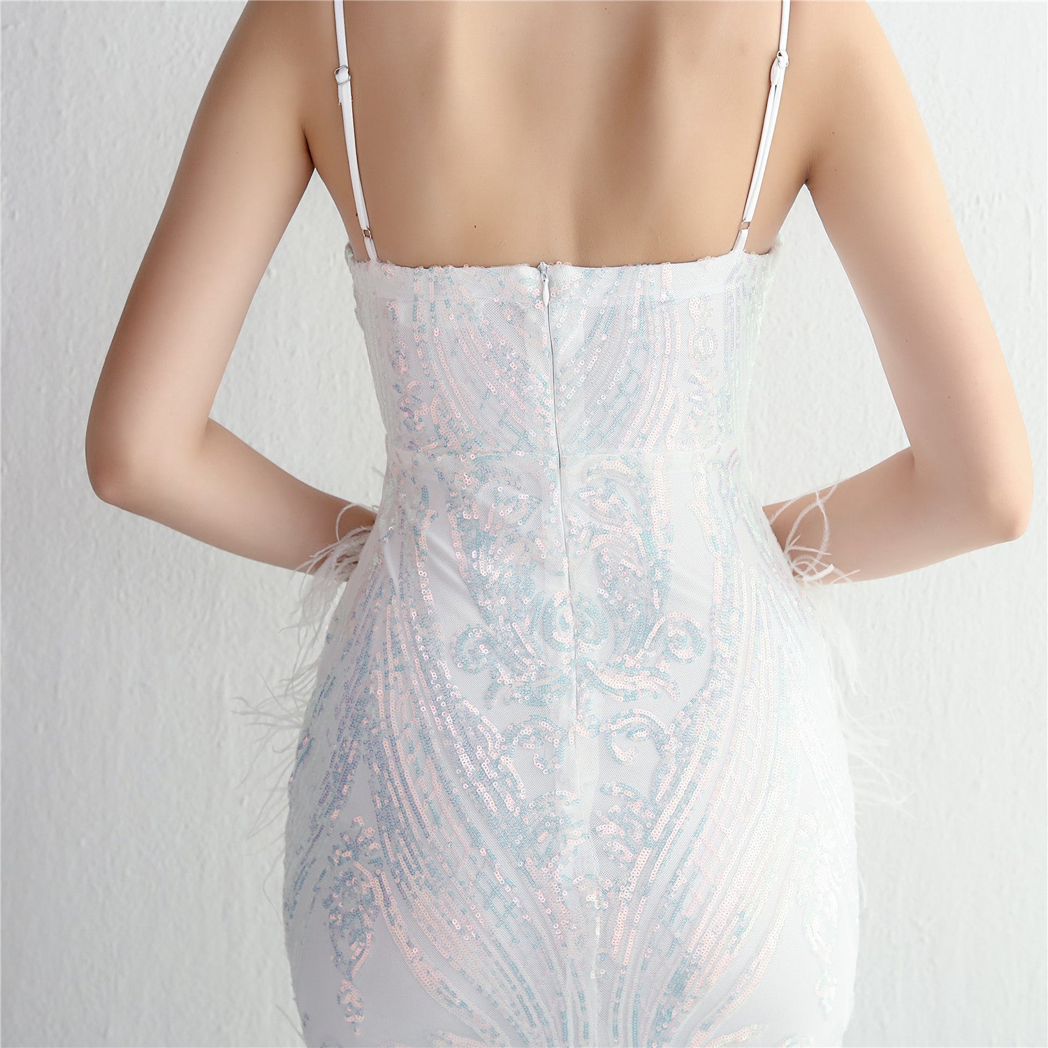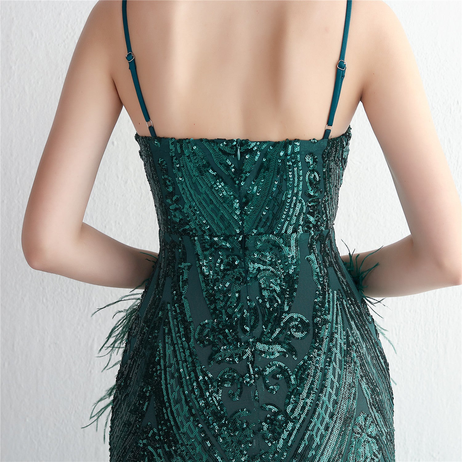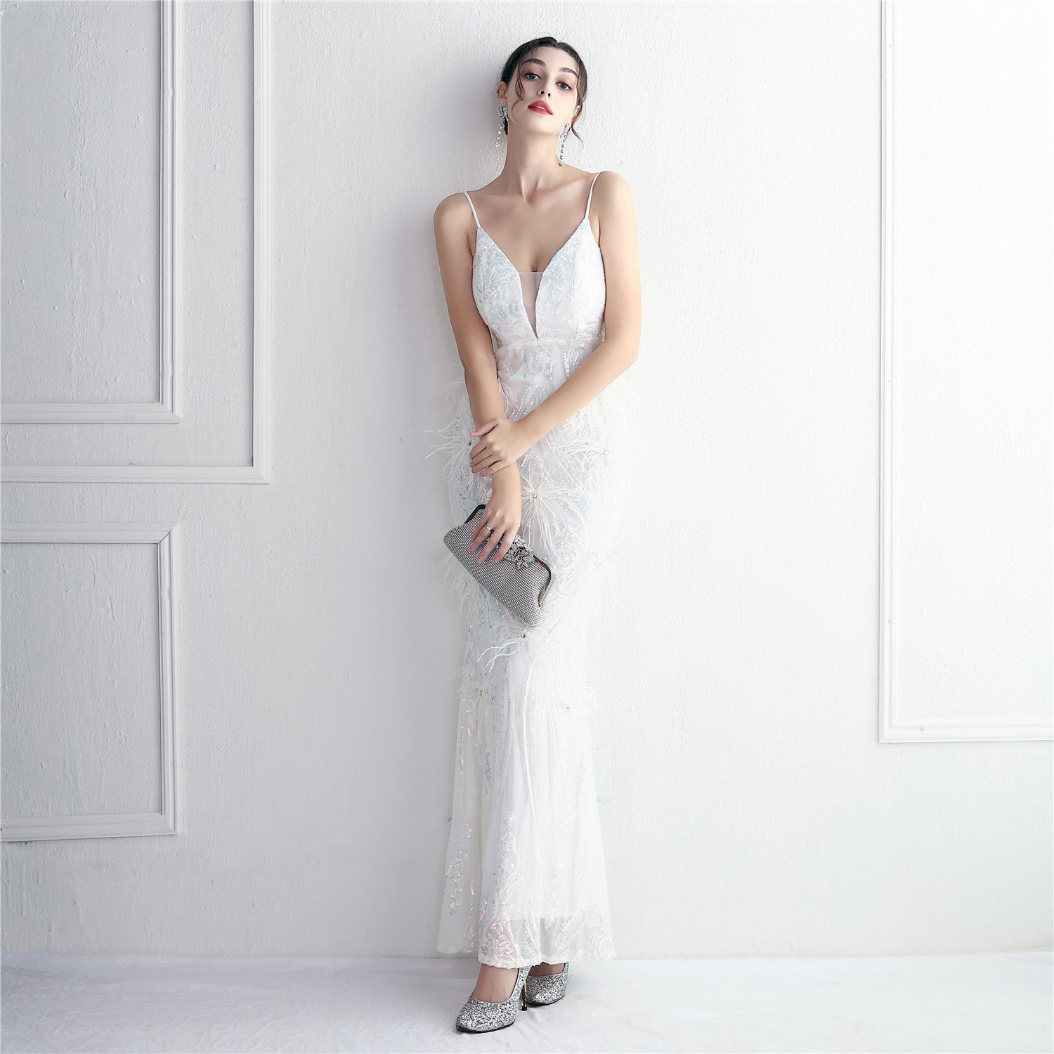 A slim, fishtail maxi forms a streamlined silhouette. A V-neck and refined embellishments—sequins, beads, feather accents and lace/tulle details—complete the look.