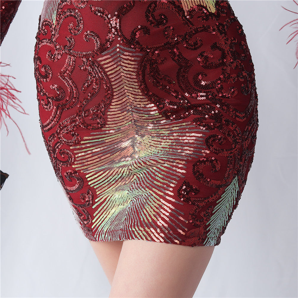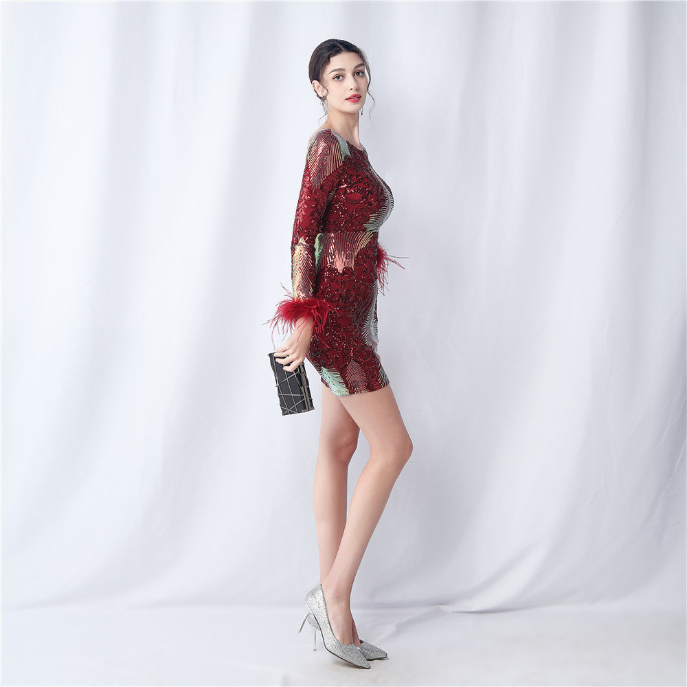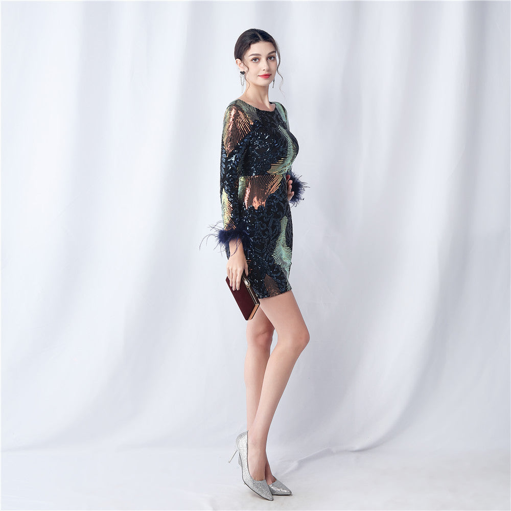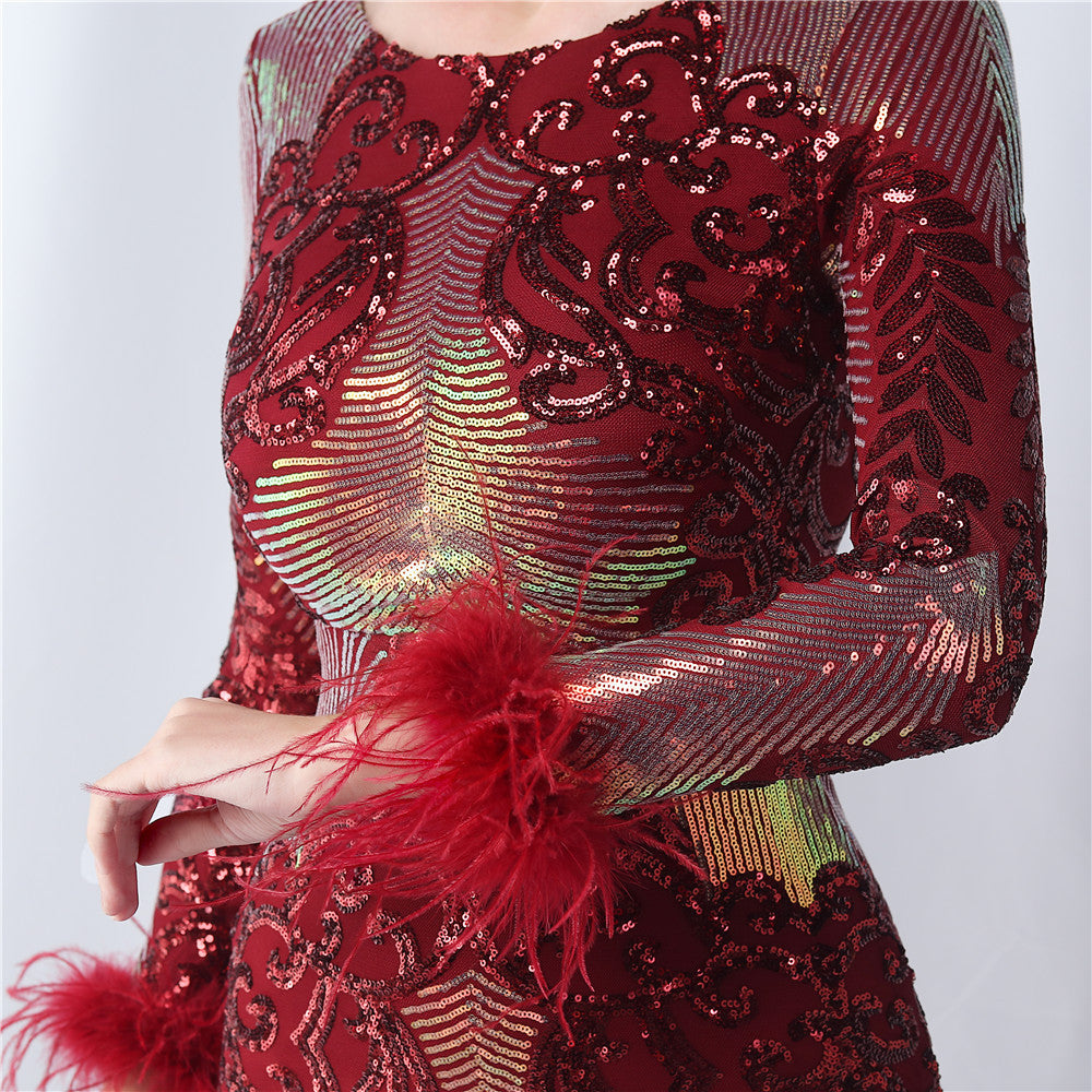 An evening-ready dress with a clean, bodycon silhouette. The crew neck, long sleeves, and sequin detailing are finished with feather accents and a discreet zipper.