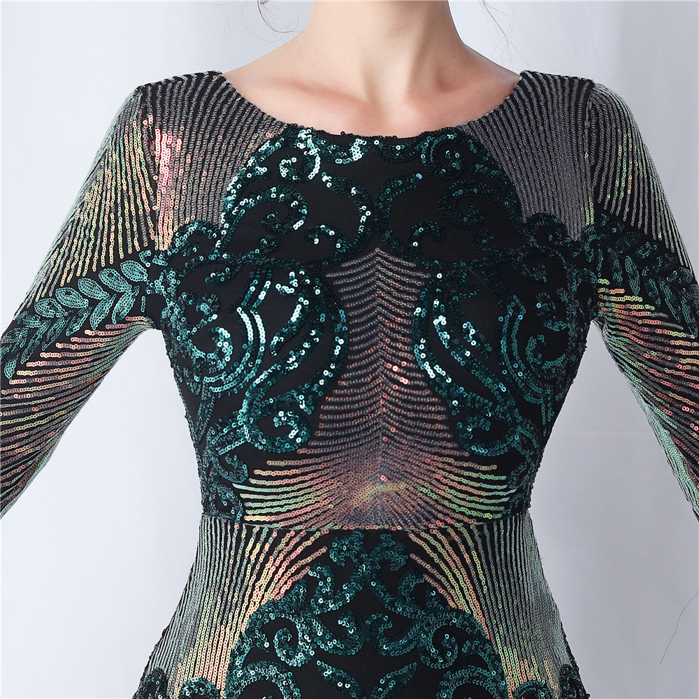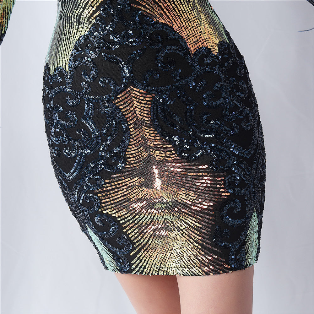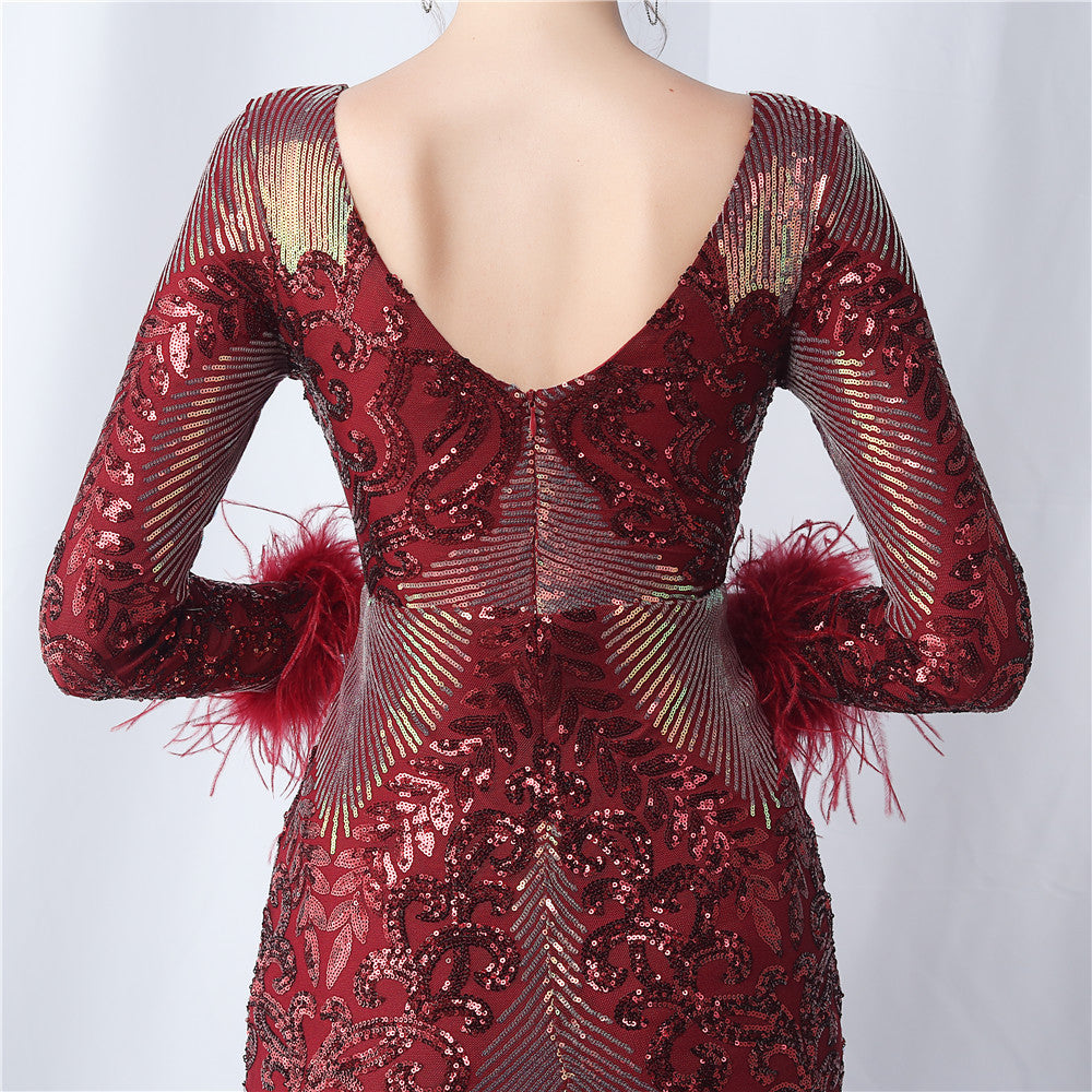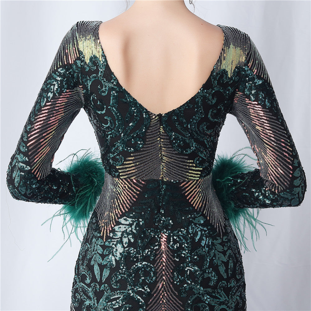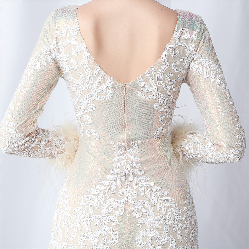 An evening-ready dress with a clean, bodycon silhouette. The crew neck, long sleeves, and sequin detailing are finished with feather accents and a discreet zipper.