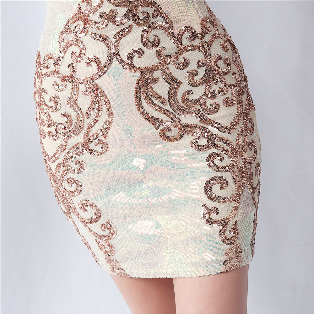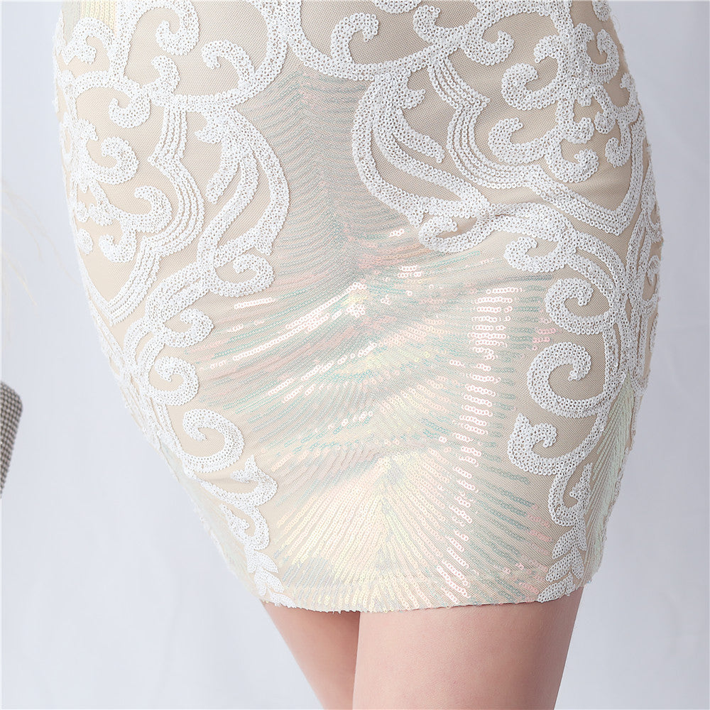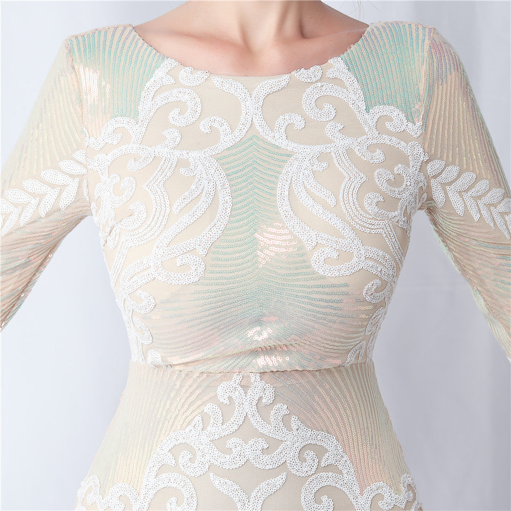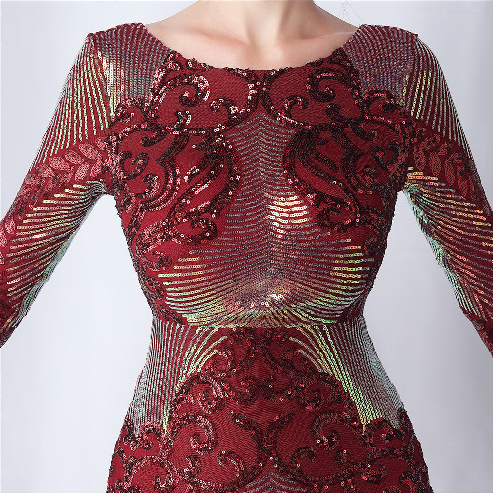 An evening-ready dress with a clean, bodycon silhouette. The crew neck, long sleeves, and sequin detailing are finished with feather accents and a discreet zipper.