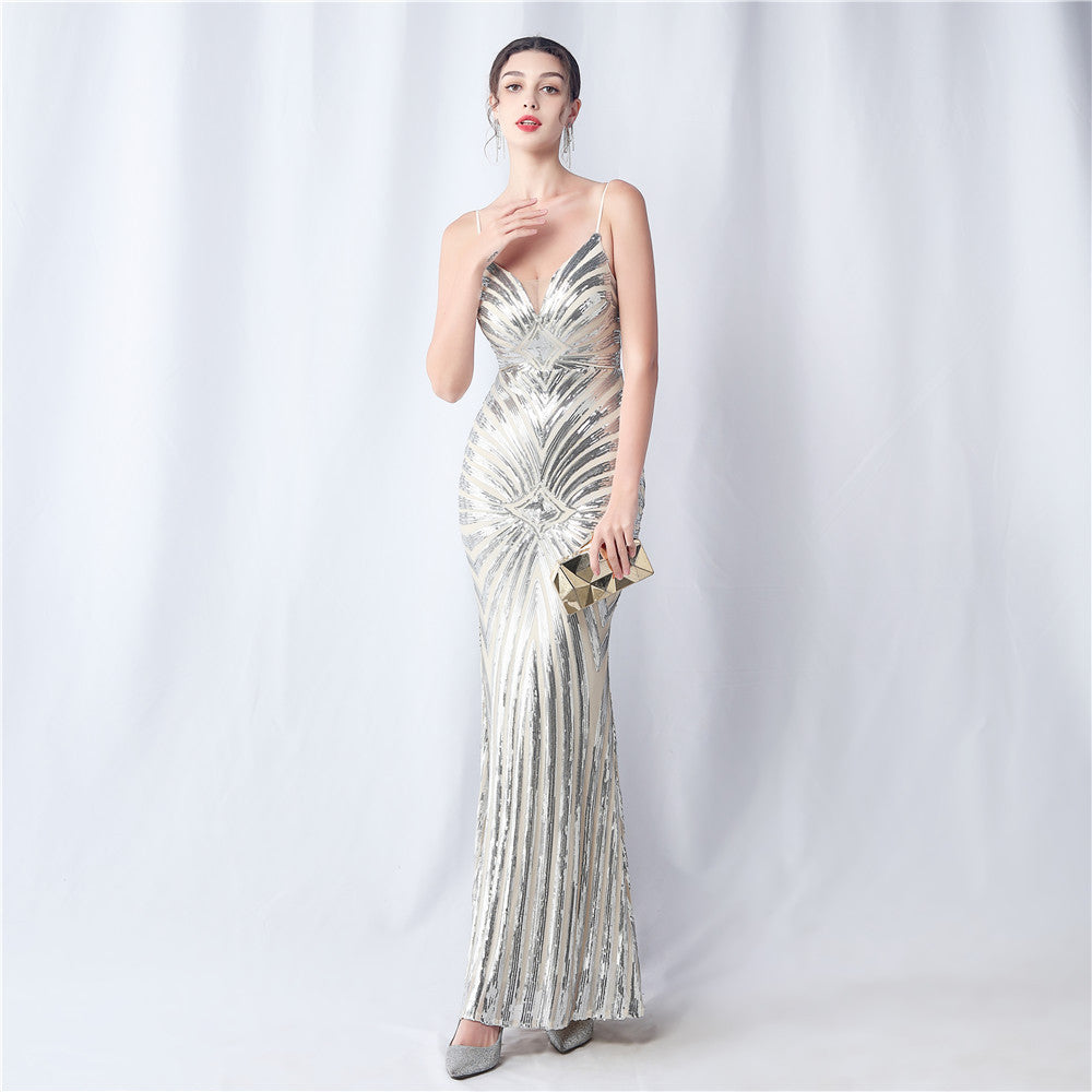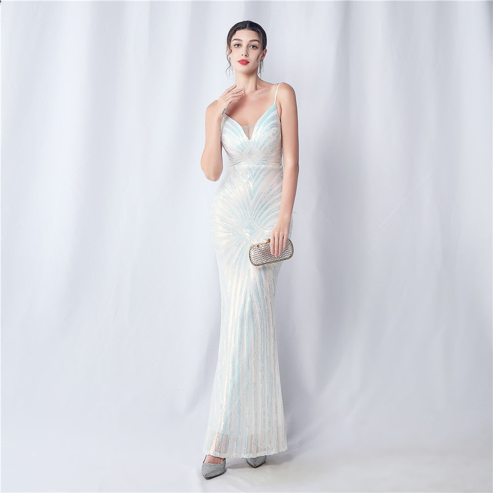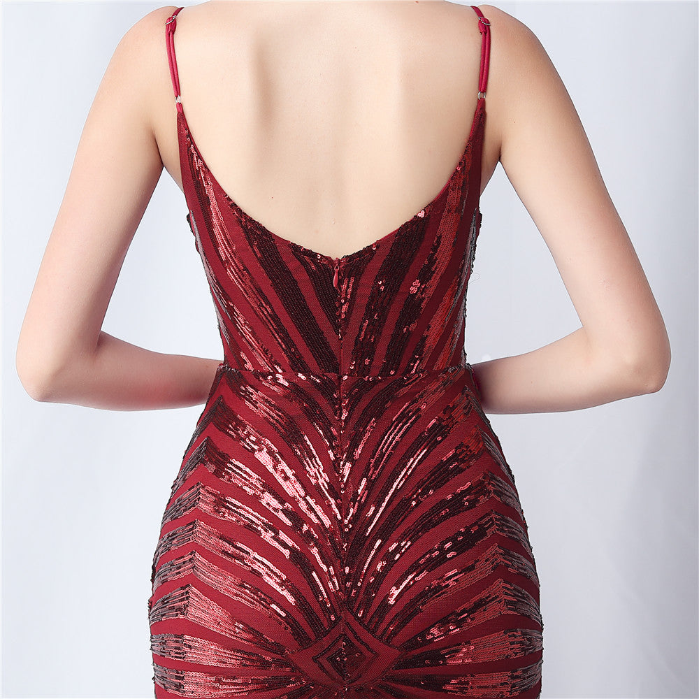 An elegant sleeveless maxi with a slim silhouette. The V-neckline pairs with sequins for a subtle, refined touch.