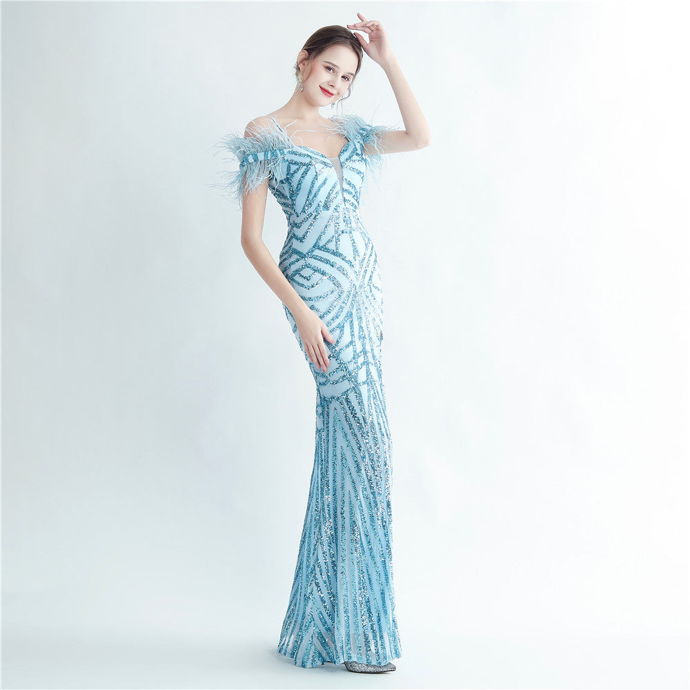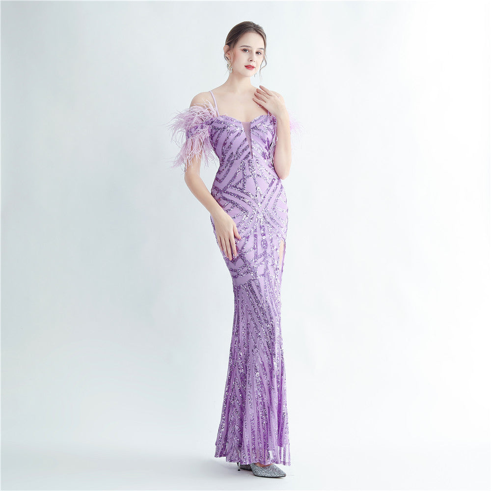 A sleek maxi dress with a slim silhouette. The V-neckline frames the bodice, while ostrich feather detailing and sequin accents highlight the split, finished with a concealed zipper.