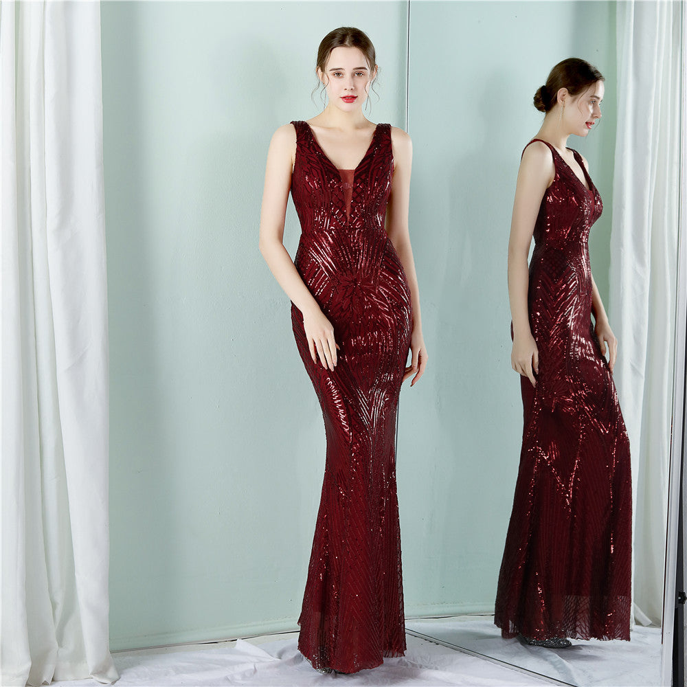The dress presents a sleeveless maxi silhouette with a slim, bodycon fit. A V-neckline with sequins accents the front, finishing in a fishtail hem.