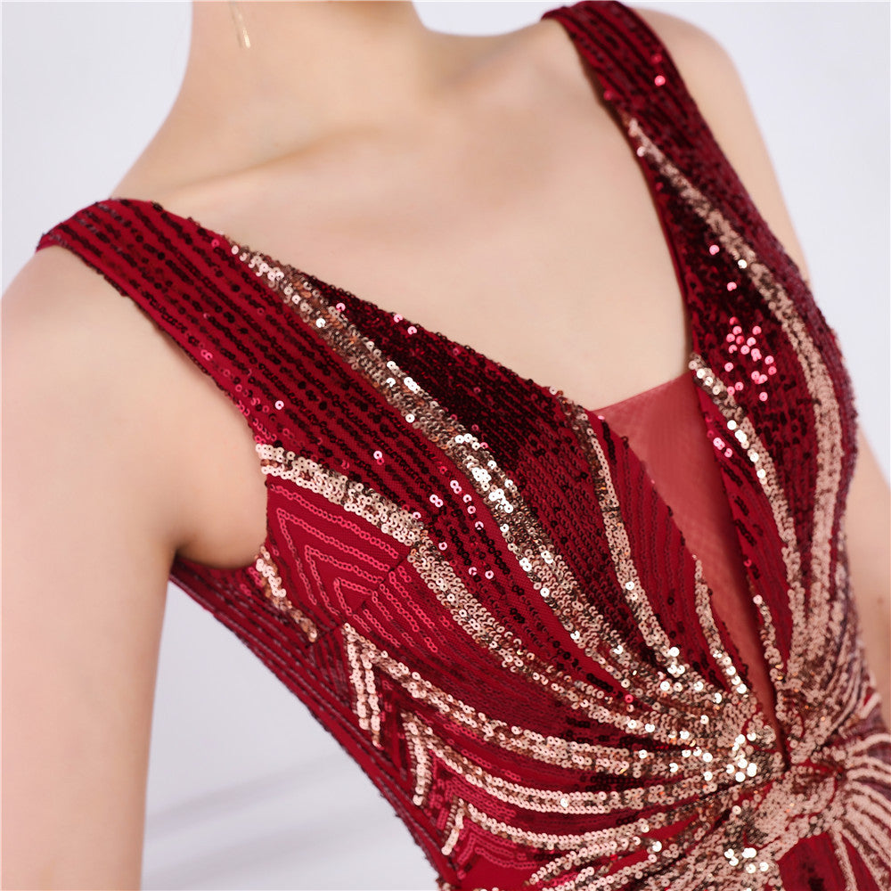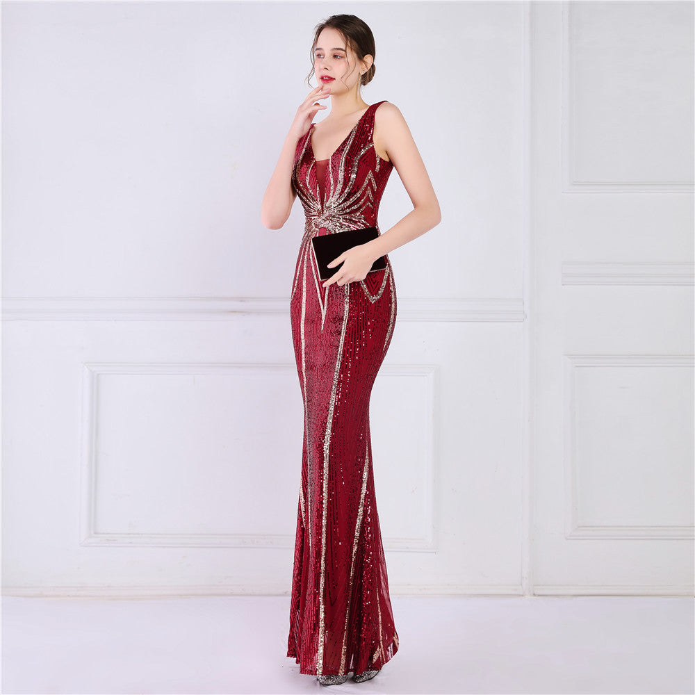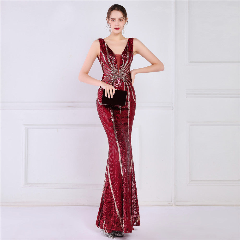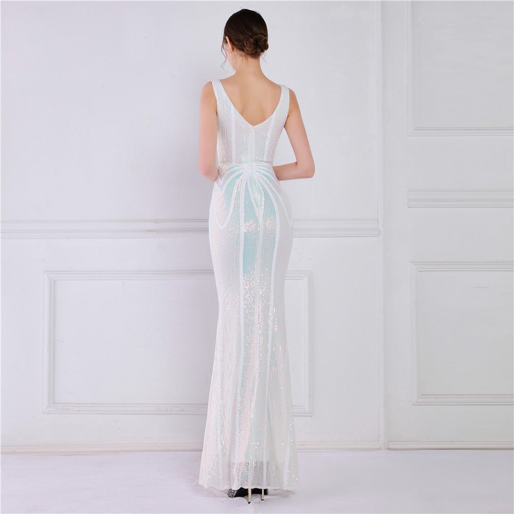 A sequined V-neck fishtail maxi dress in a slim silhouette. The sleeveless bodice features a V-neck and a subtle sequin embellishment.