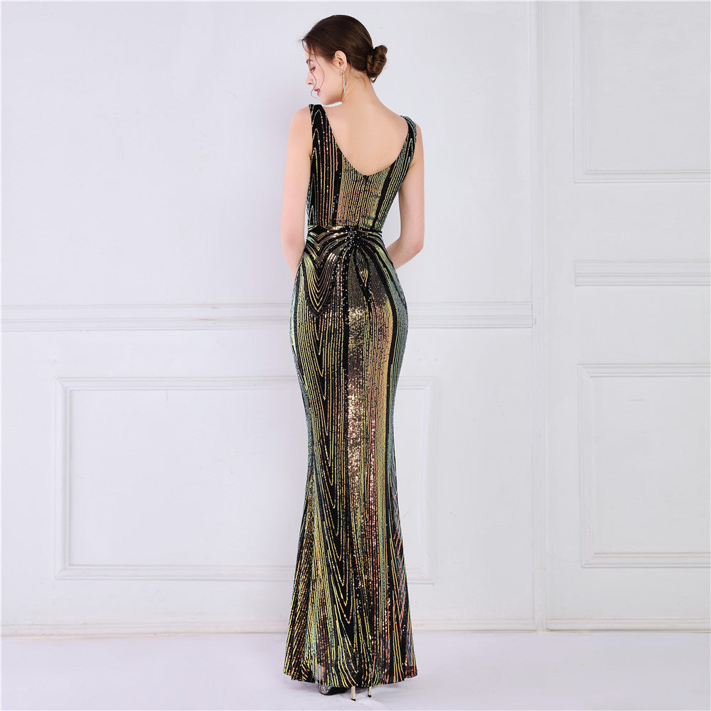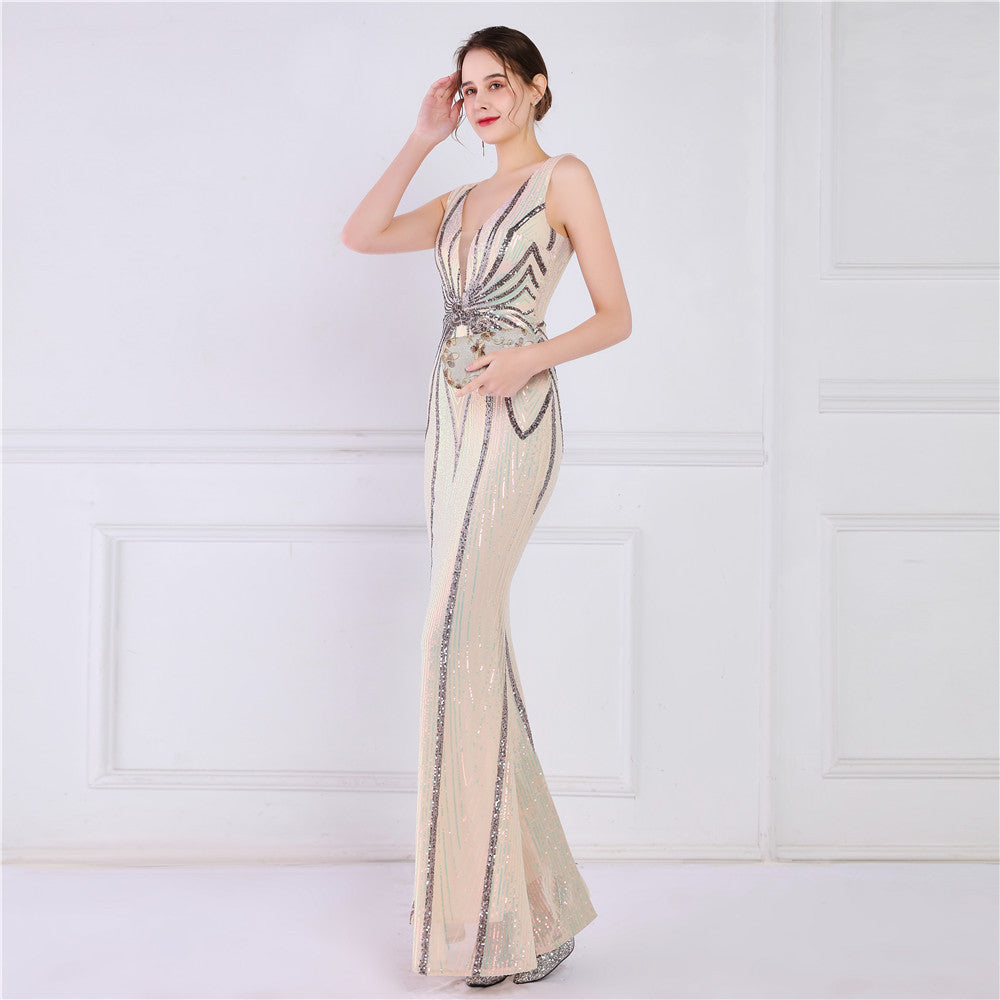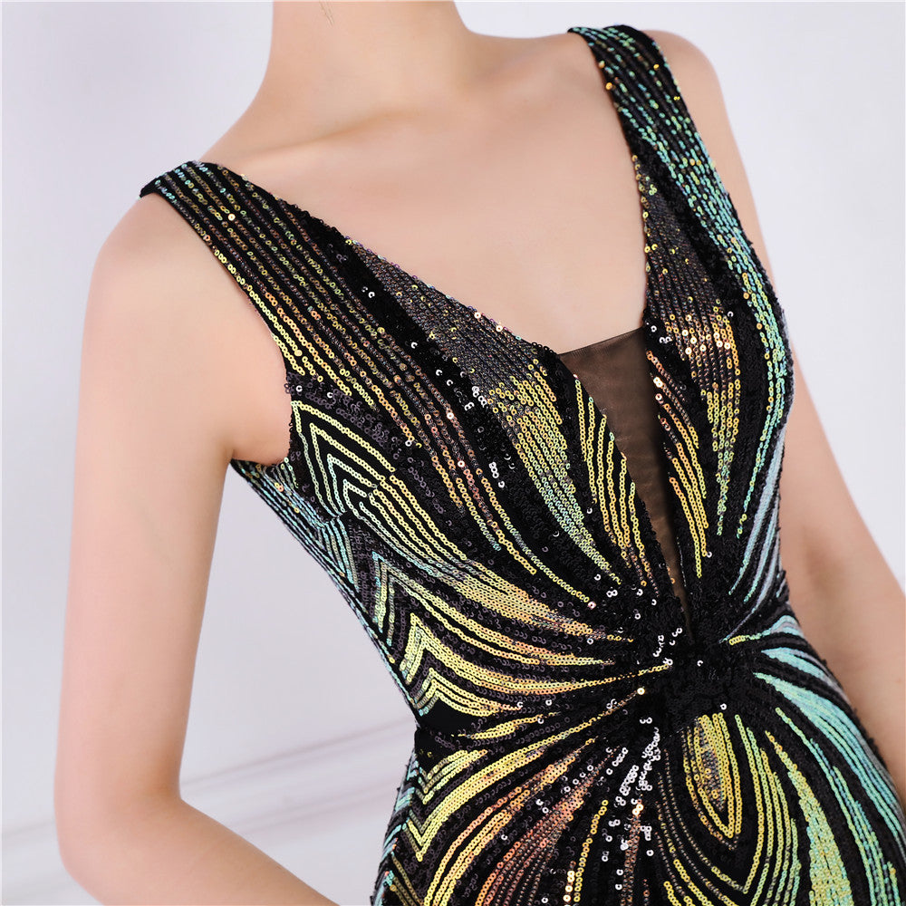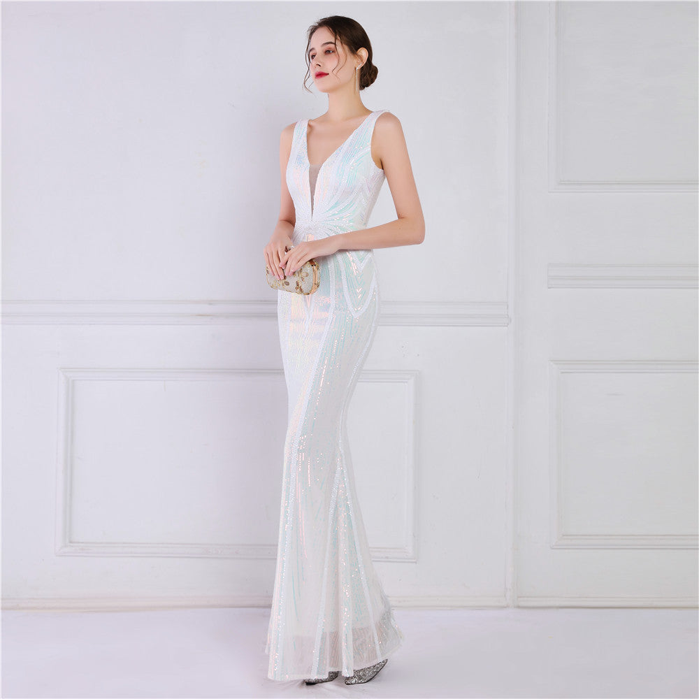 A sequined V-neck fishtail maxi dress in a slim silhouette. The sleeveless bodice features a V-neck and a subtle sequin embellishment.