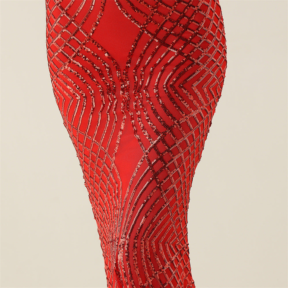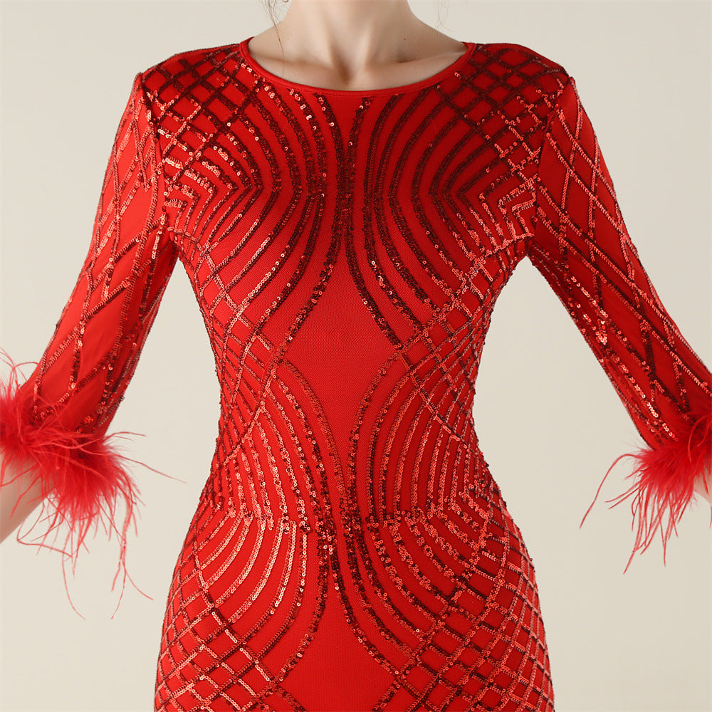 A sleek fishtail maxi with a slim silhouette. The crew neck and feathered sequin embellishments define the finish.