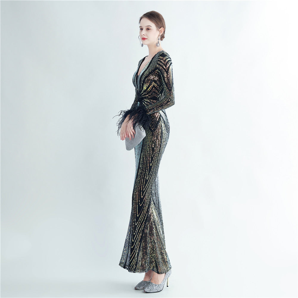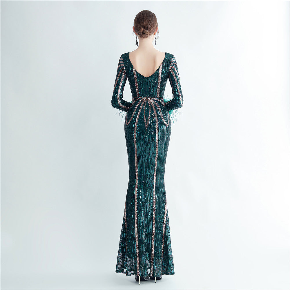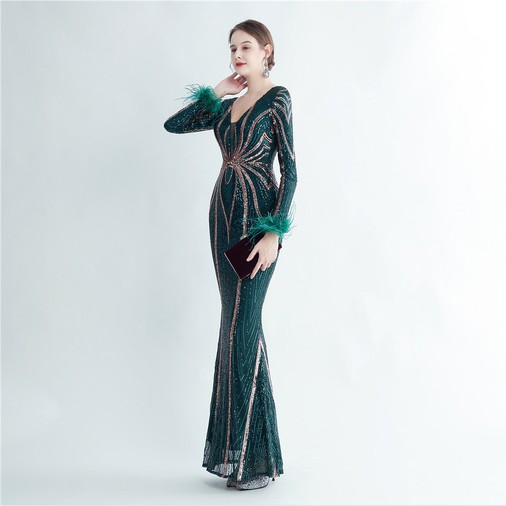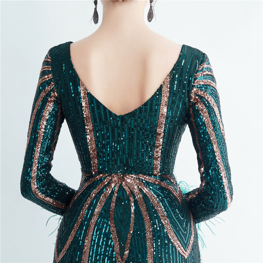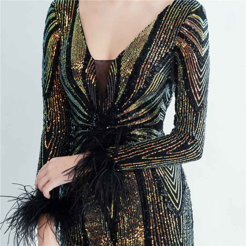 An elegant maxi with a slimming silhouette. A V-neckline frames feather and sequin embellishments, finished with a discreet zipper.