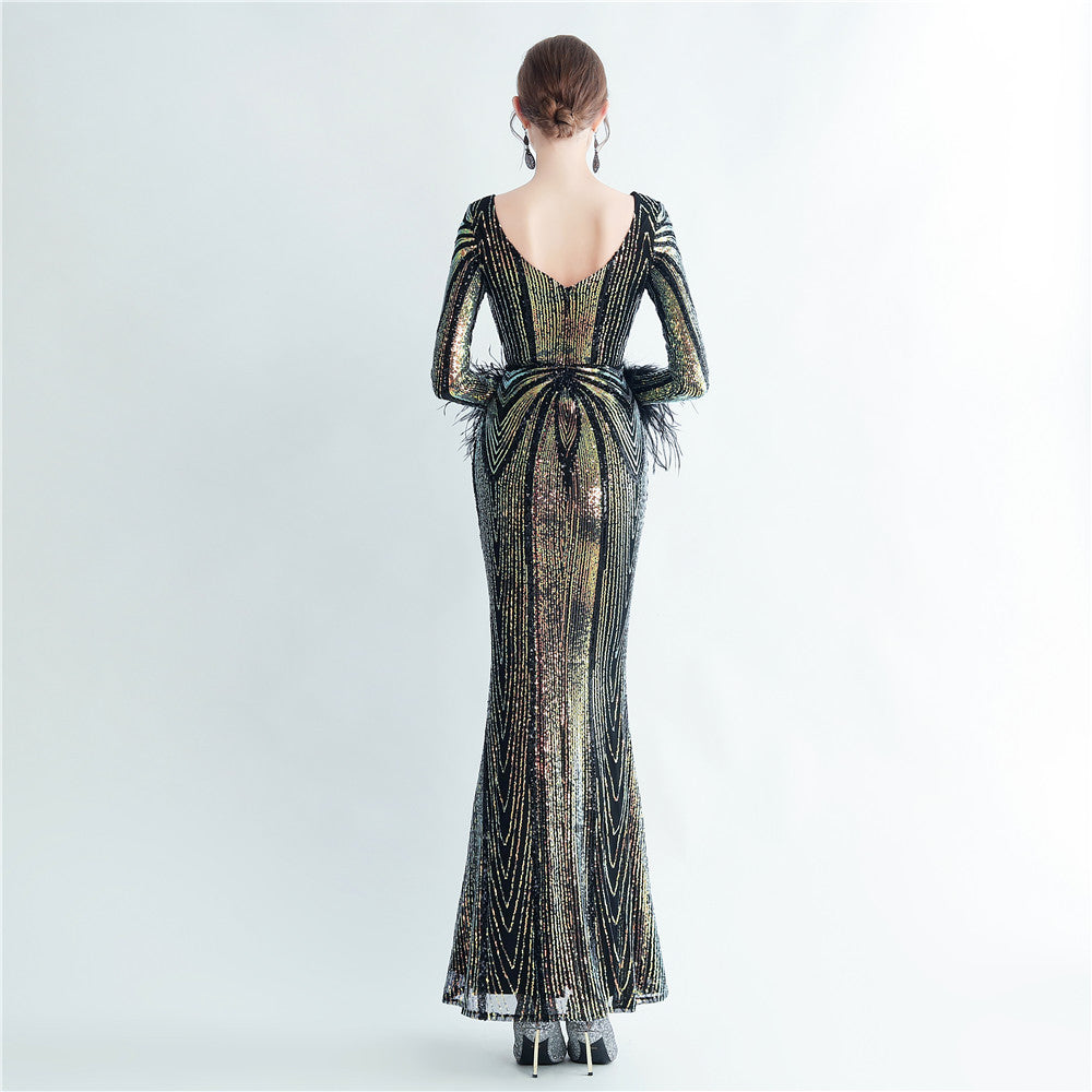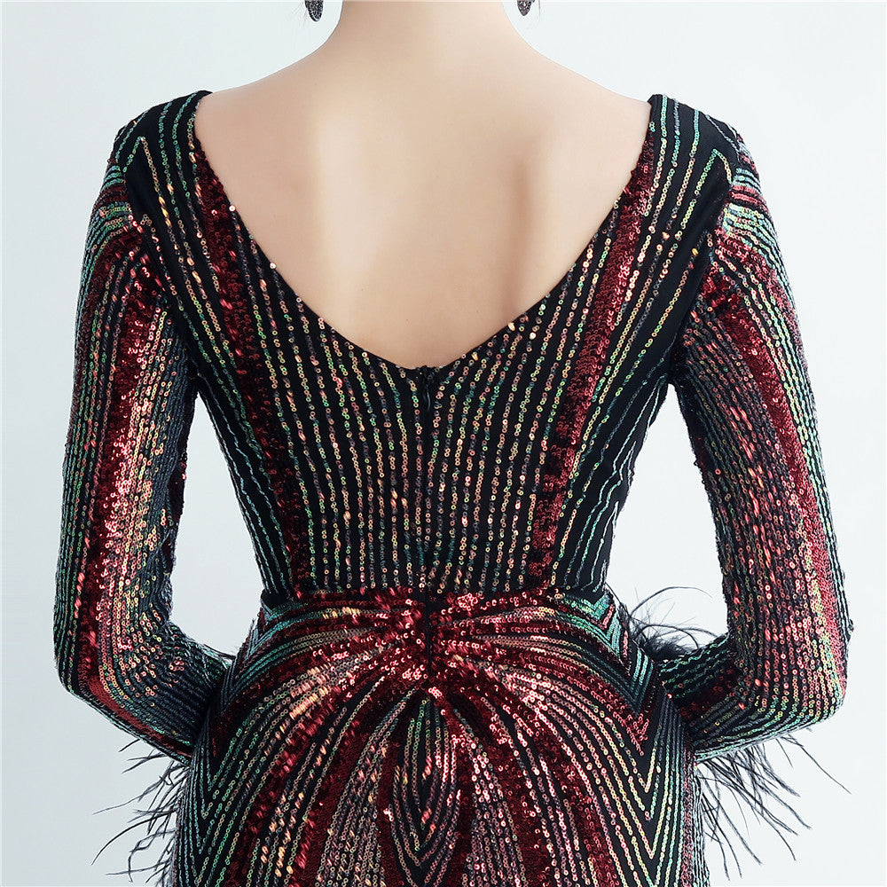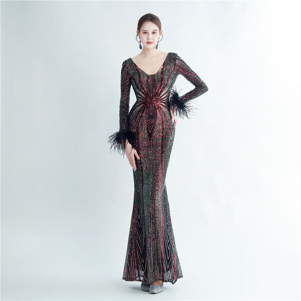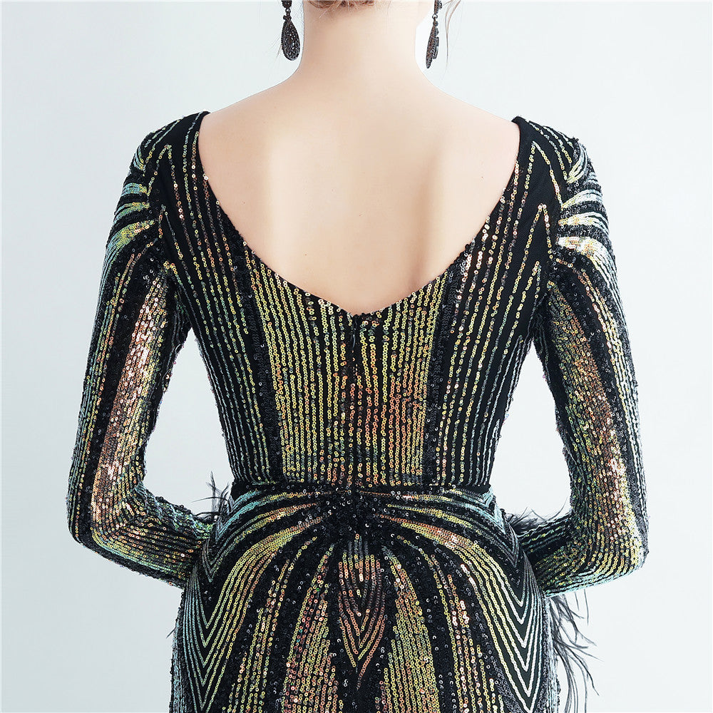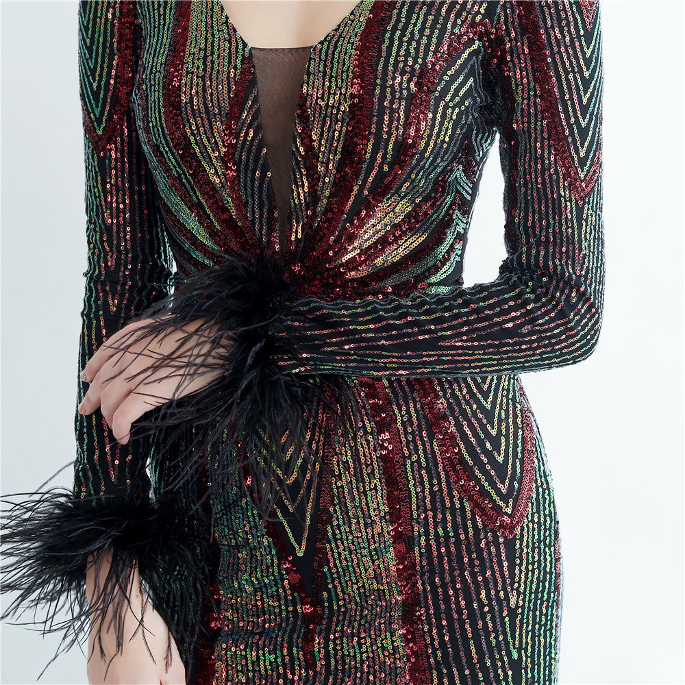 An elegant maxi with a slimming silhouette. A V-neckline frames feather and sequin embellishments, finished with a discreet zipper.