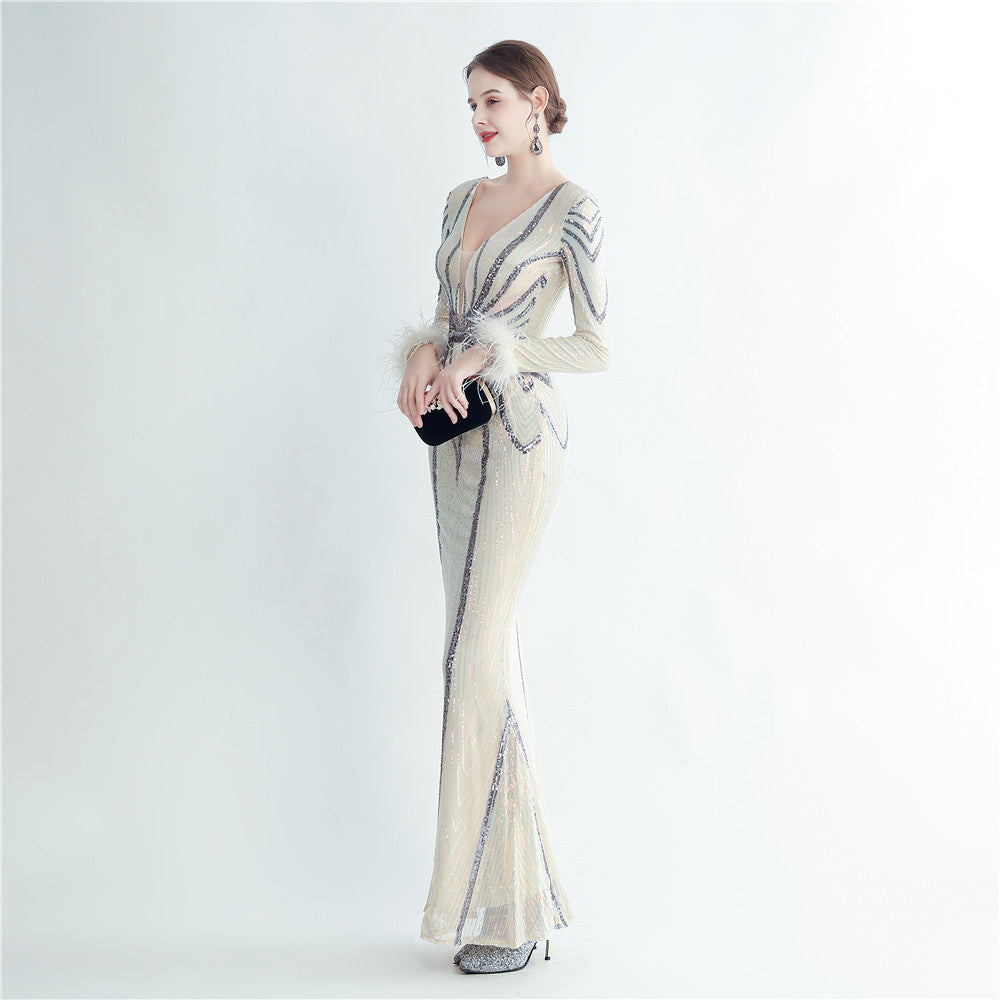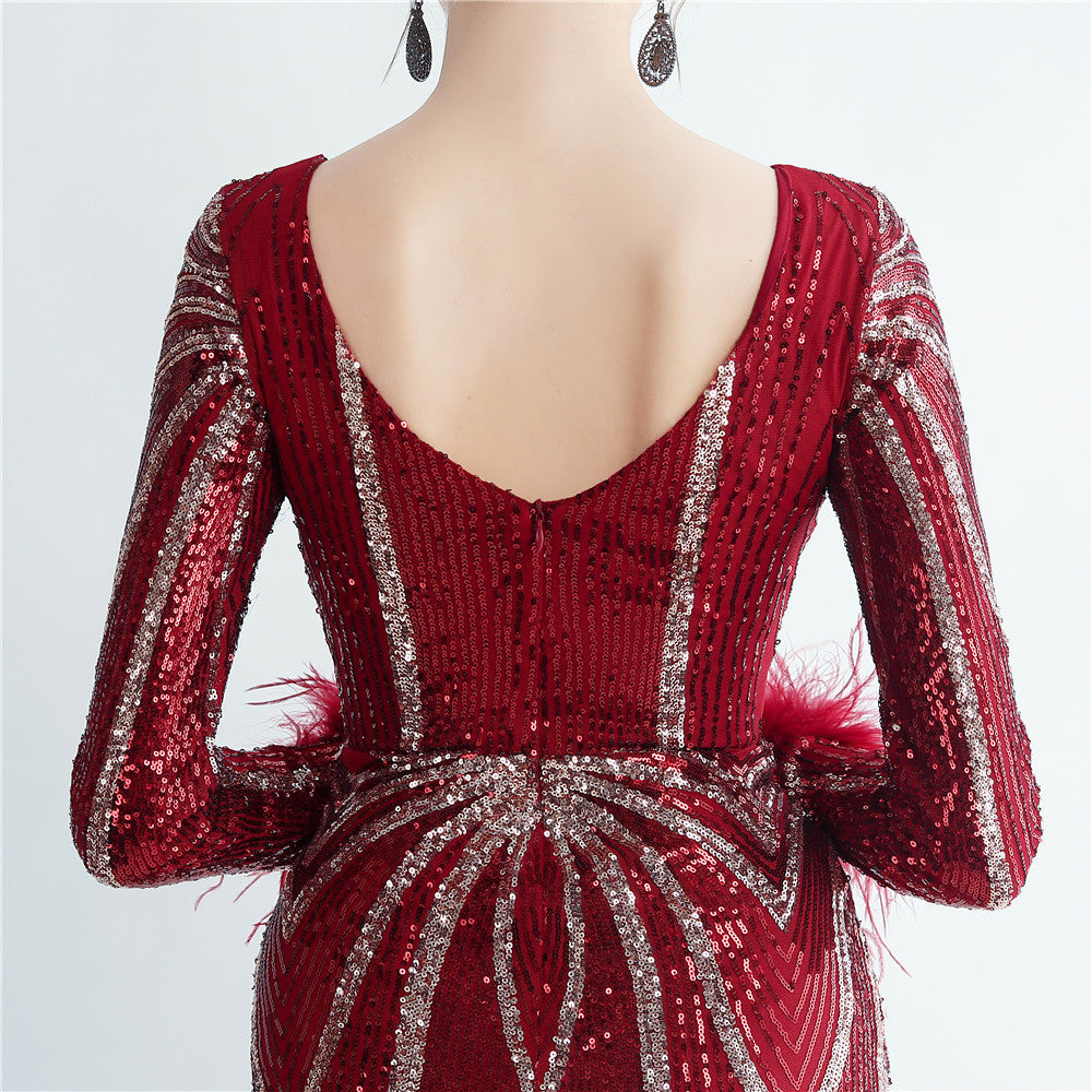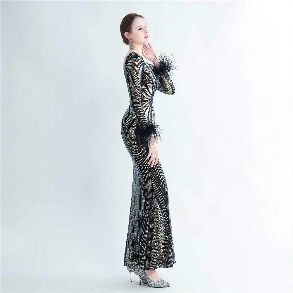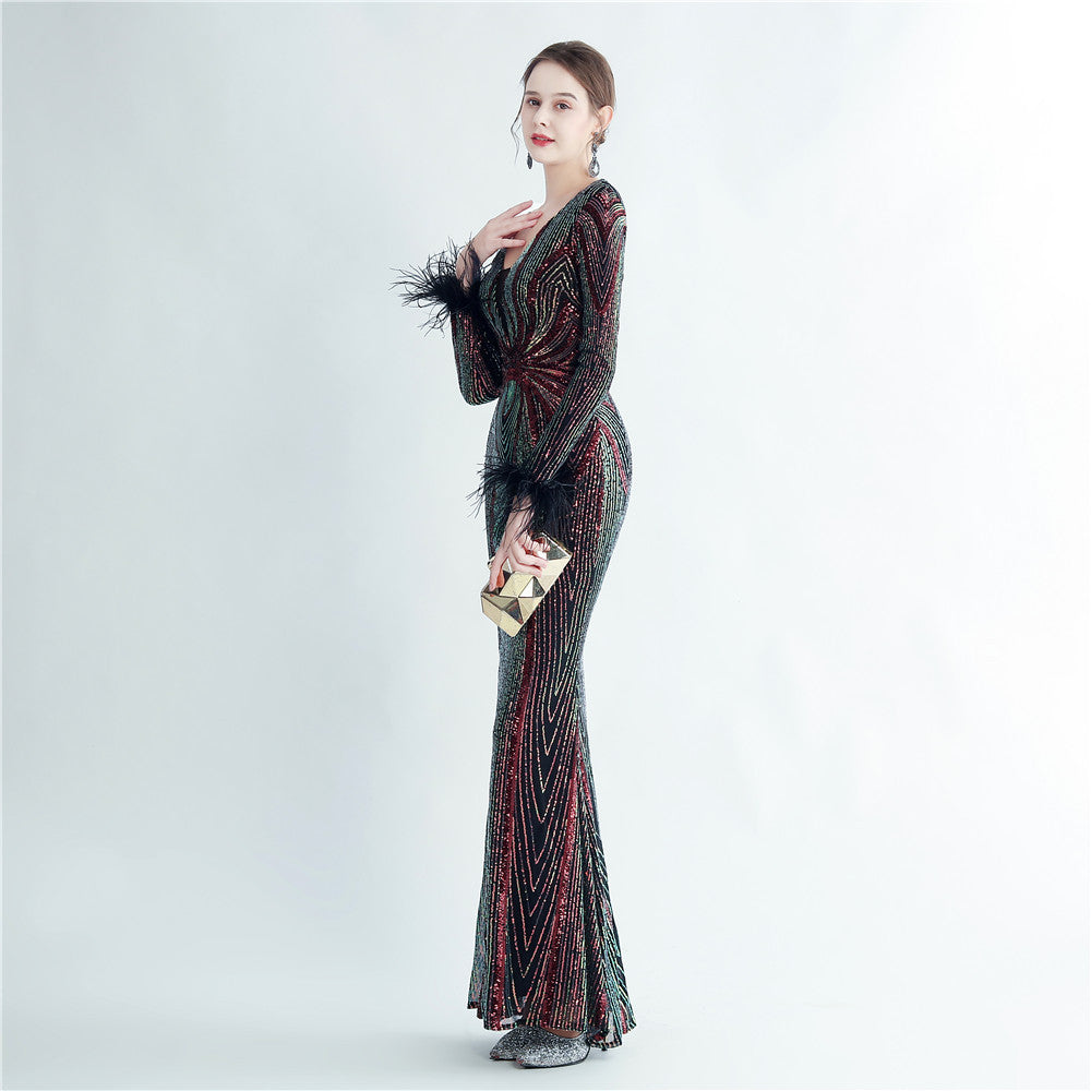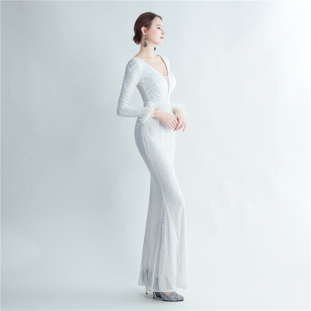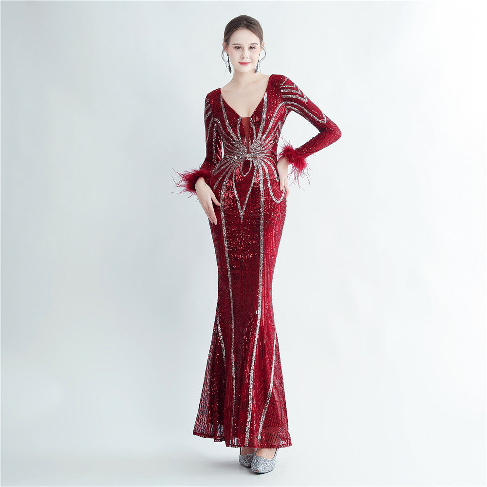 An elegant maxi with a slimming silhouette. A V-neckline frames feather and sequin embellishments, finished with a discreet zipper.