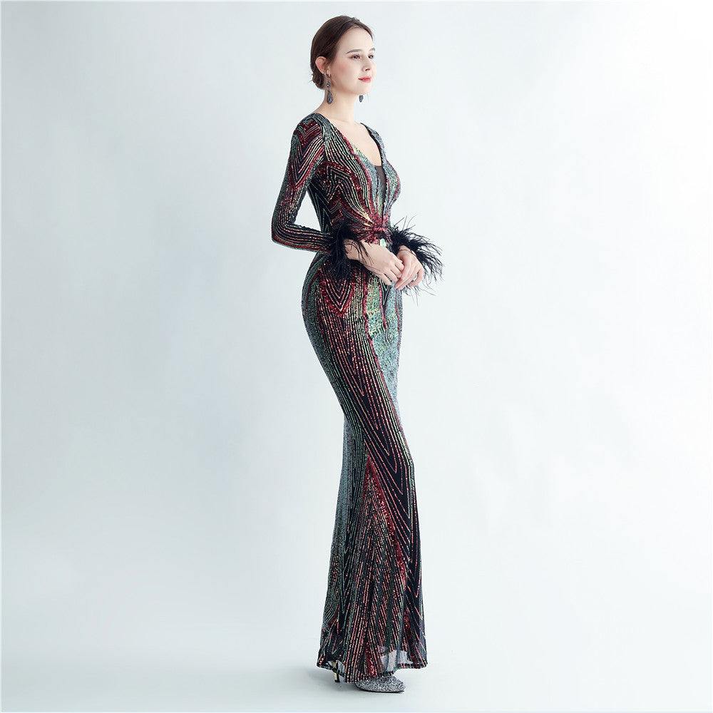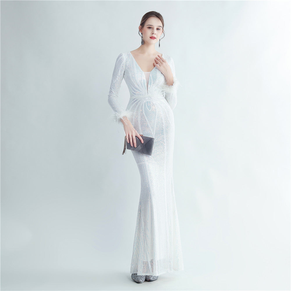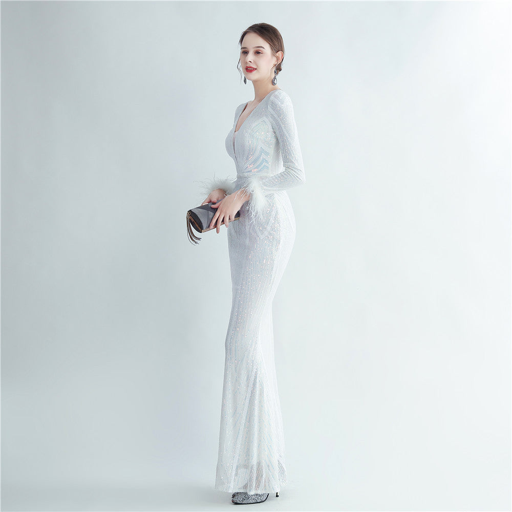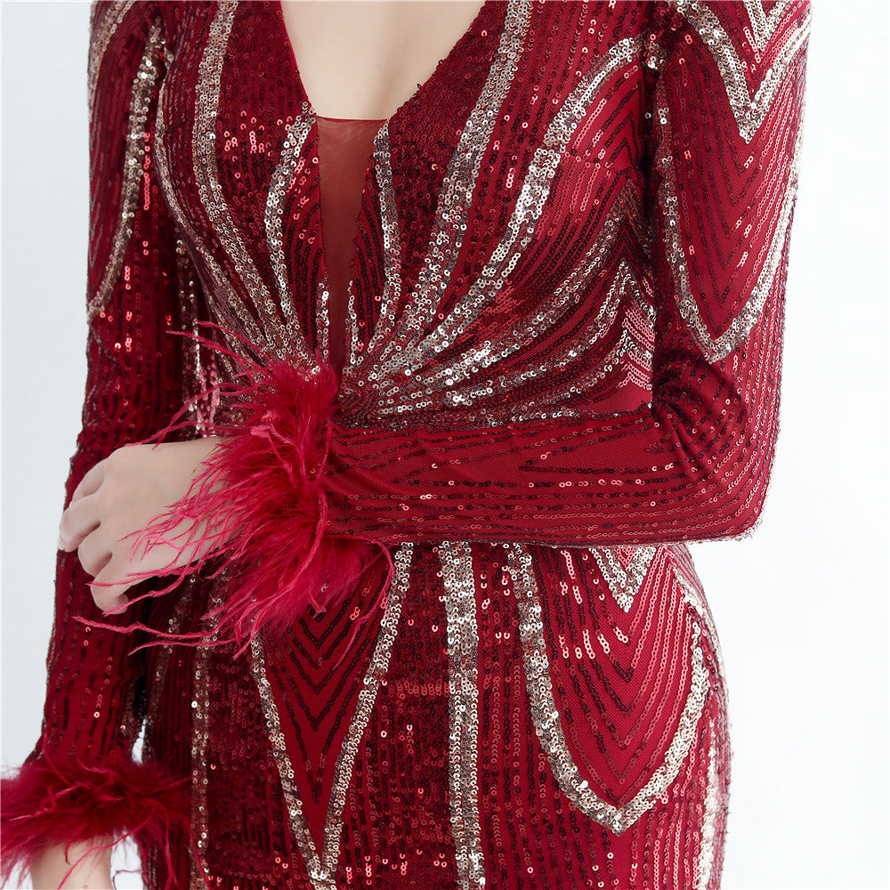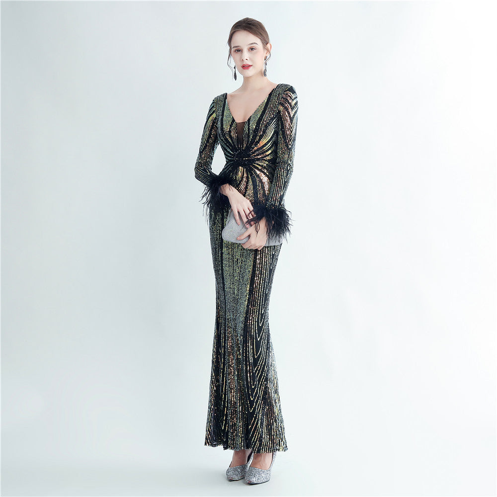 An elegant maxi with a slimming silhouette. A V-neckline frames feather and sequin embellishments, finished with a discreet zipper.