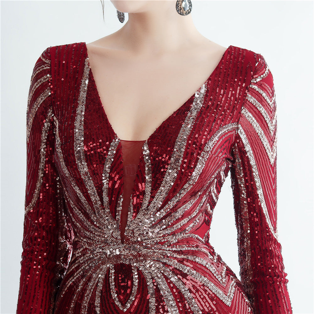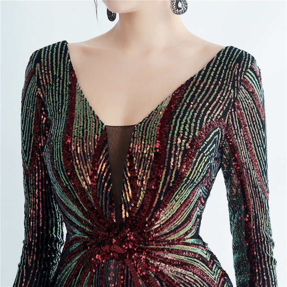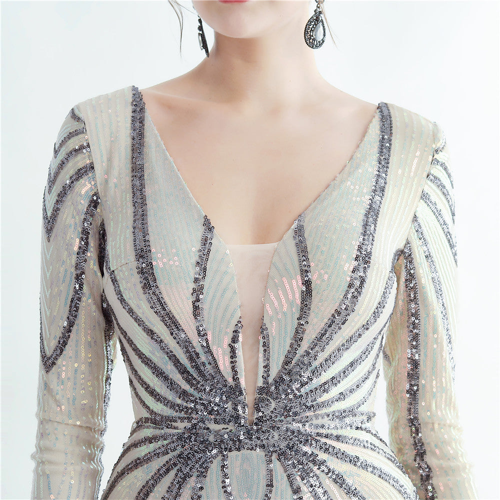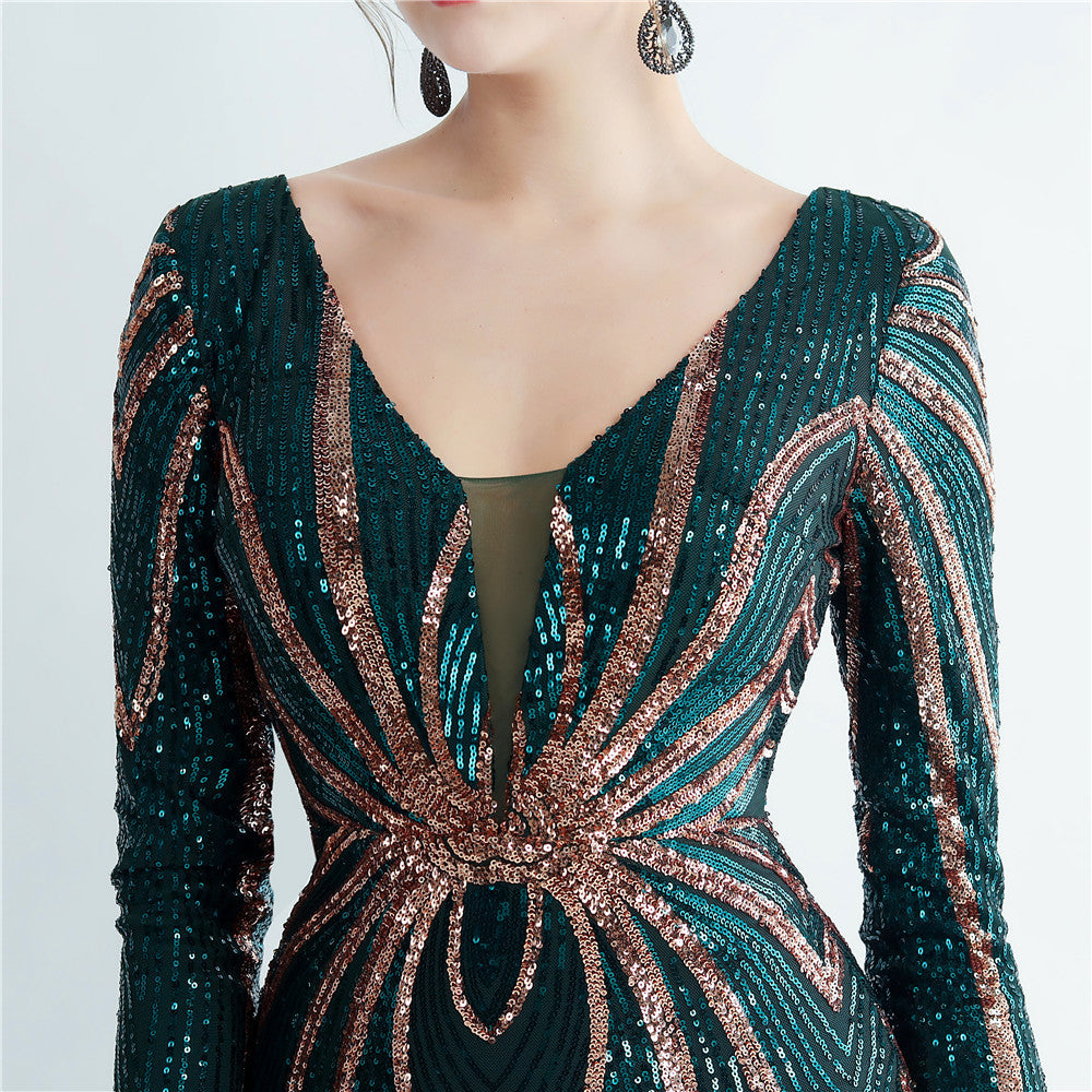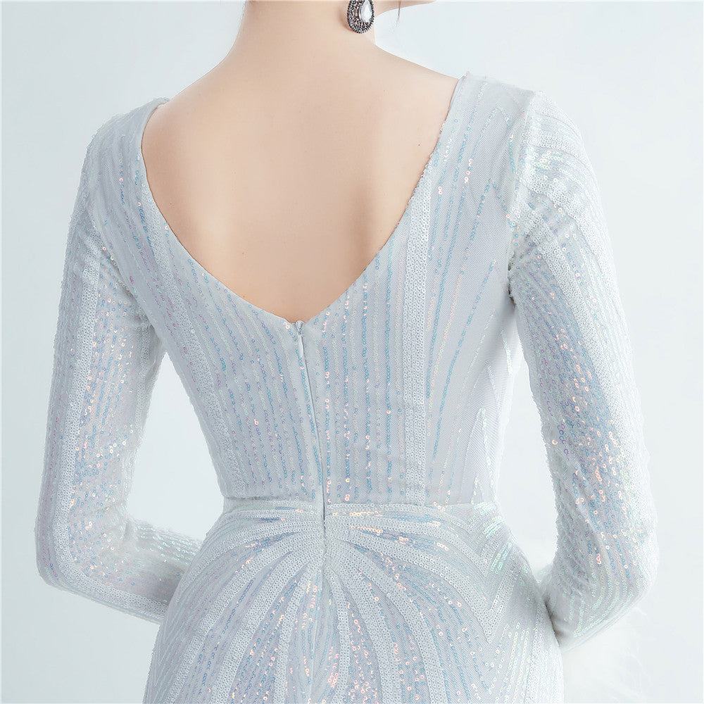 An elegant maxi with a slimming silhouette. A V-neckline frames feather and sequin embellishments, finished with a discreet zipper.
