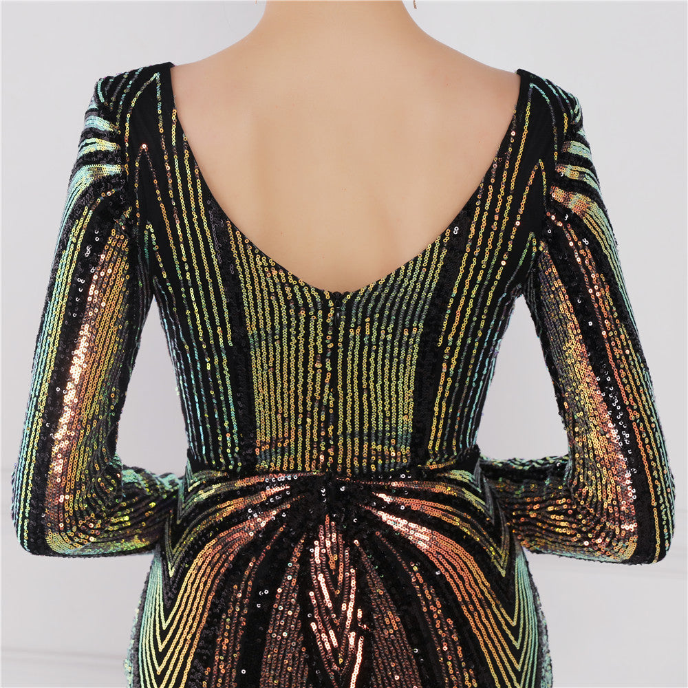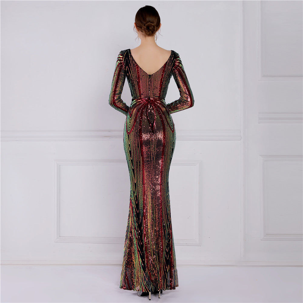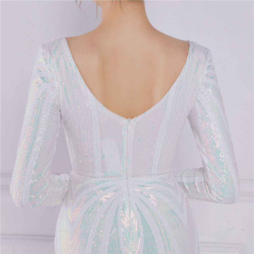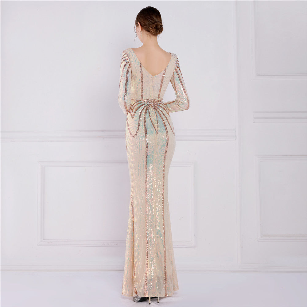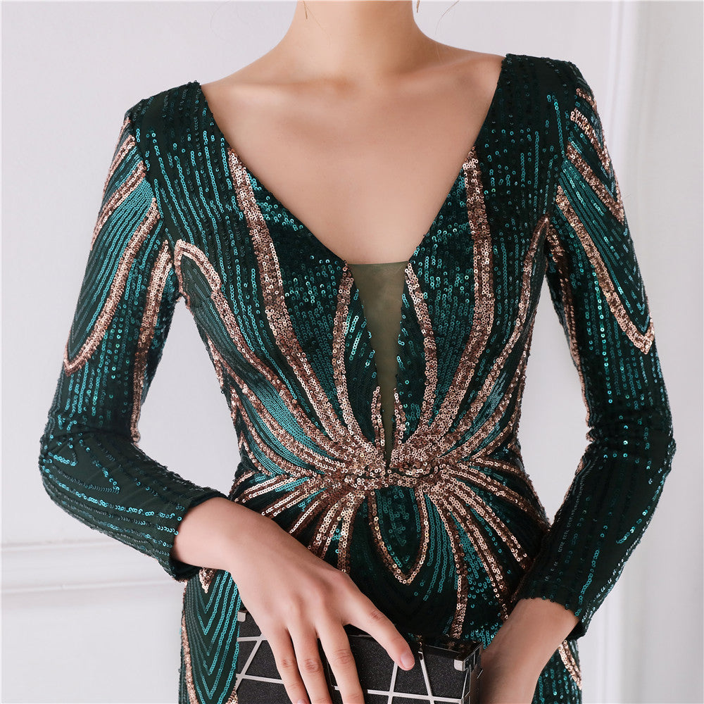 The Sequin Fishtail Maxi Dress features a slim, body-skimming silhouette. A V-neckline with sequin embellishment and delicate lace/tulle accents completes the look.