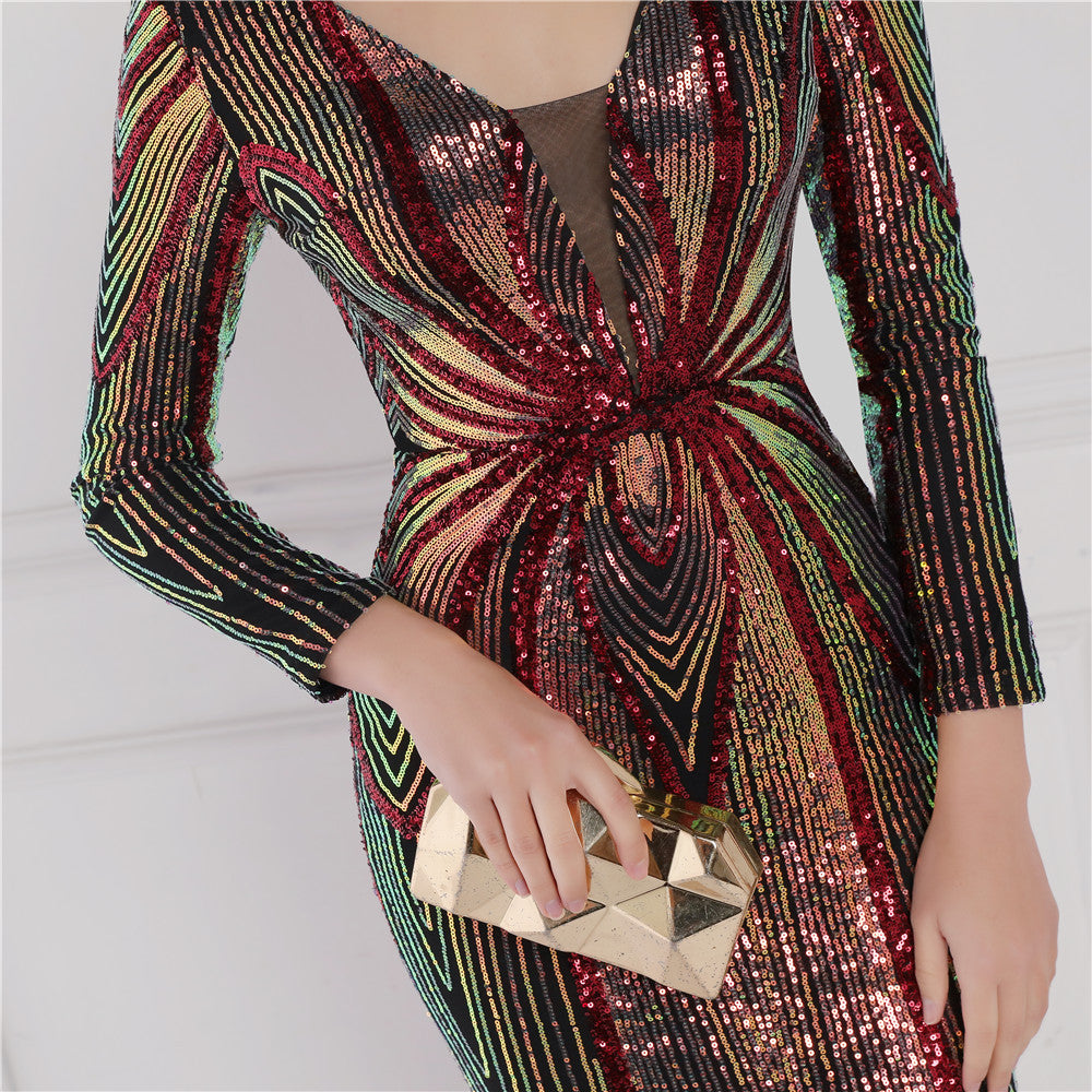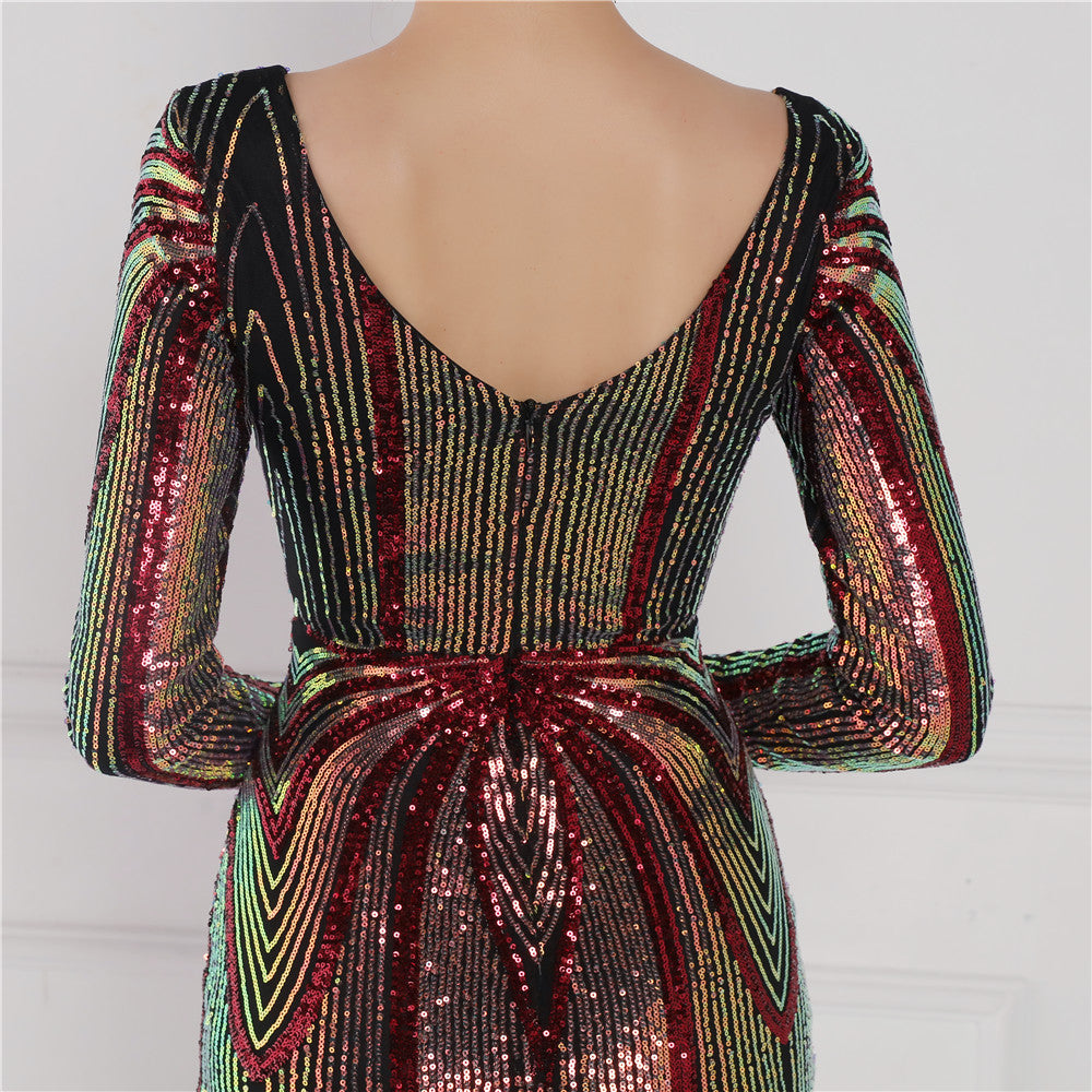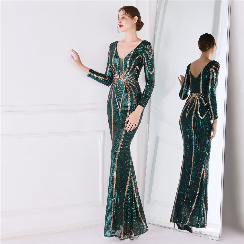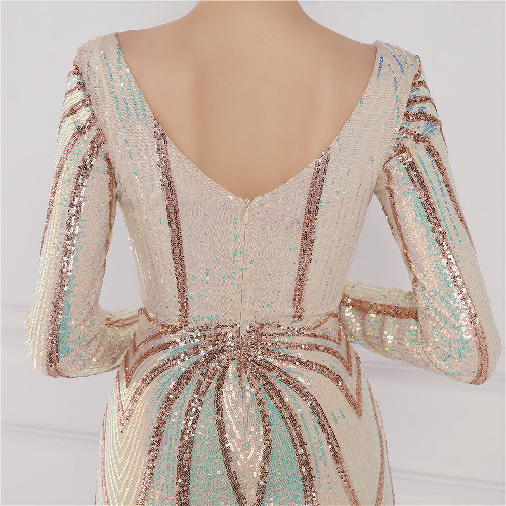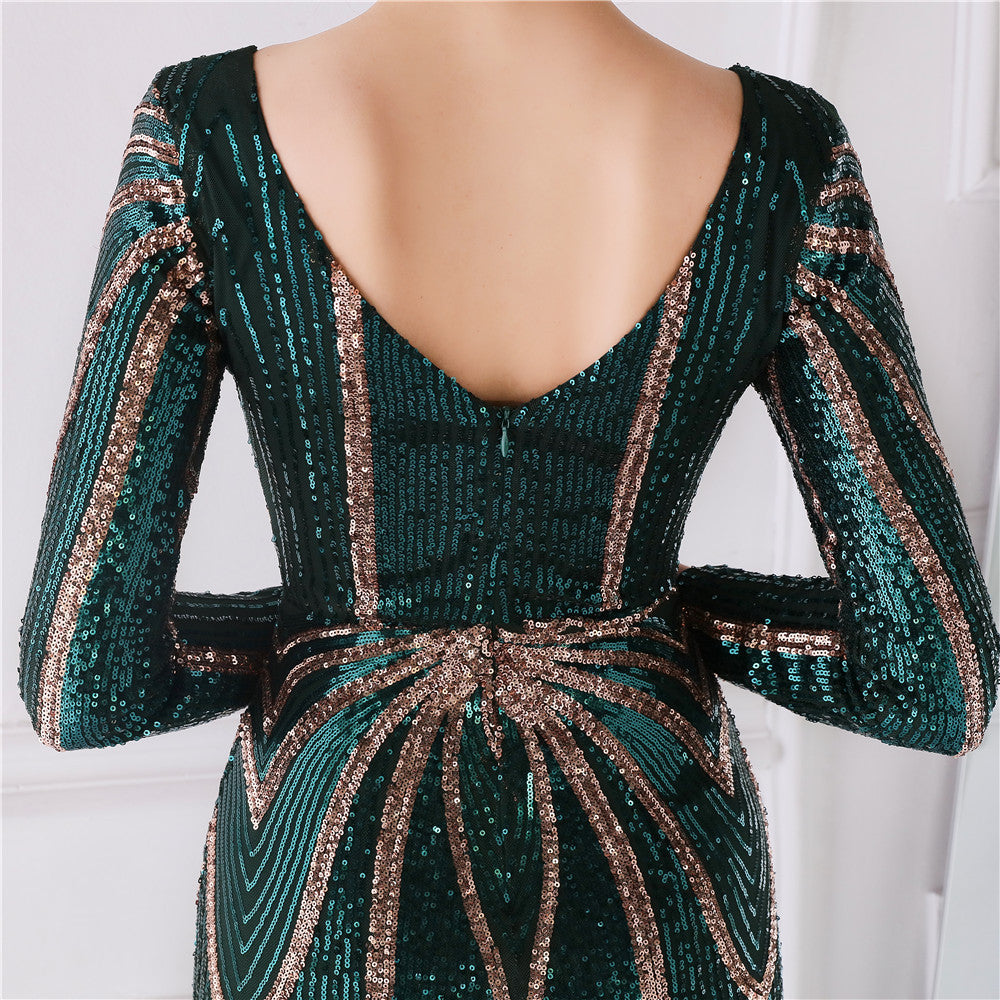 The Sequin Fishtail Maxi Dress features a slim, body-skimming silhouette. A V-neckline with sequin embellishment and delicate lace/tulle accents completes the look.