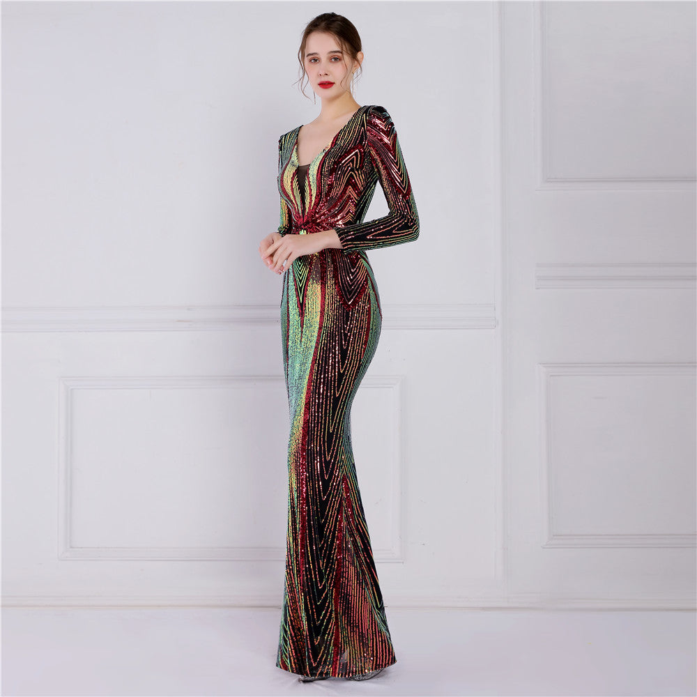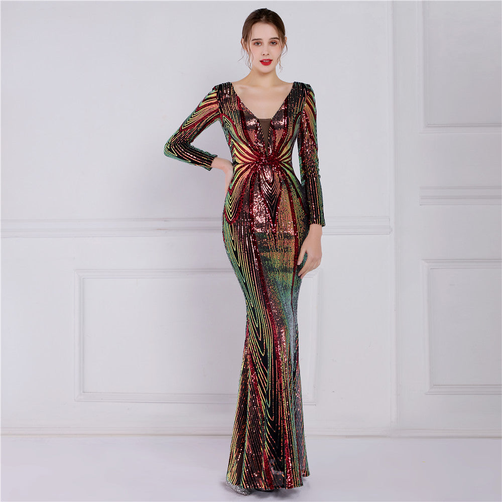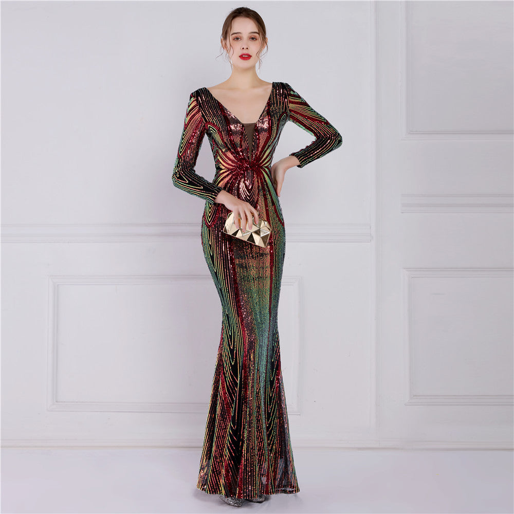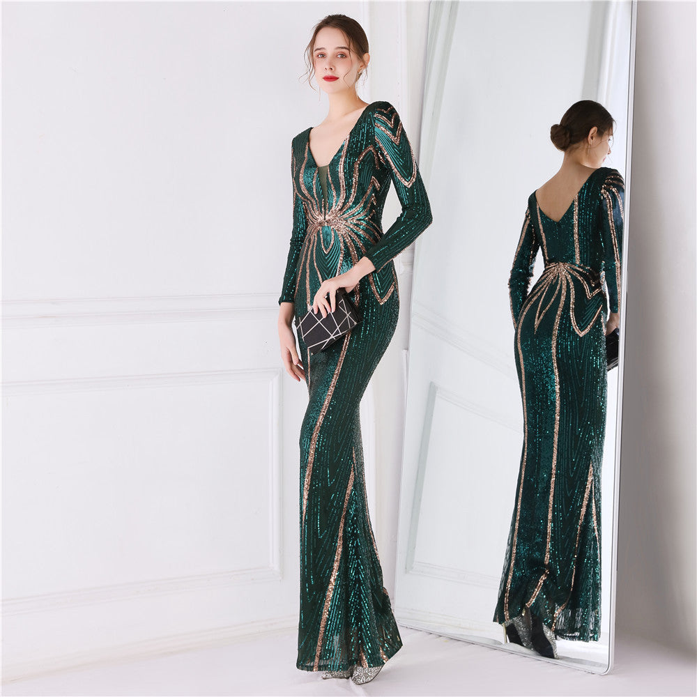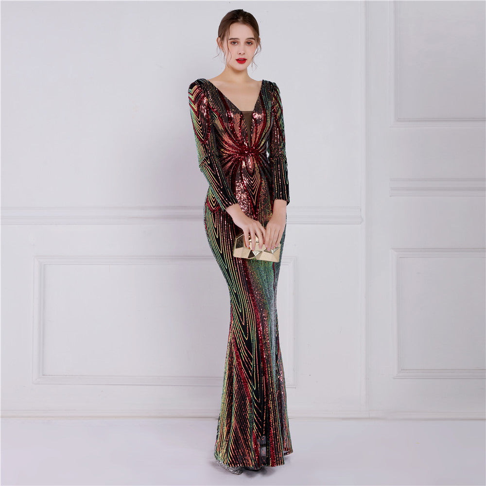 The Sequin Fishtail Maxi Dress features a slim, body-skimming silhouette. A V-neckline with sequin embellishment and delicate lace/tulle accents completes the look.