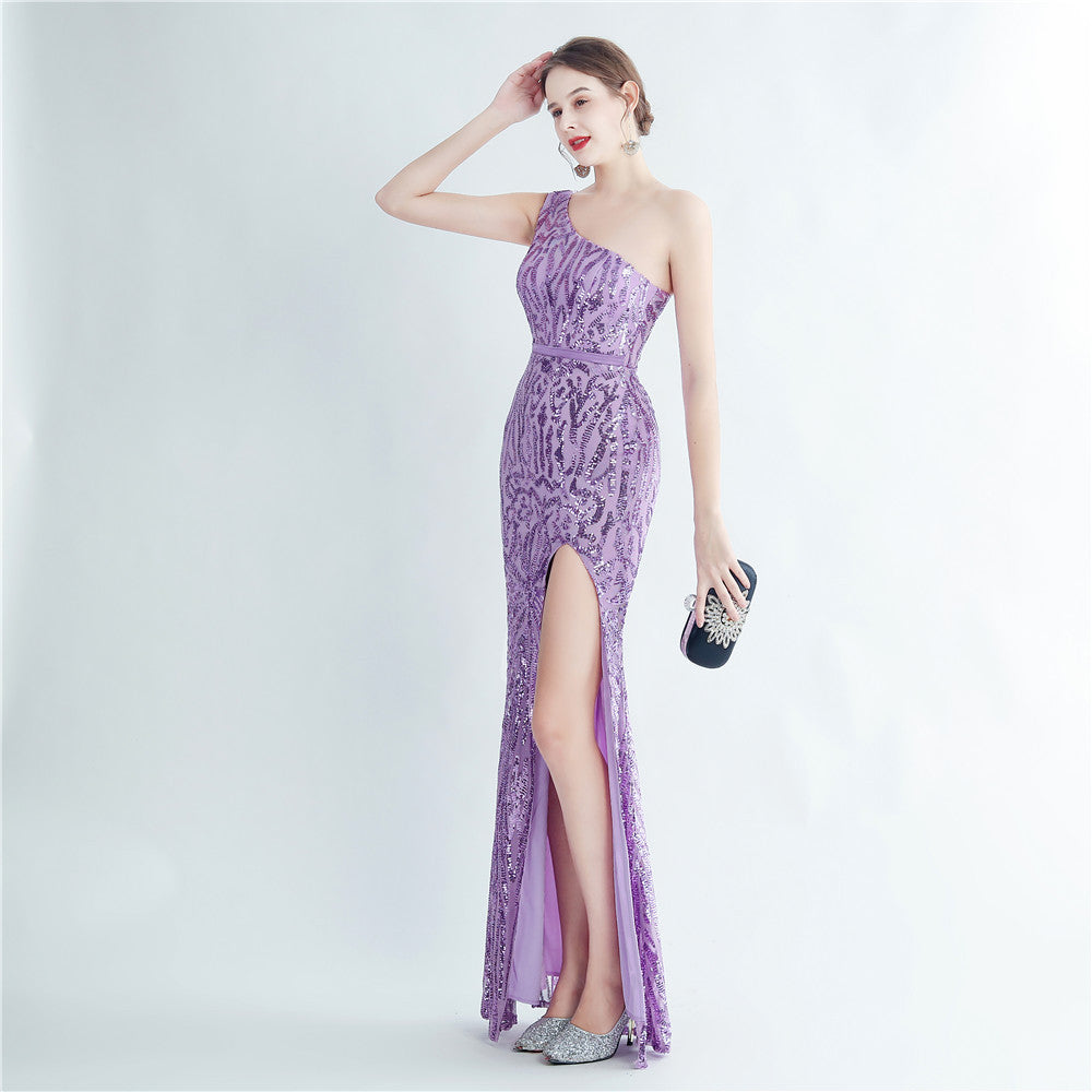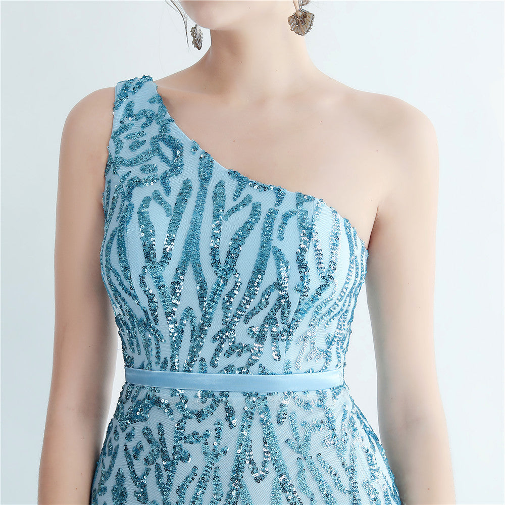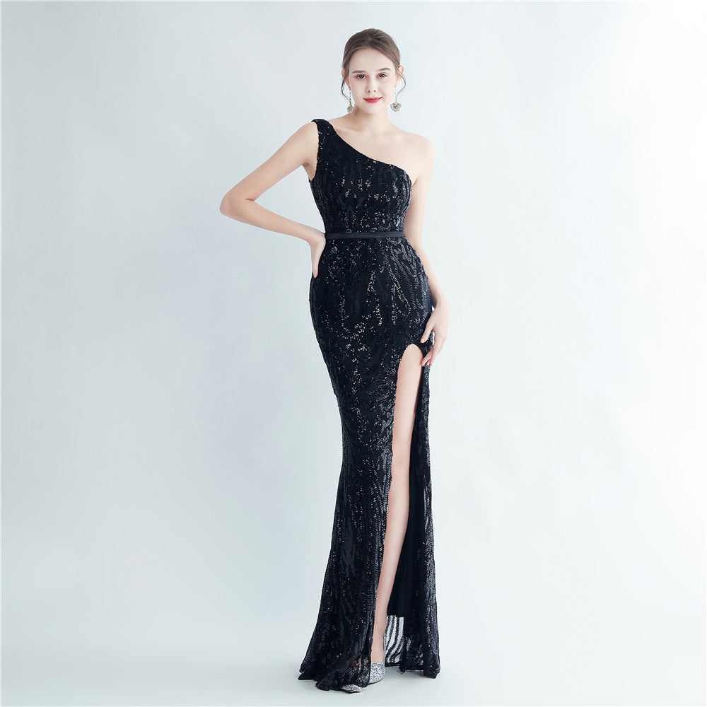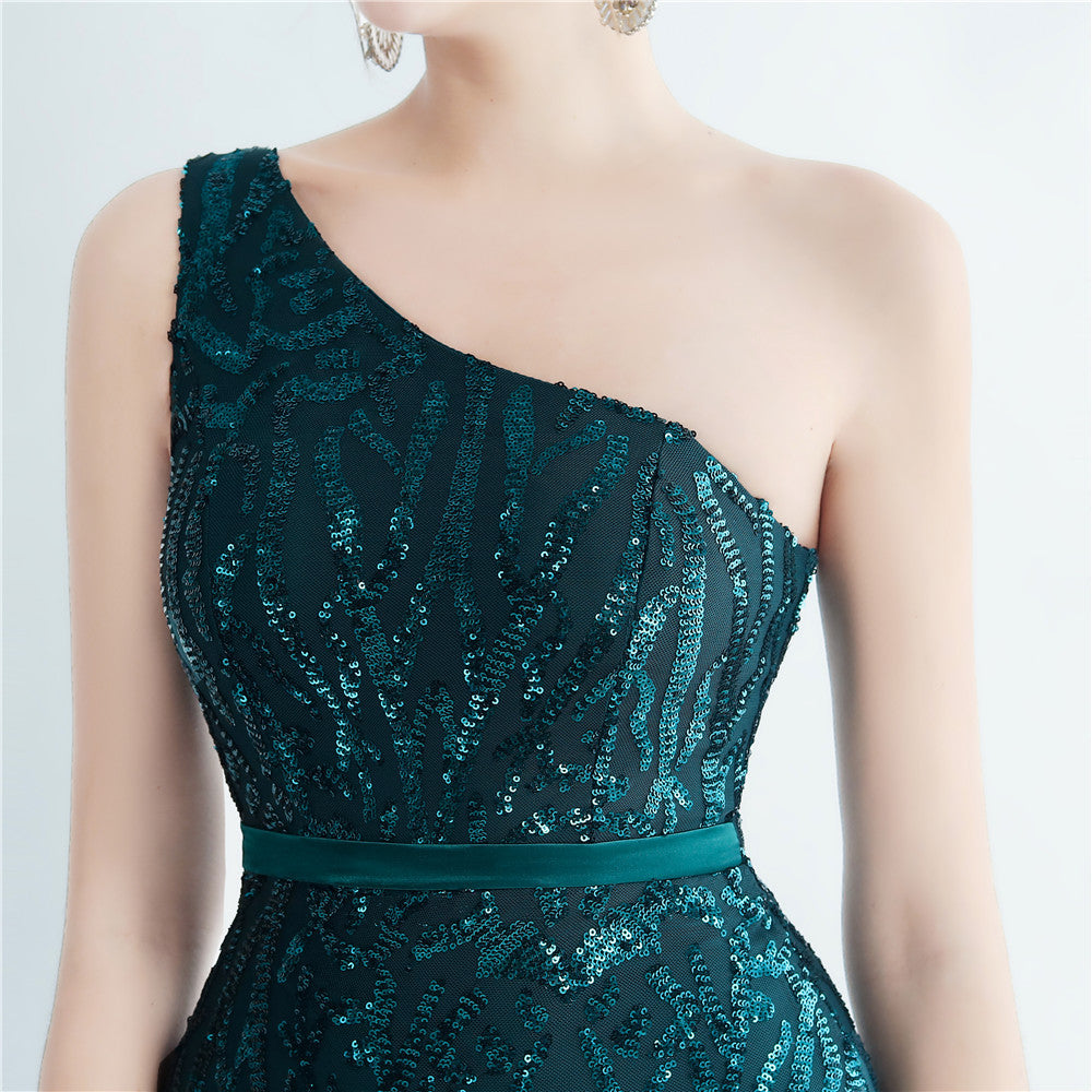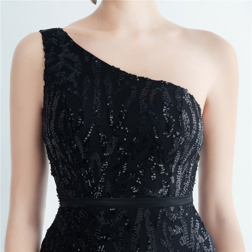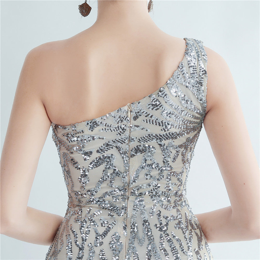 A one-shoulder sequin maxi with a slim, clean silhouette. Asymmetric styling and a leg-slit complete the look.