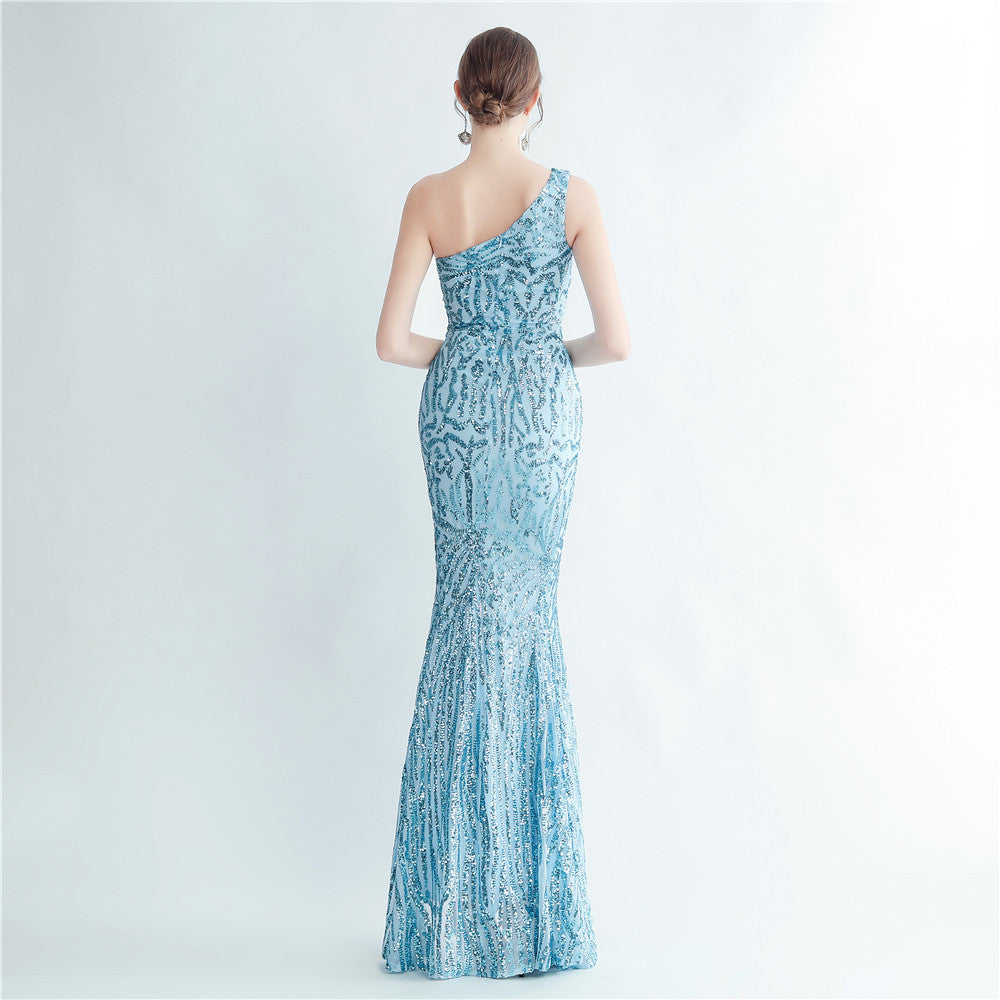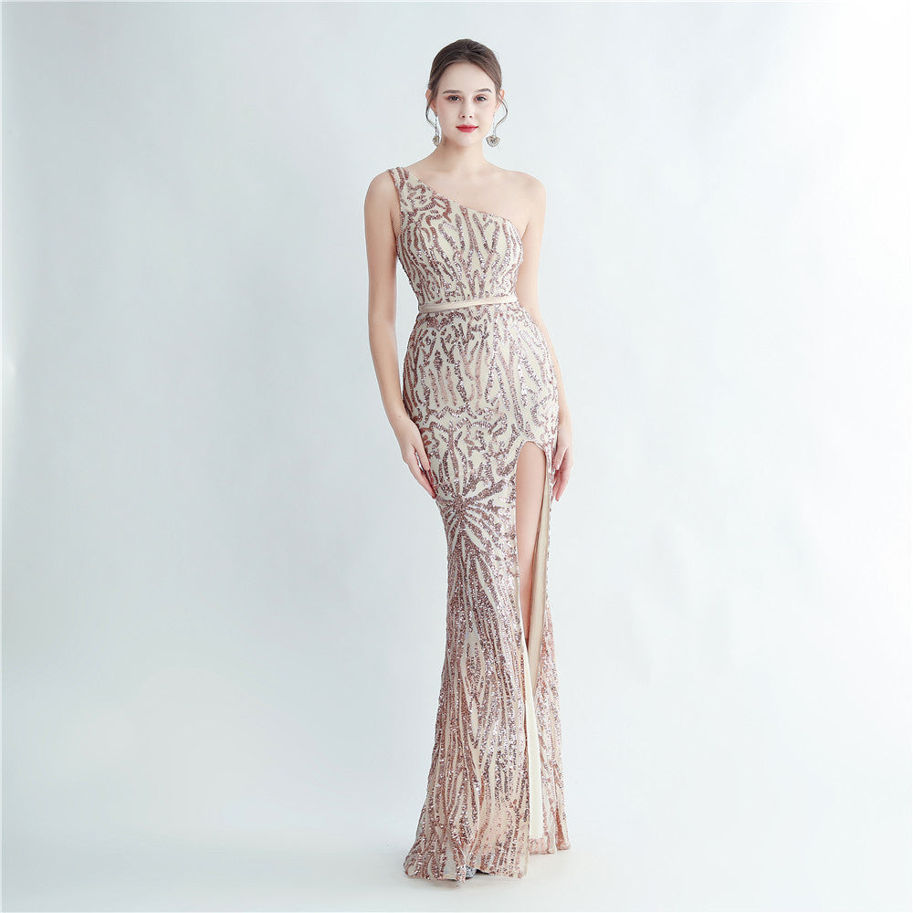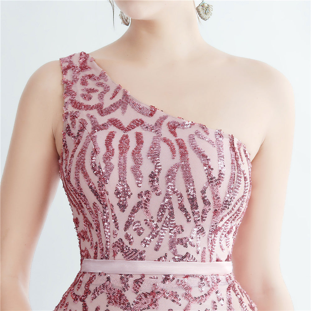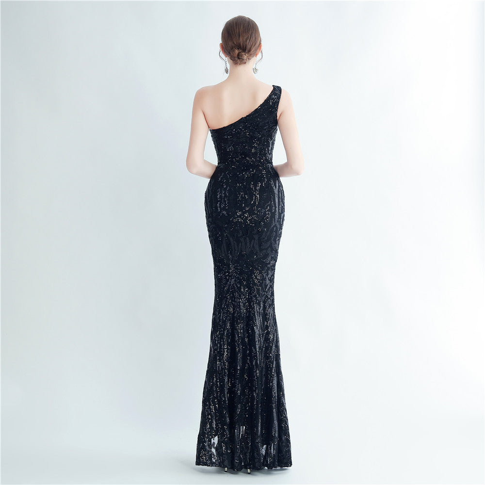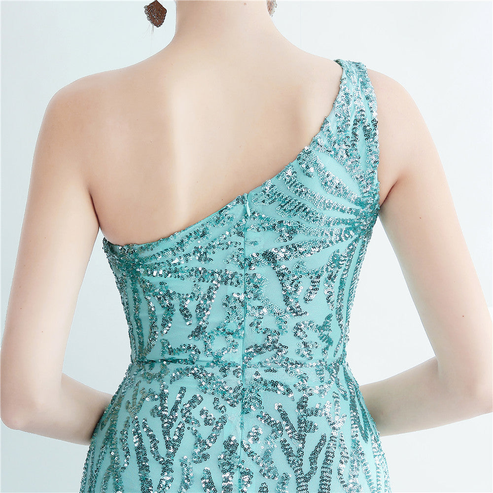 A one-shoulder sequin maxi with a slim, clean silhouette. Asymmetric styling and a leg-slit complete the look.