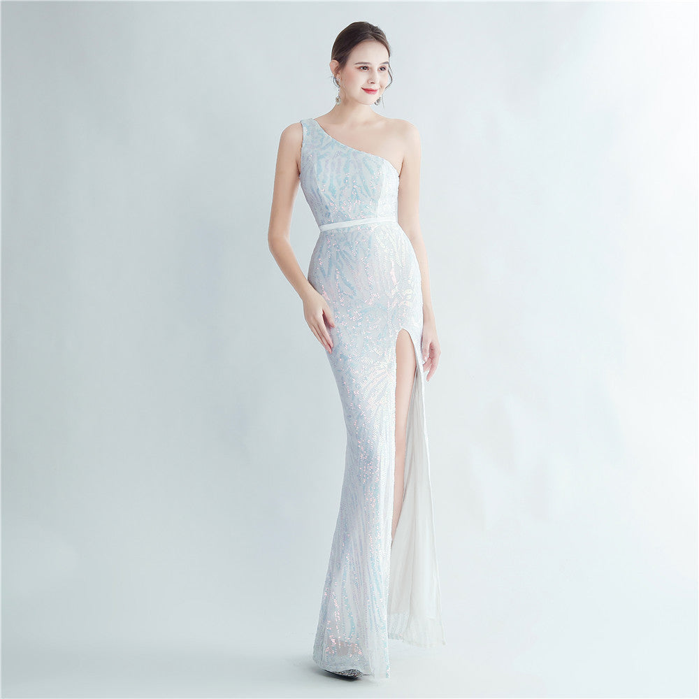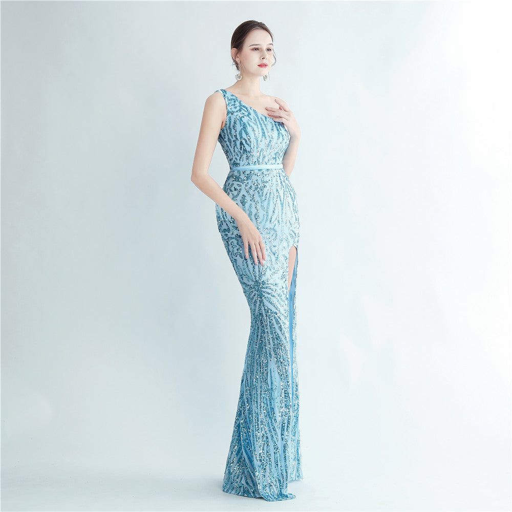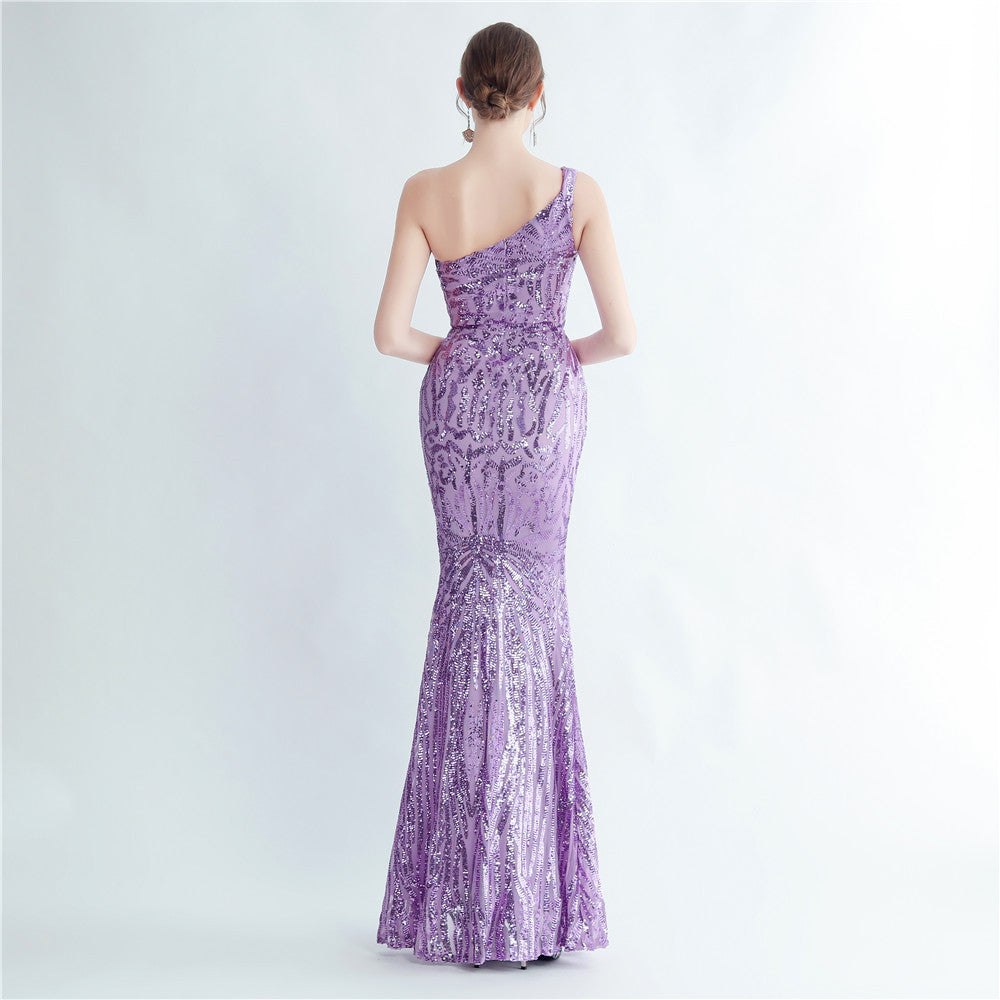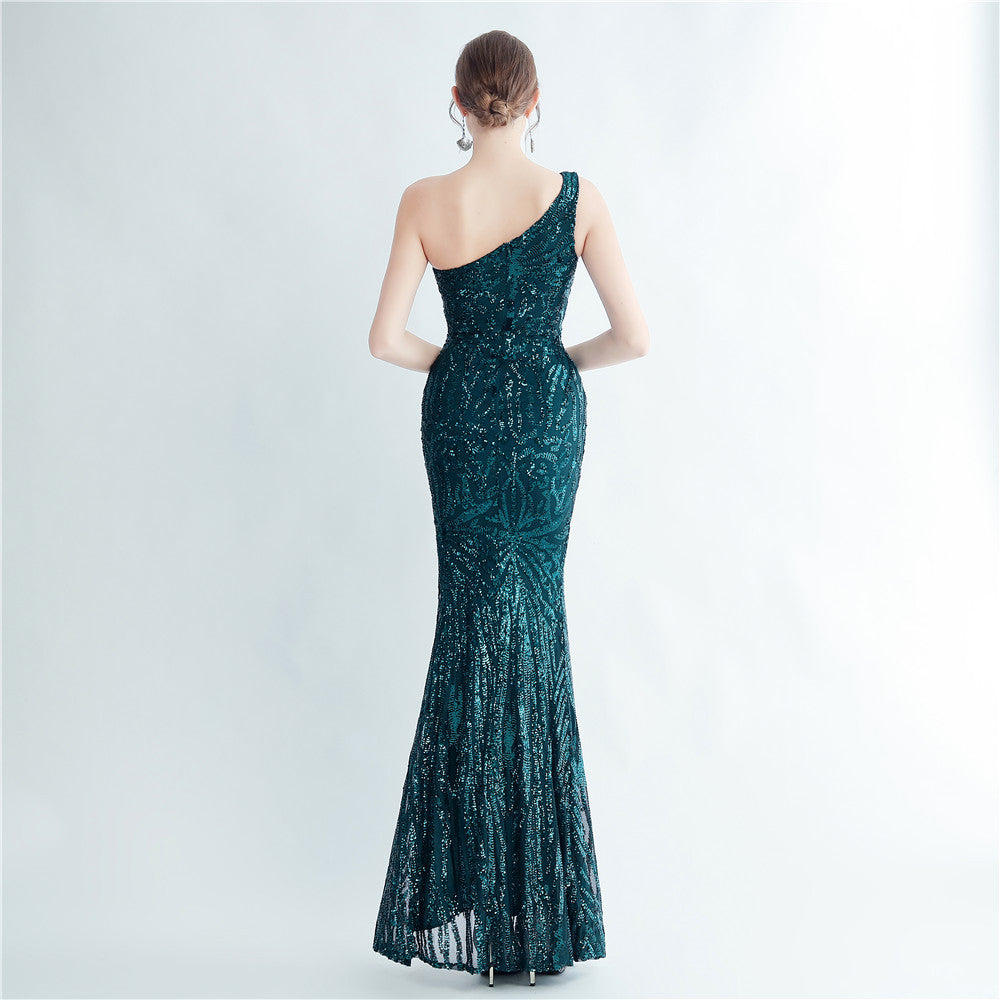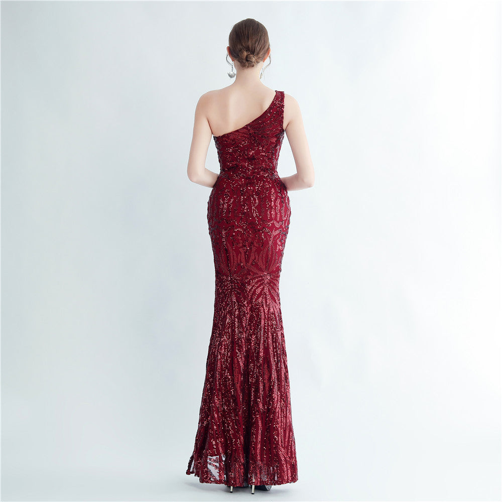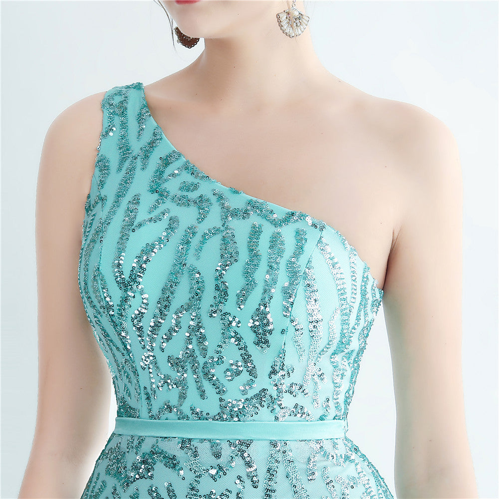 A one-shoulder sequin maxi with a slim, clean silhouette. Asymmetric styling and a leg-slit complete the look.