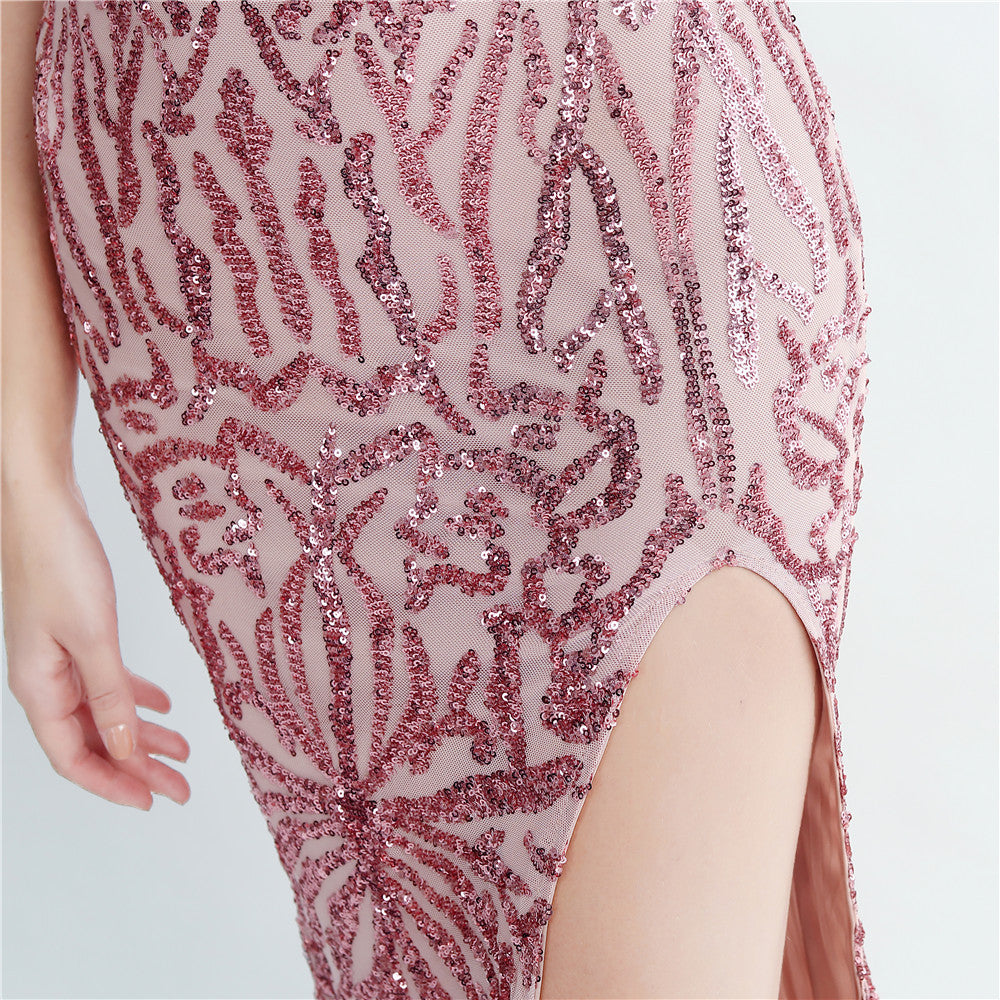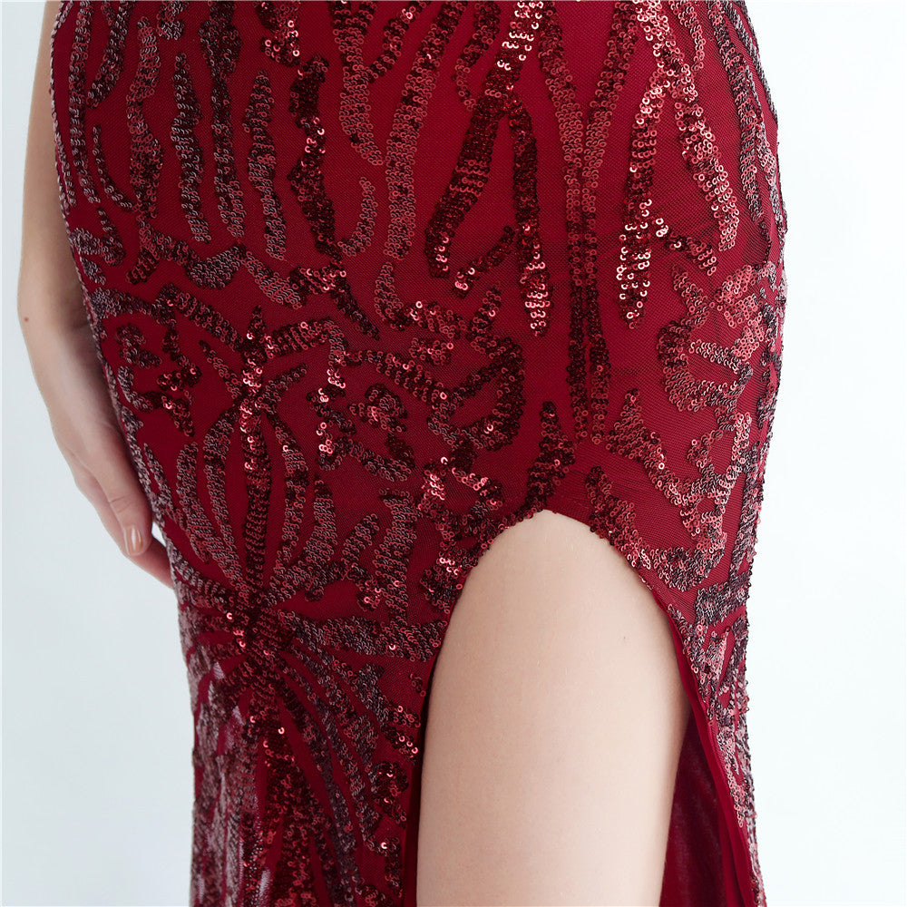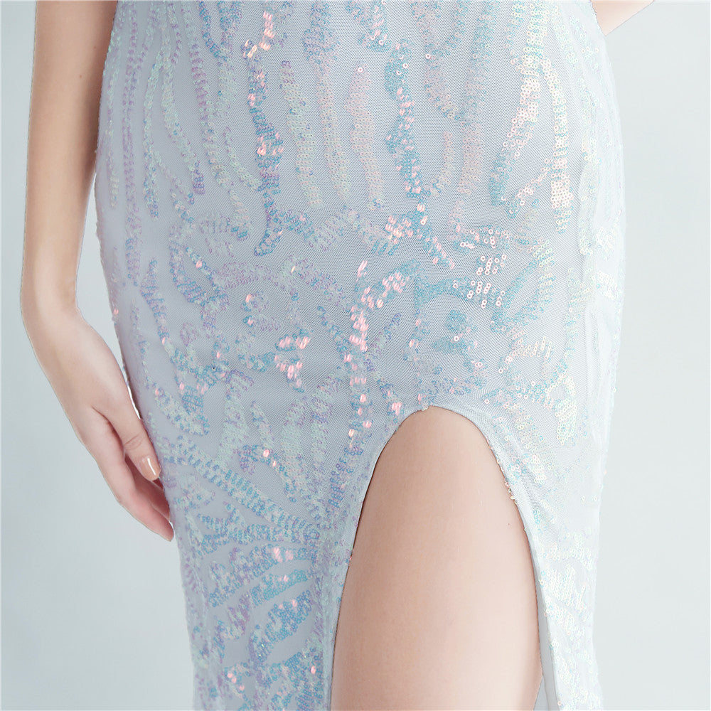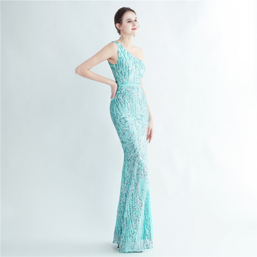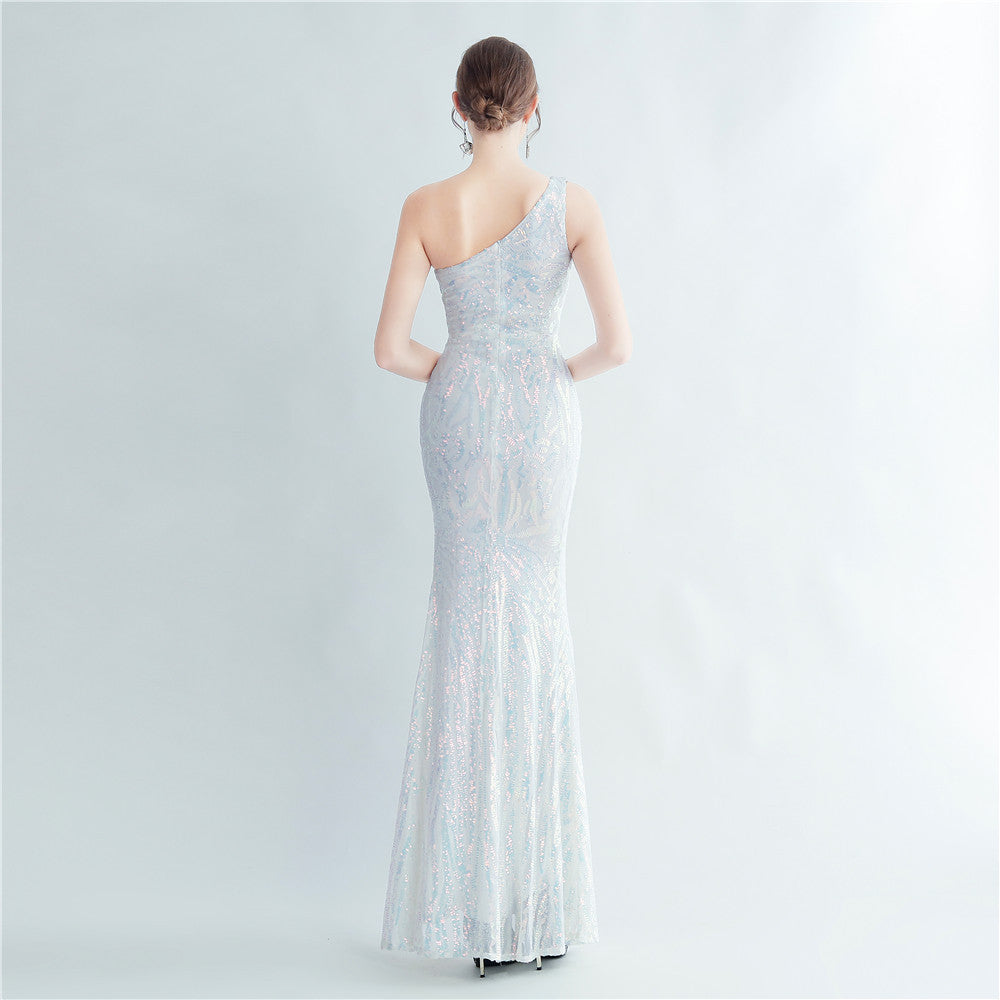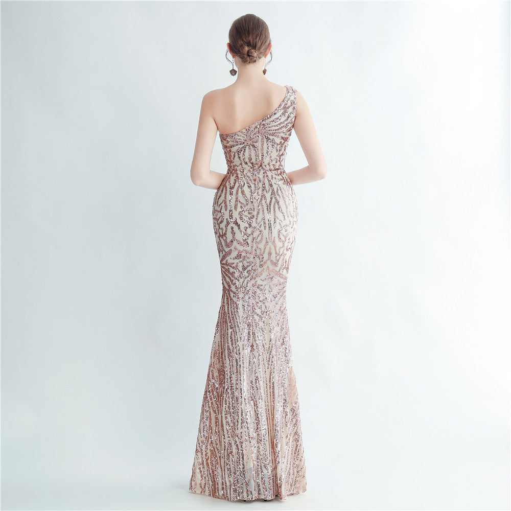 A one-shoulder sequin maxi with a slim, clean silhouette. Asymmetric styling and a leg-slit complete the look.
