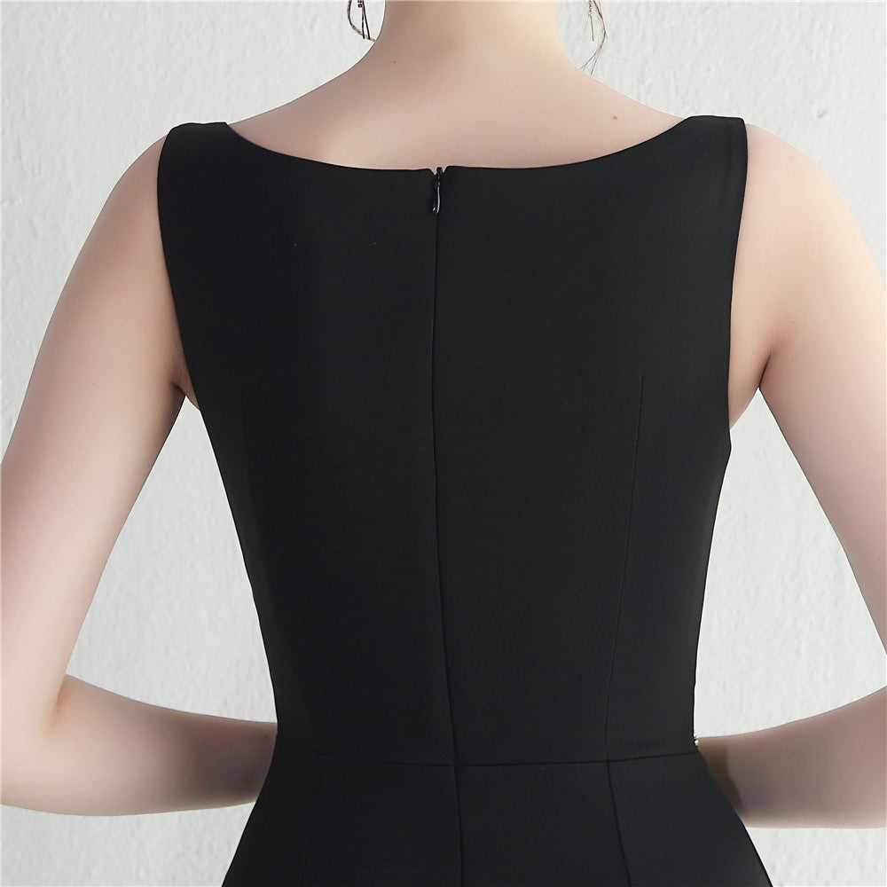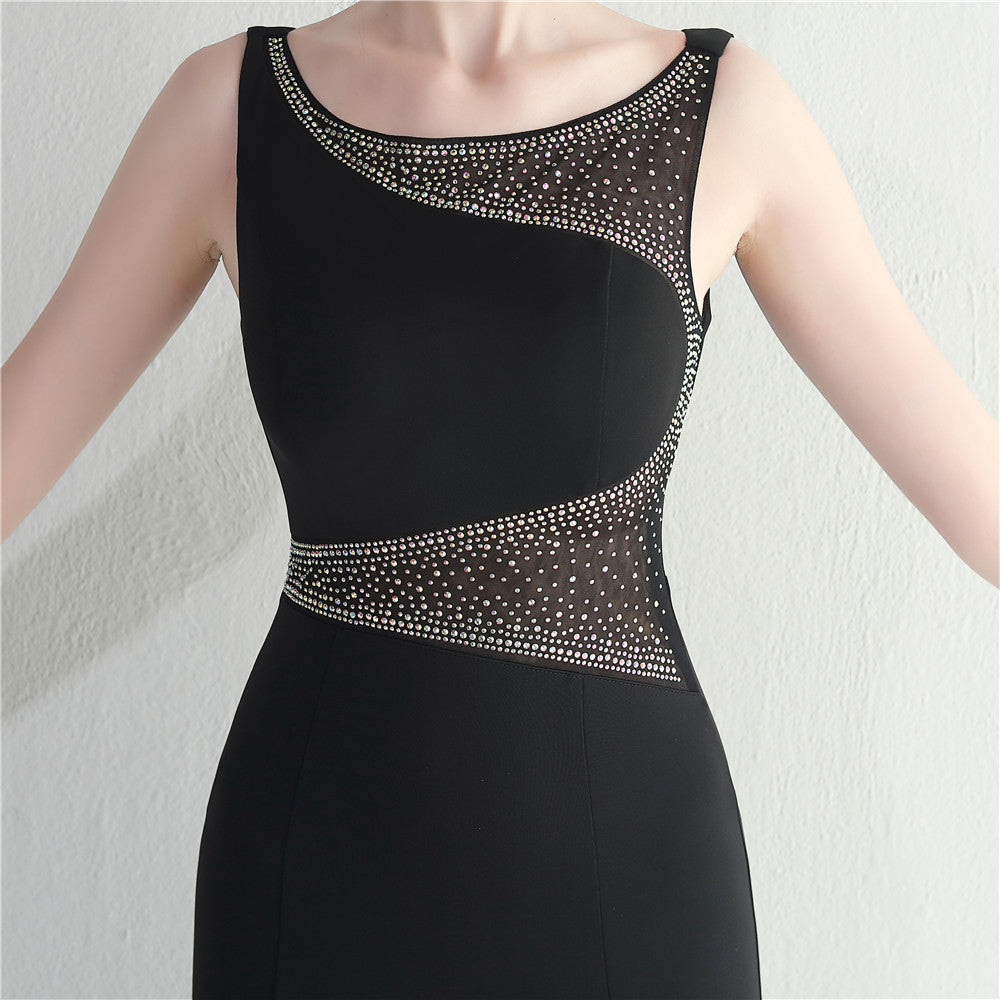 Rhinestone mesh accents lift this maxi with a slim, body-skimming silhouette. A crew neck and sleeveless bodice lead to a bold front split.