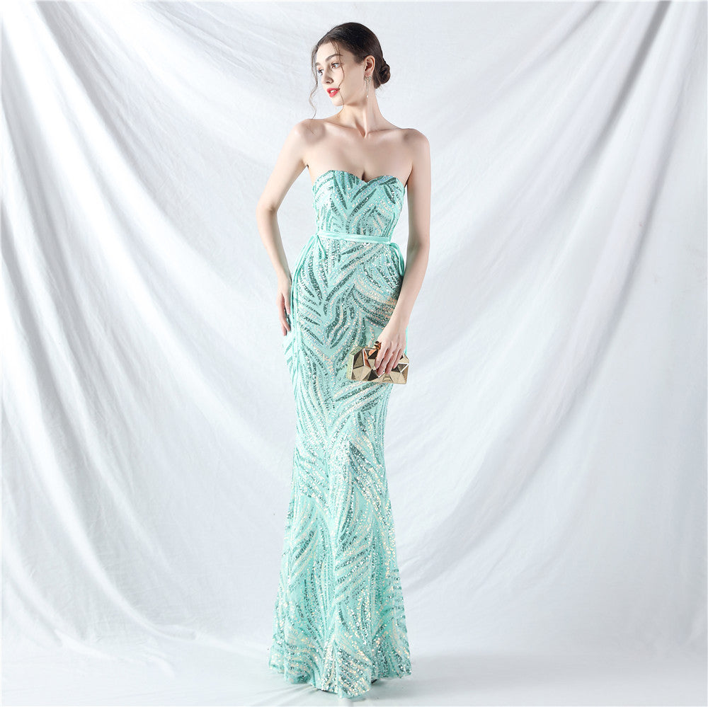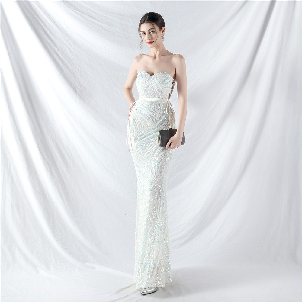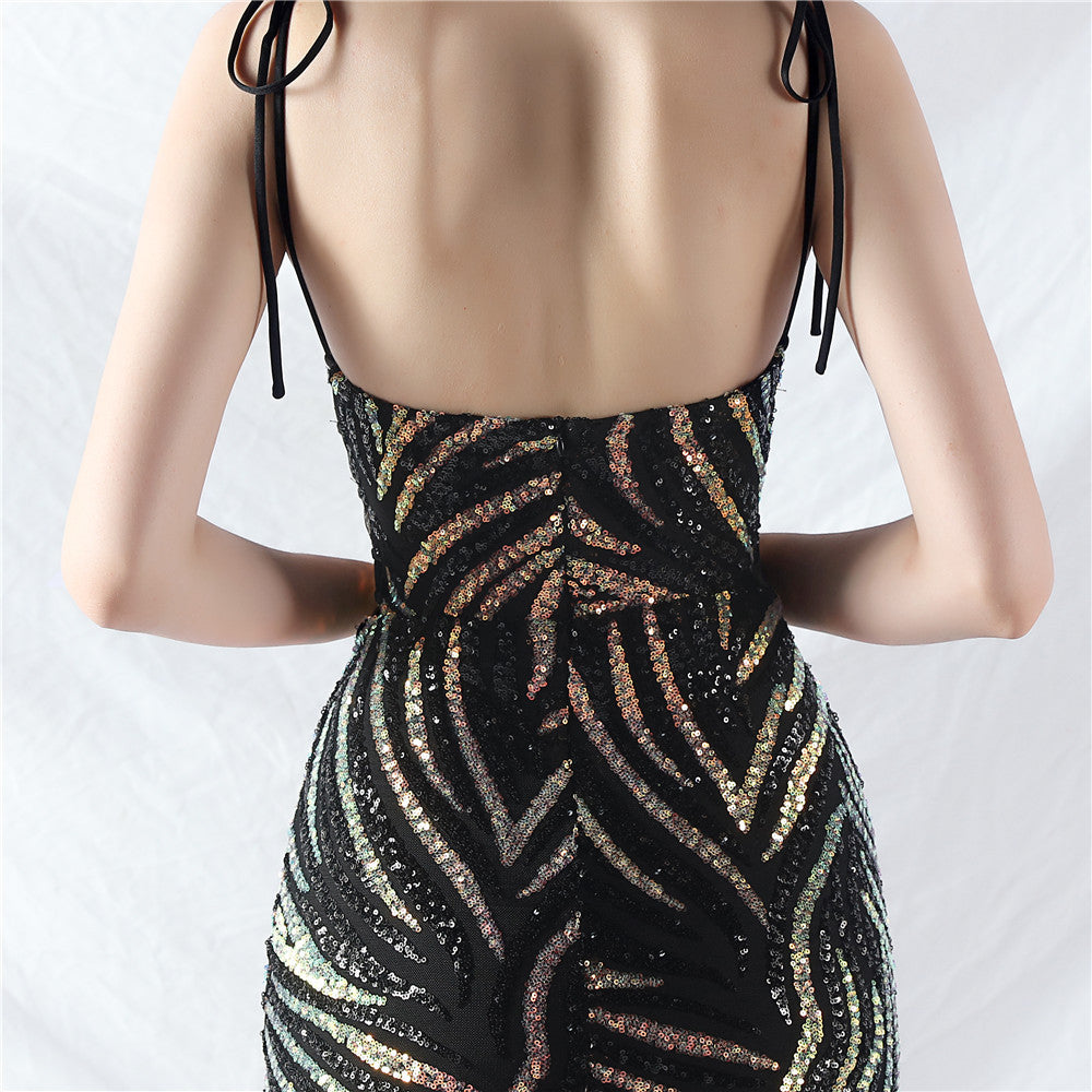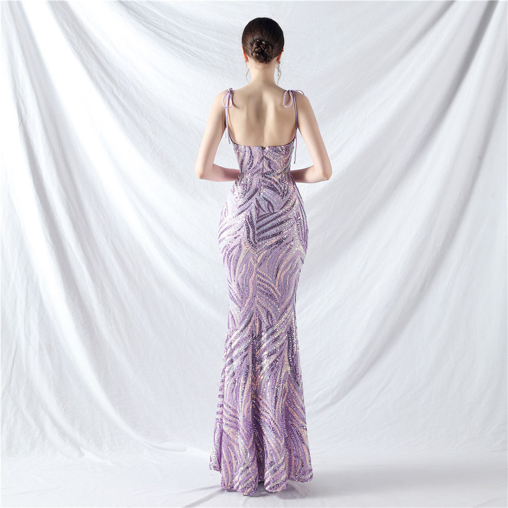 An elegant maxi with a slim silhouette. The V-neckline features a lace-up detail and shimmering sequins.