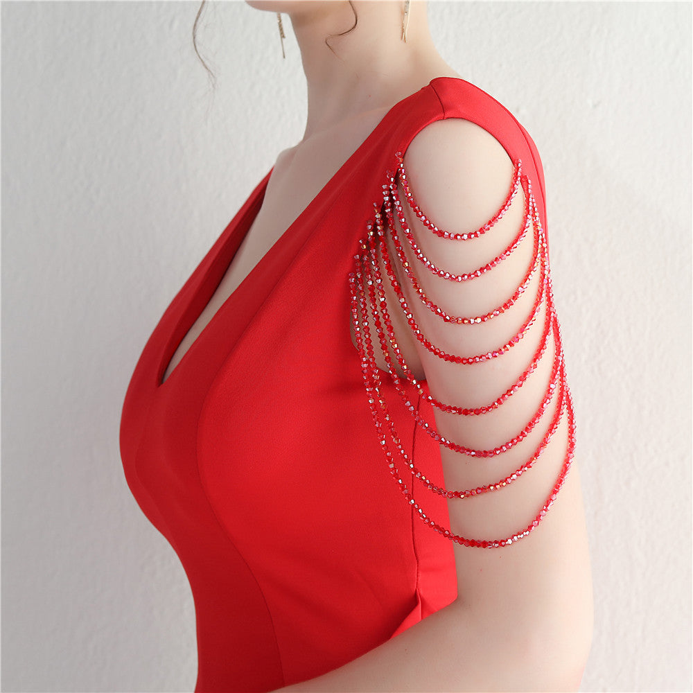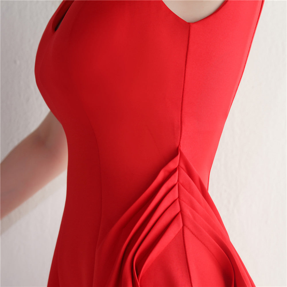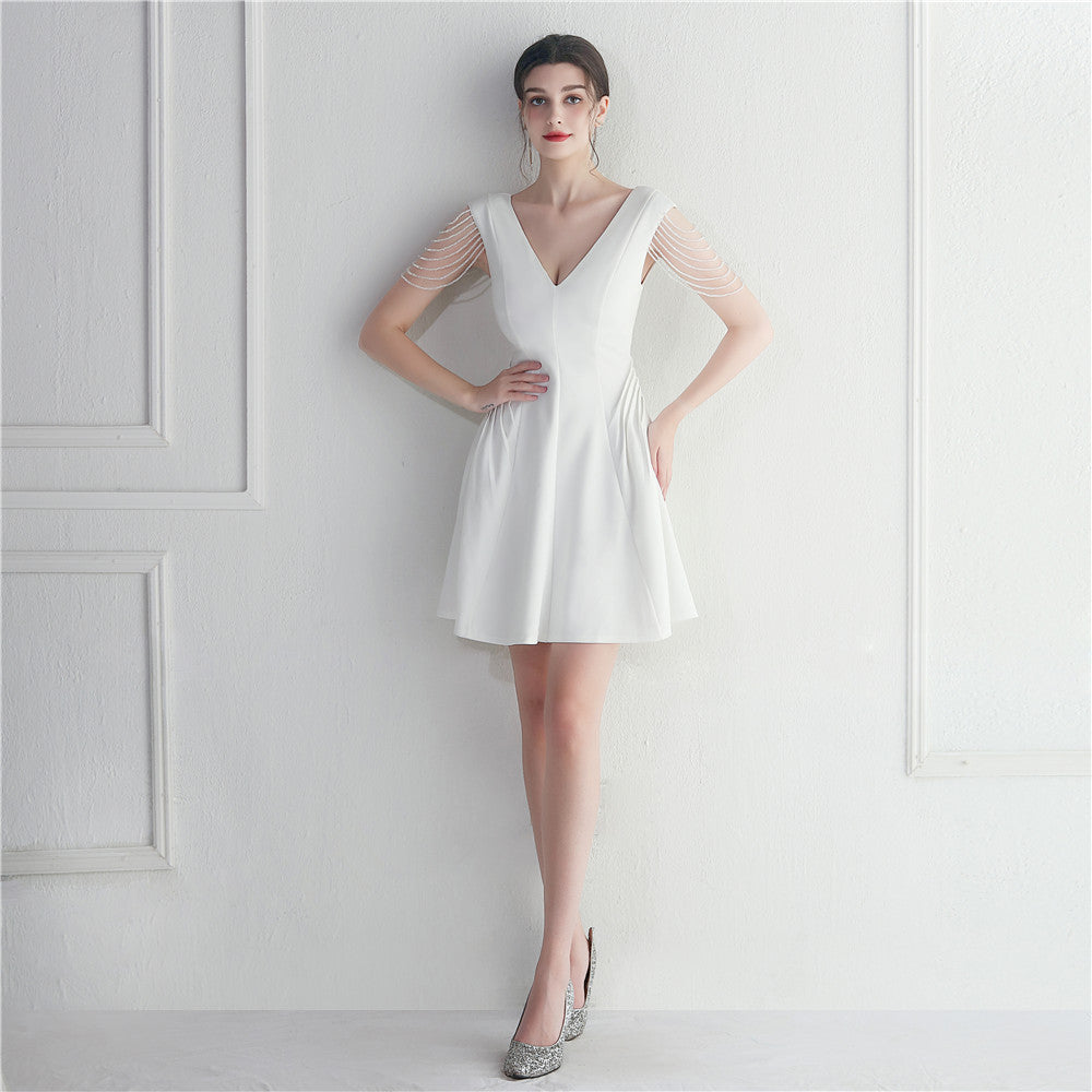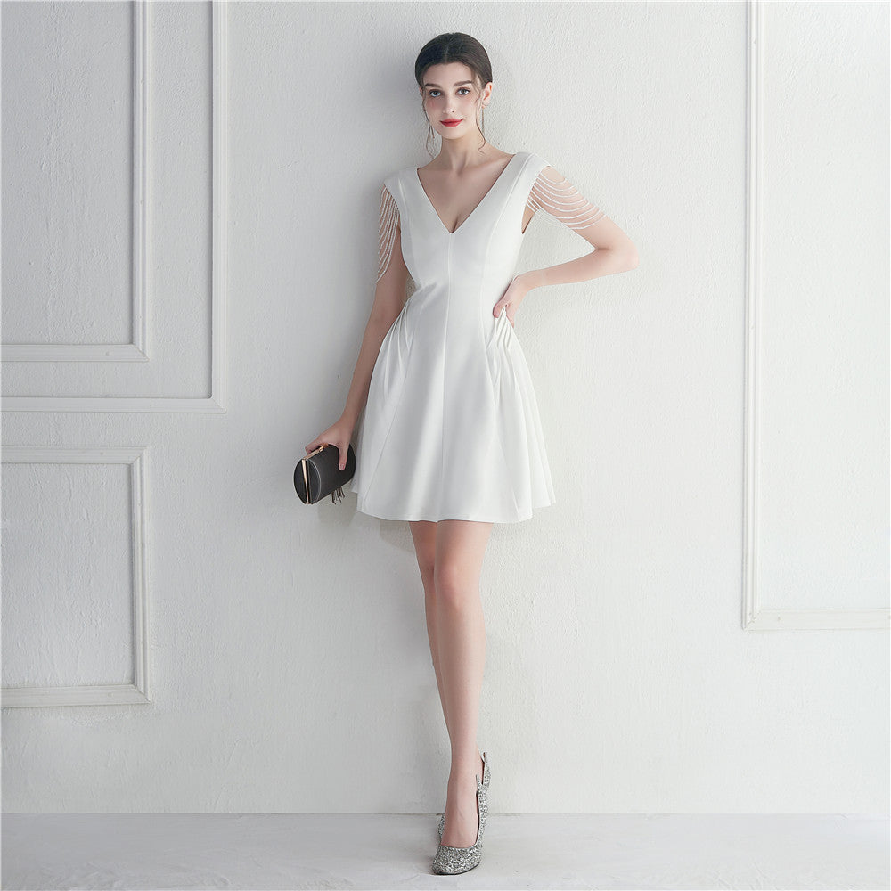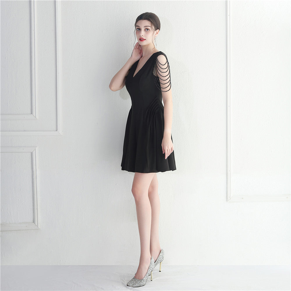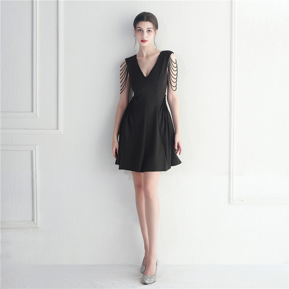 The dress offers a clean A-line silhouette with a short length. A V-neck, sleeveless bodice and rhinestone embellishments sit against a streamlined form with a discreet back zipper.