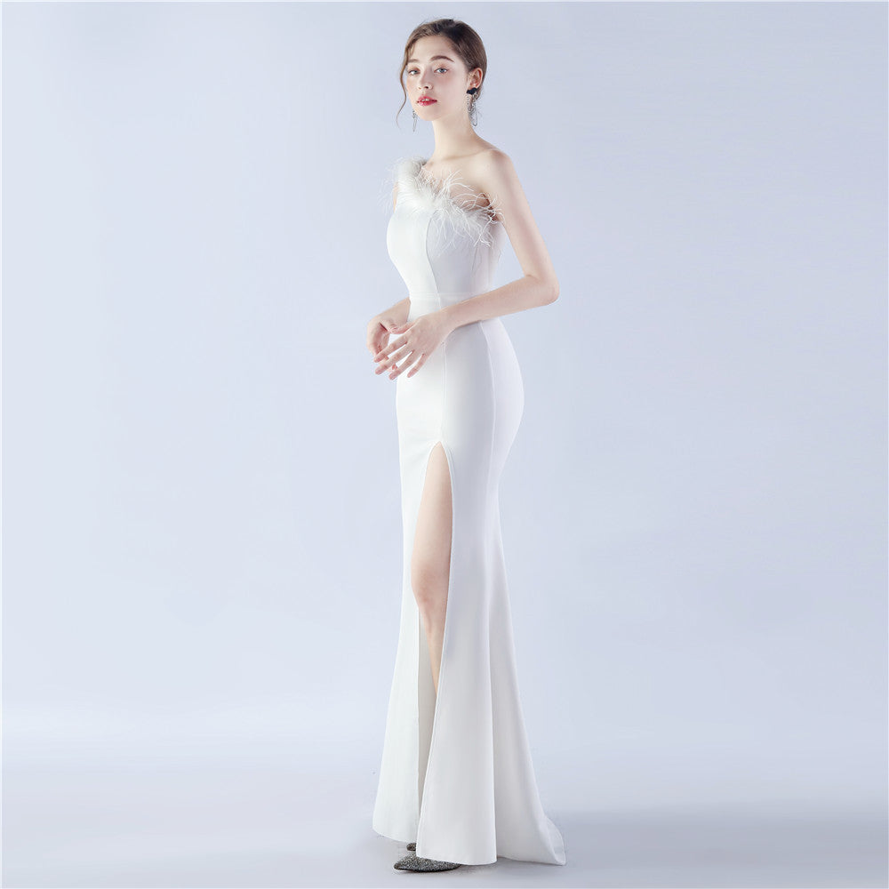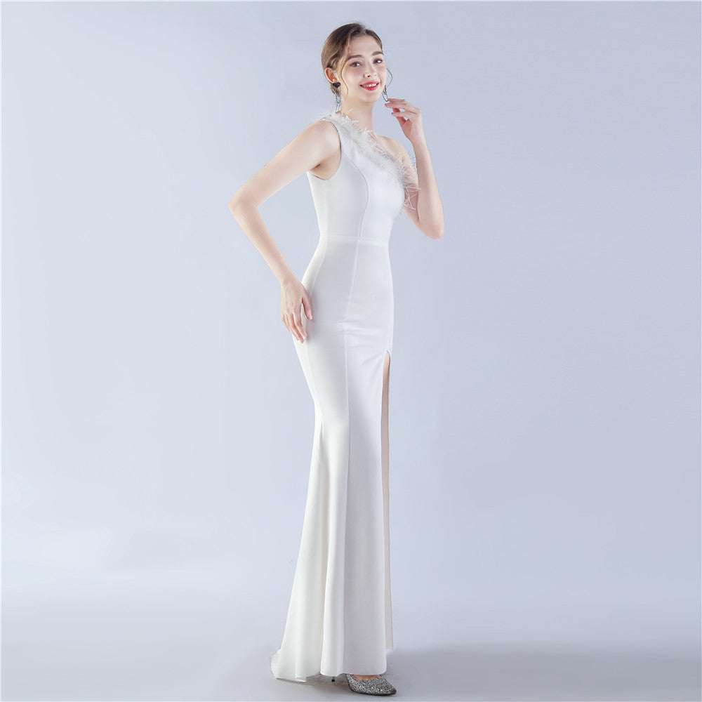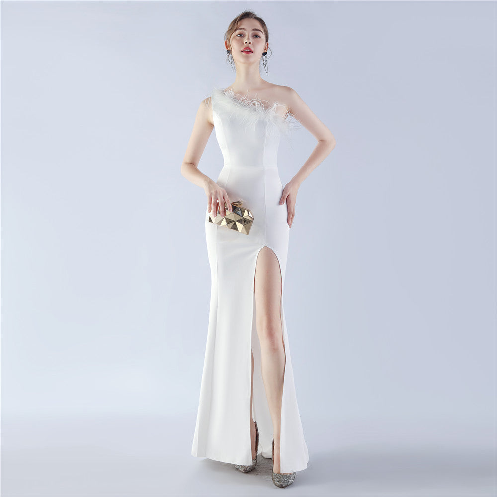An asymmetric one-shoulder maxi with a clean, sculpted line. Feather accents and a front split with a hidden zipper define the refined silhouette.