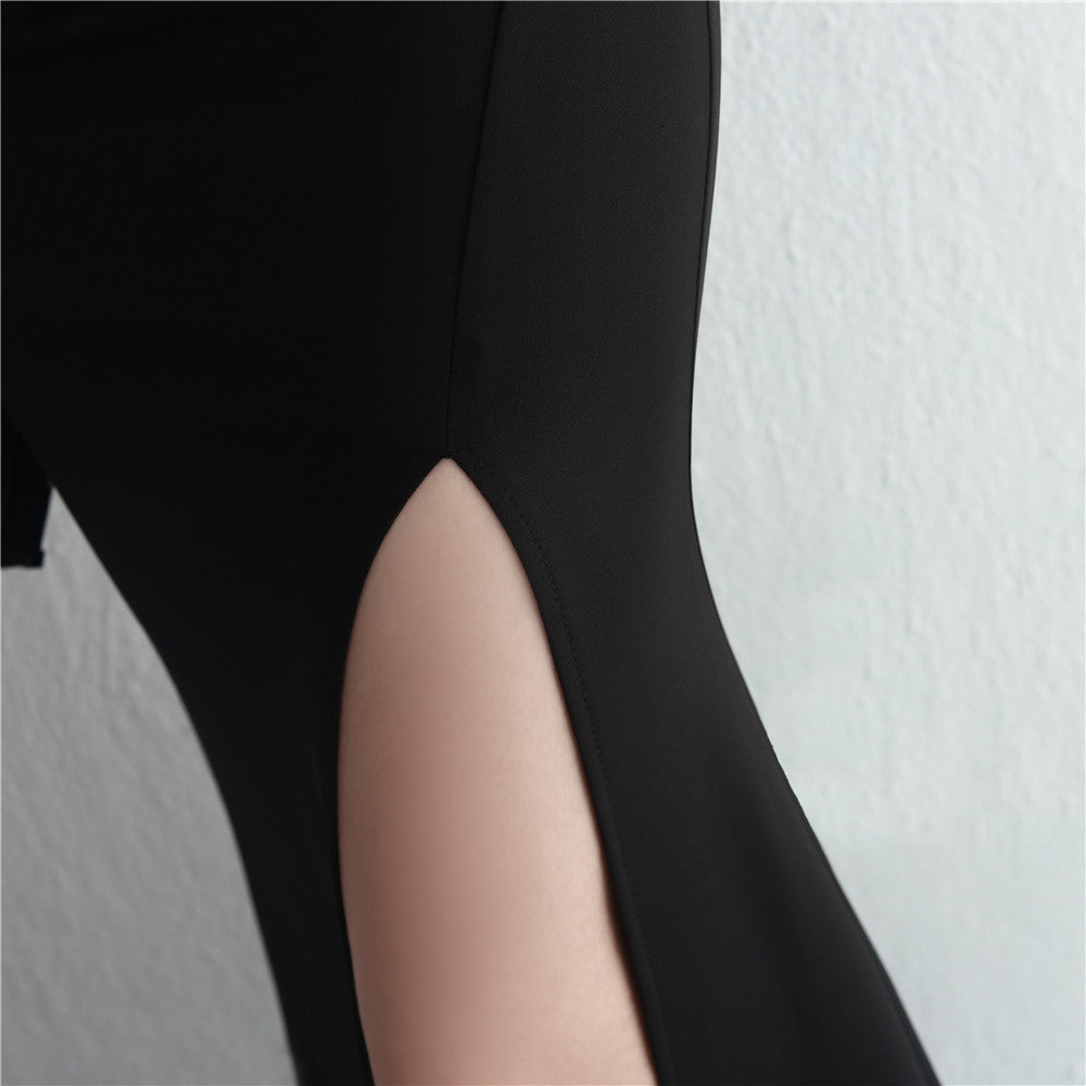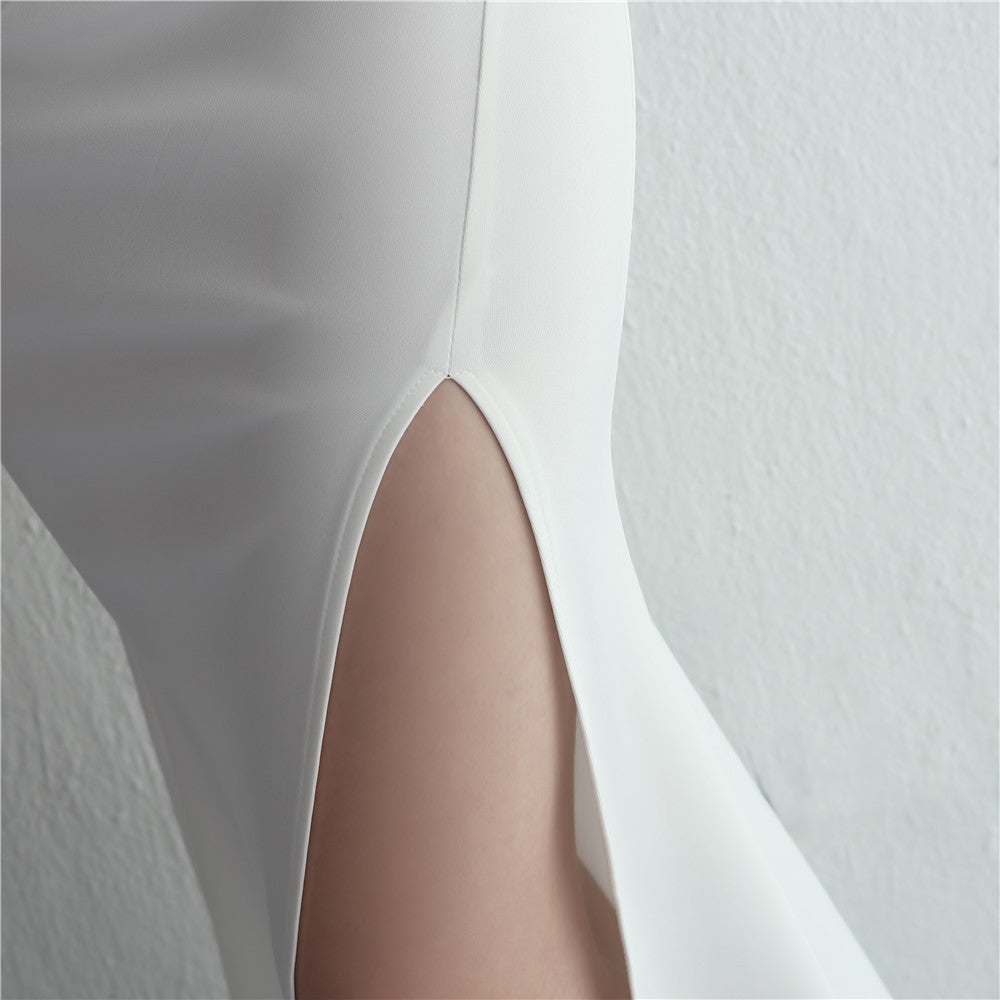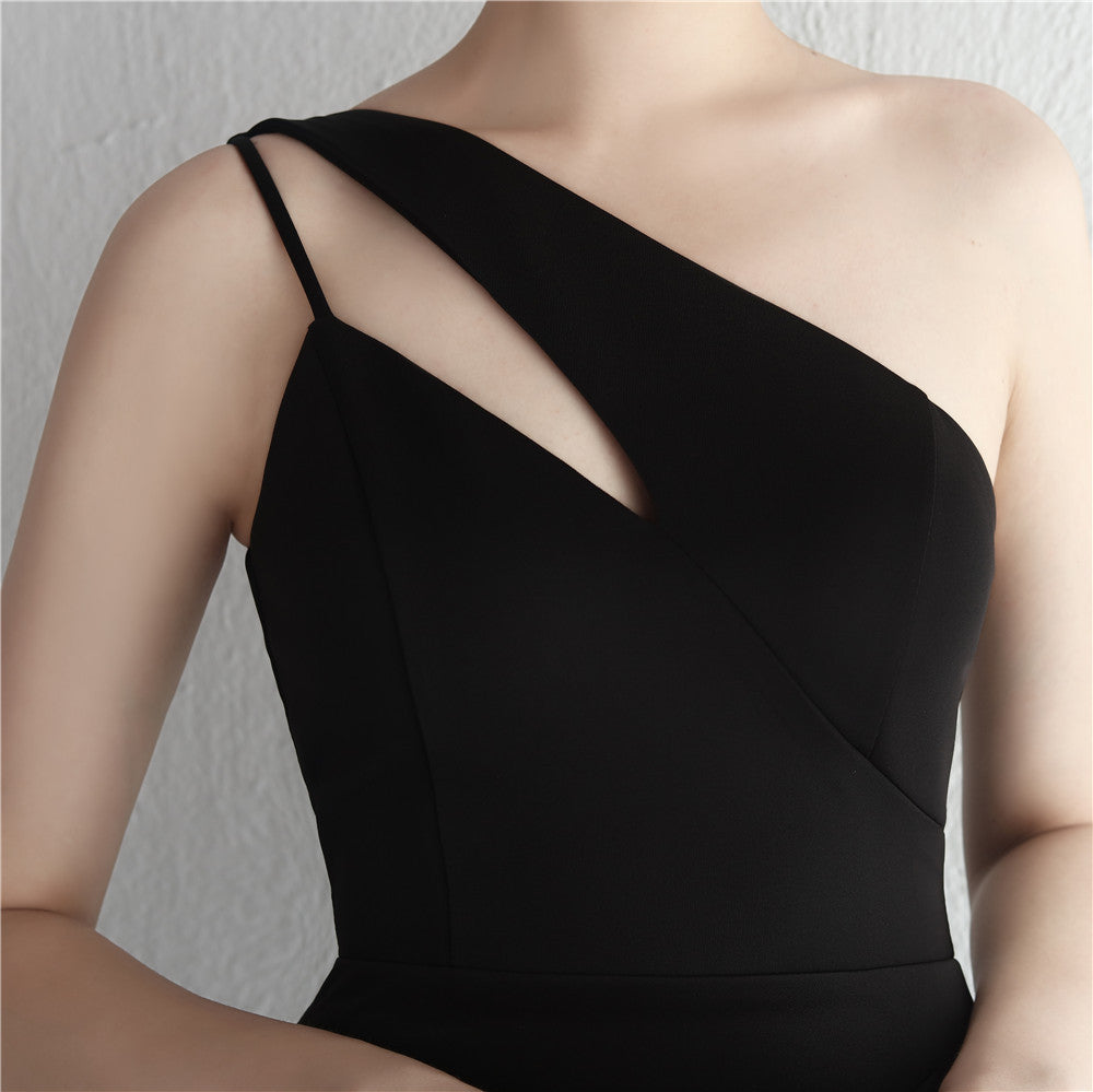 A one-shoulder maxi dress with a clean, column silhouette. It features an asymmetric split and a discreet back zipper.