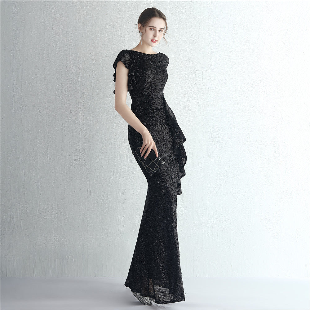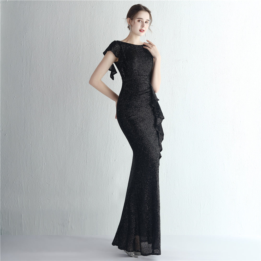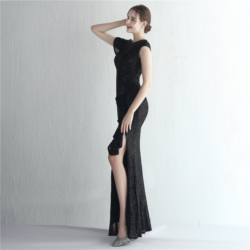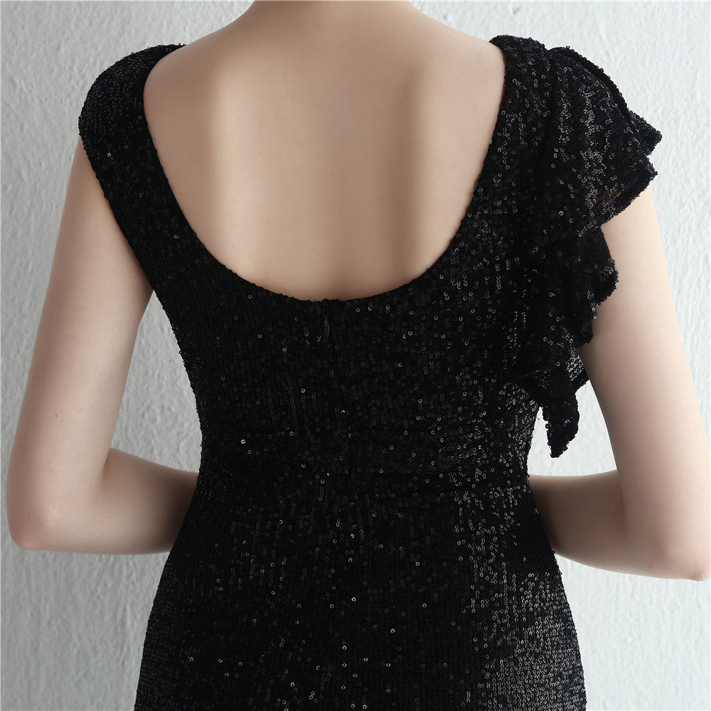 A sleek maxi with a fishtail hem and a sleeveless, crew-neck silhouette. Sequins and a subtle ruffle along the split add motion to the streamlined design.