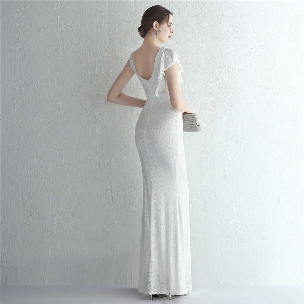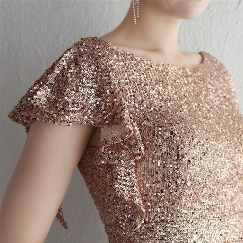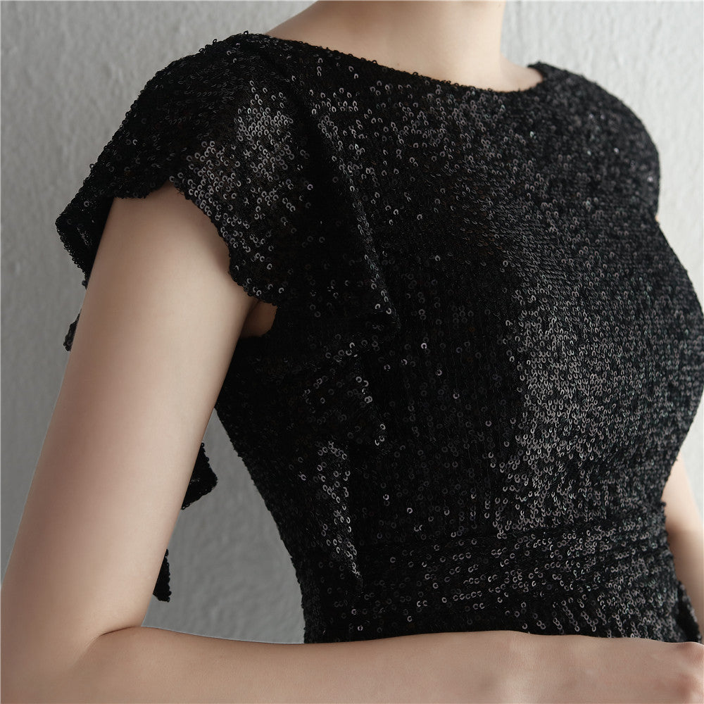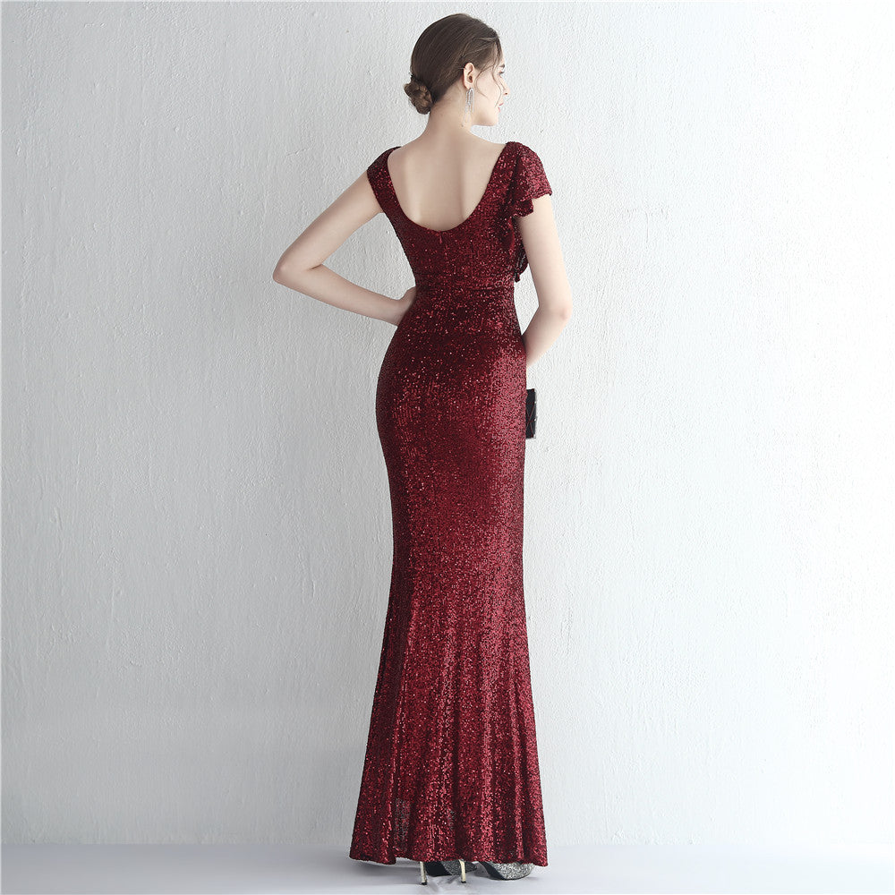 A sleek maxi with a fishtail hem and a sleeveless, crew-neck silhouette. Sequins and a subtle ruffle along the split add motion to the streamlined design.