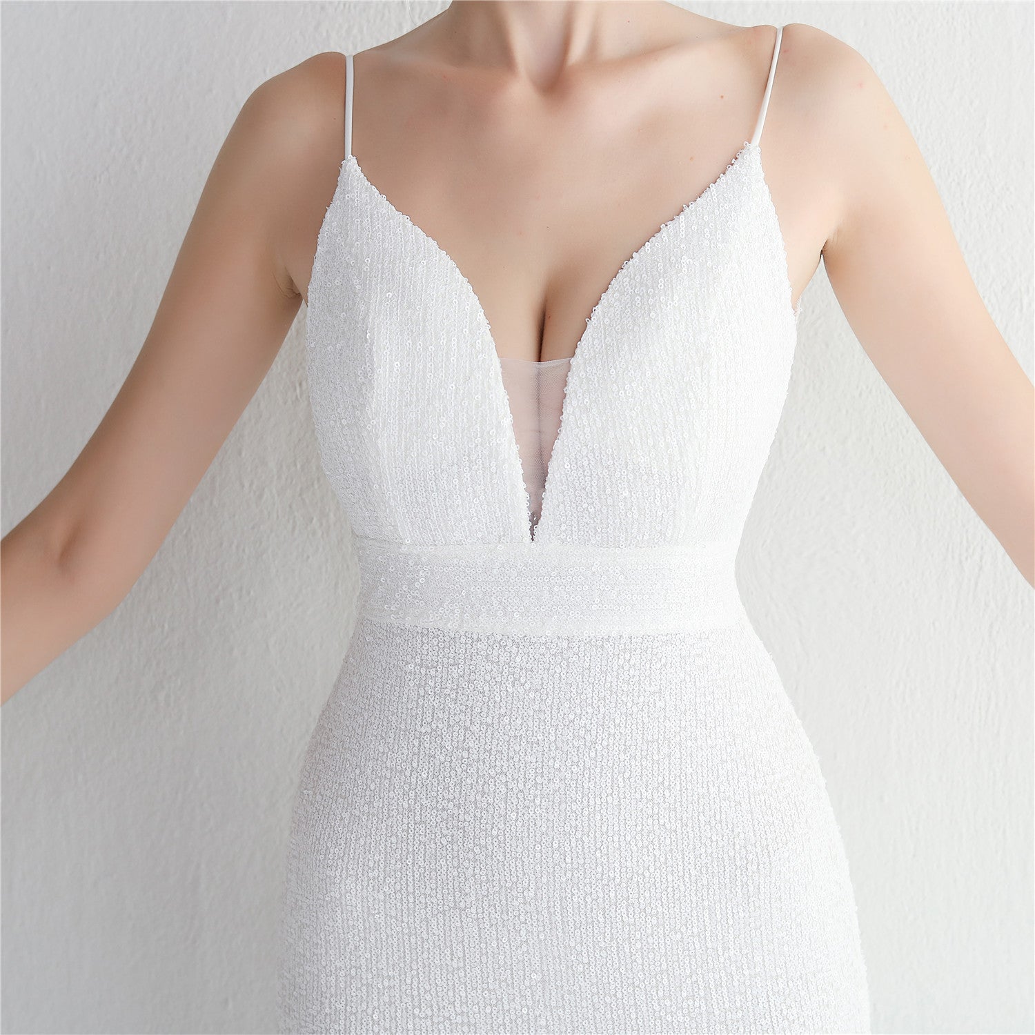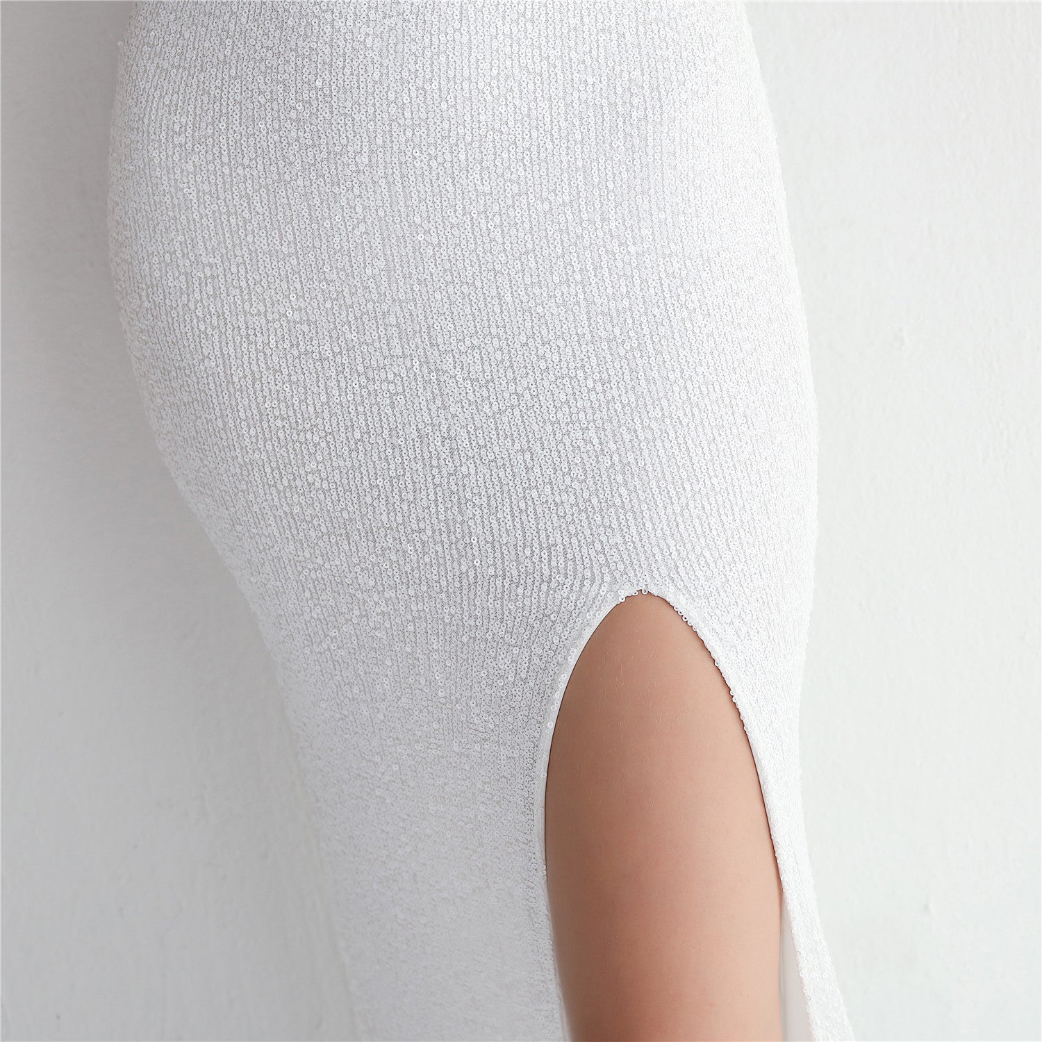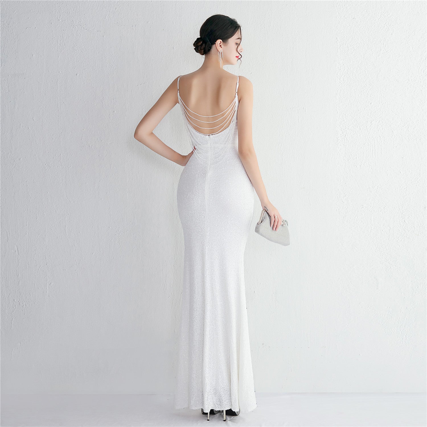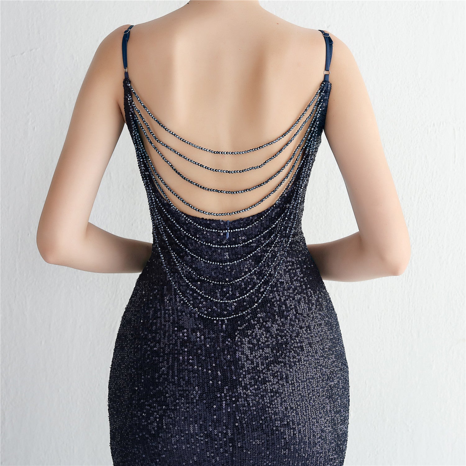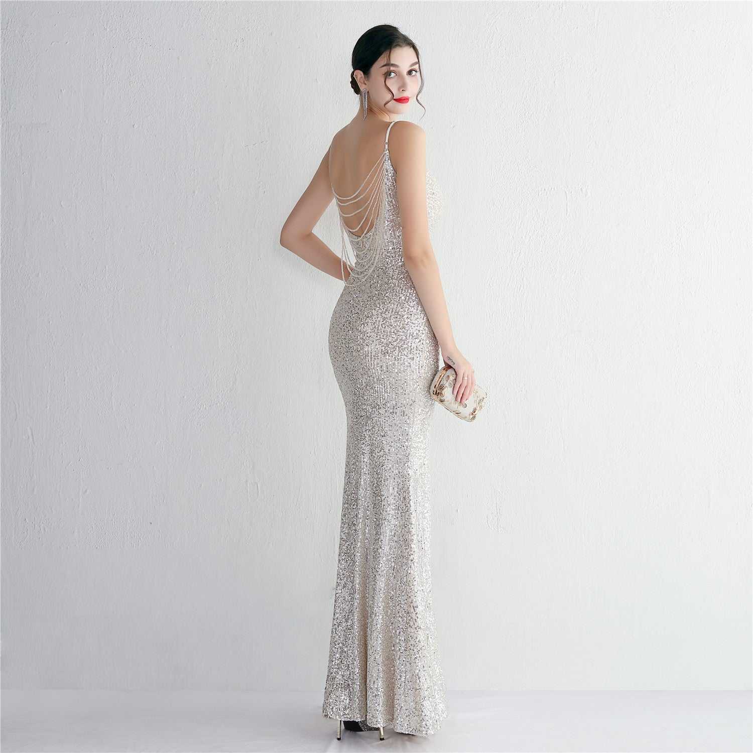 Polyester creates a sequin-beaded fishtail maxi with a slim silhouette. The V-neck and sleeveless profile showcase the beadwork, with a front split enhancing movement.
