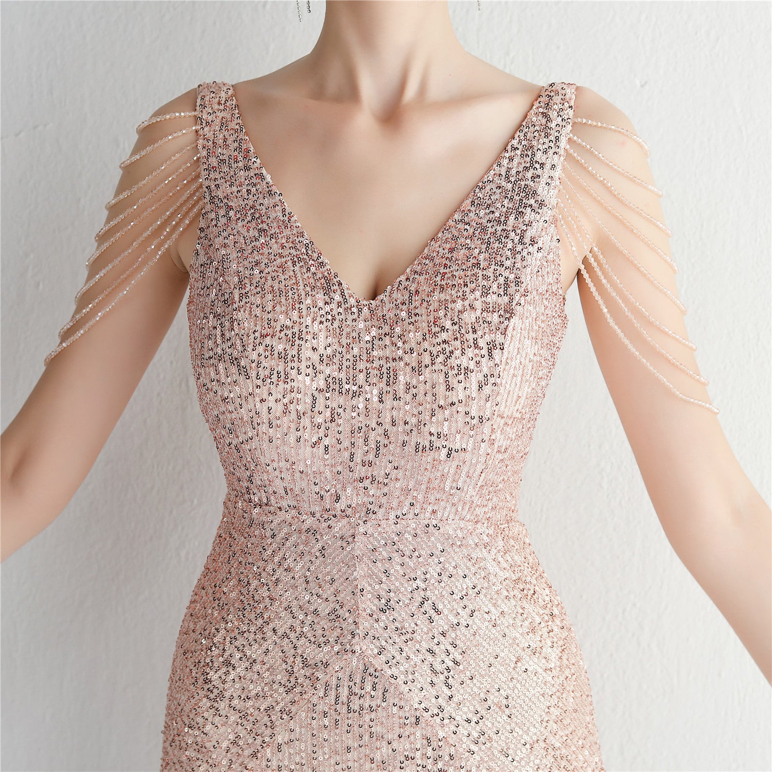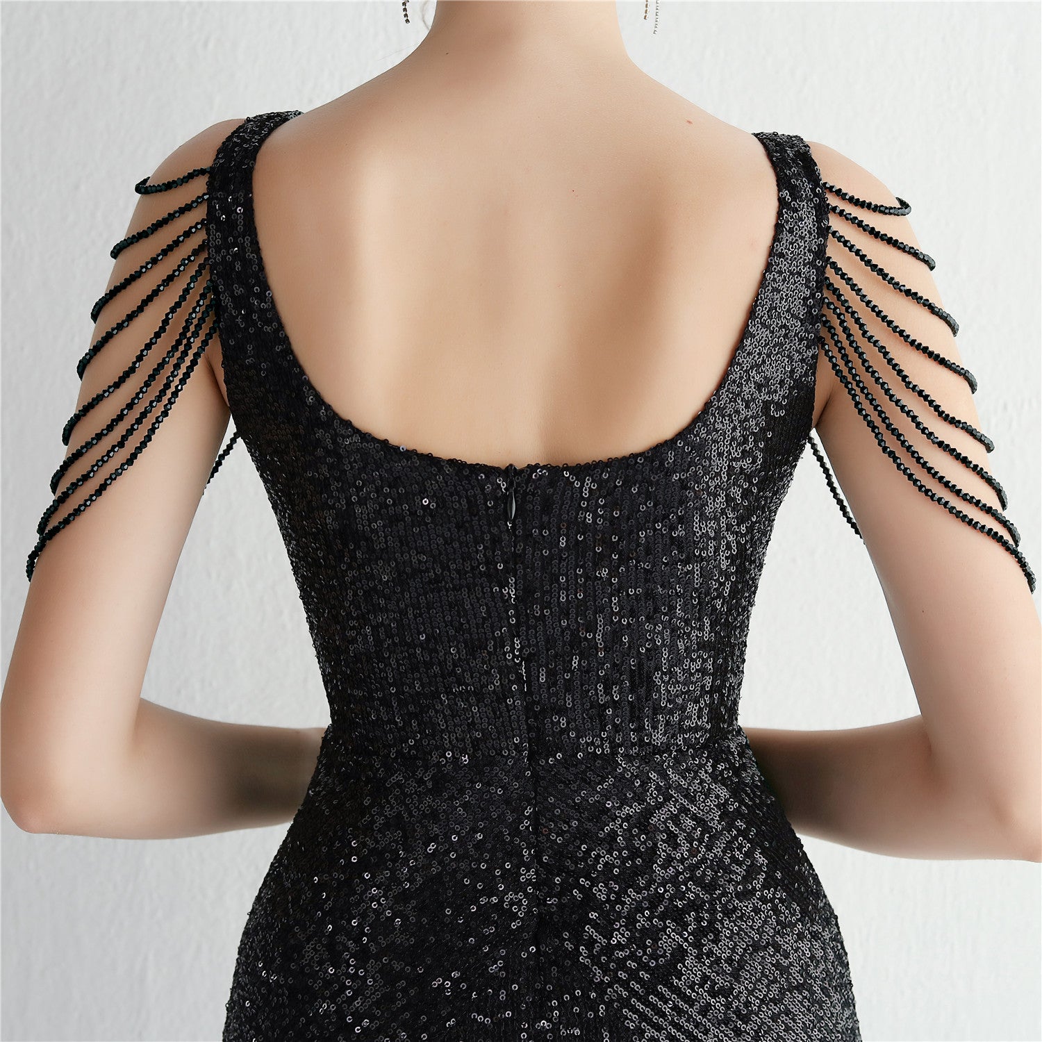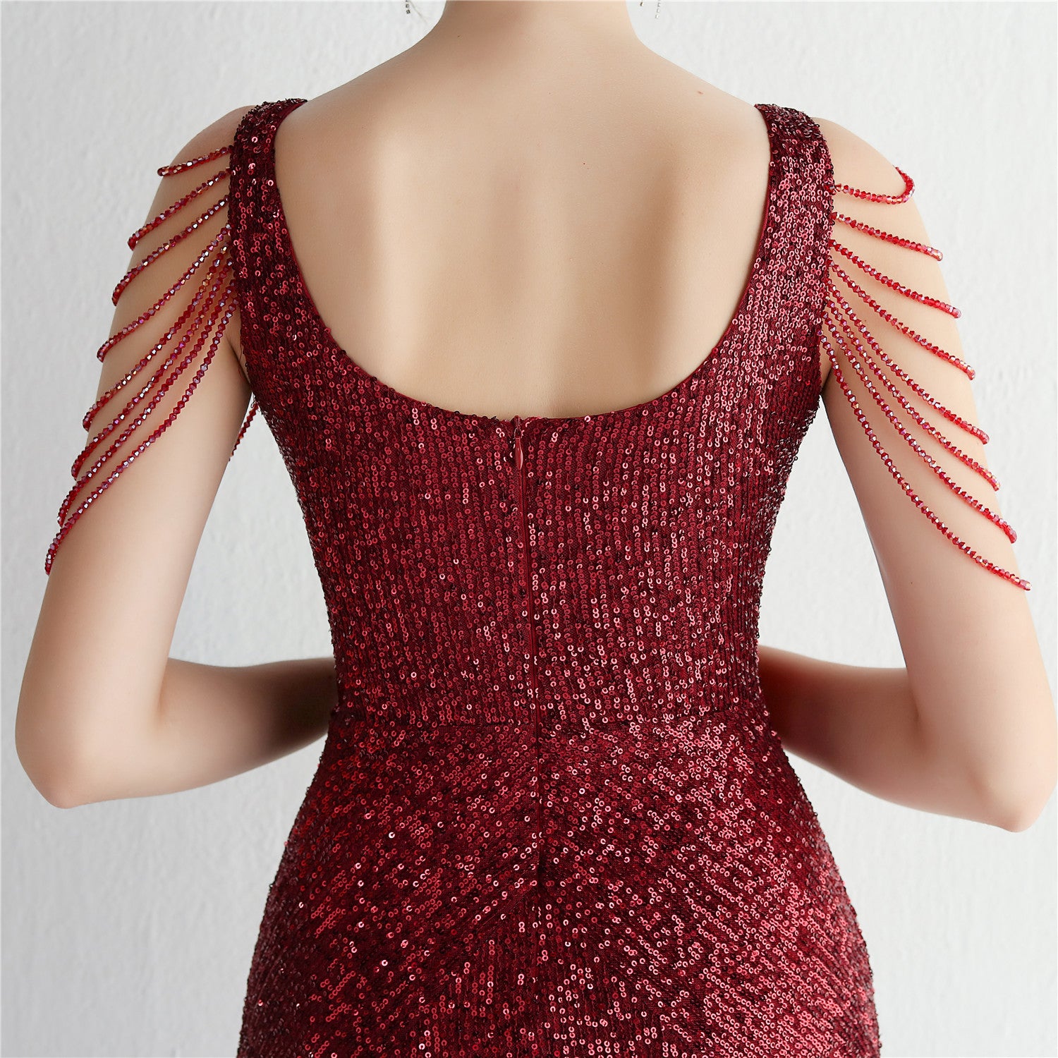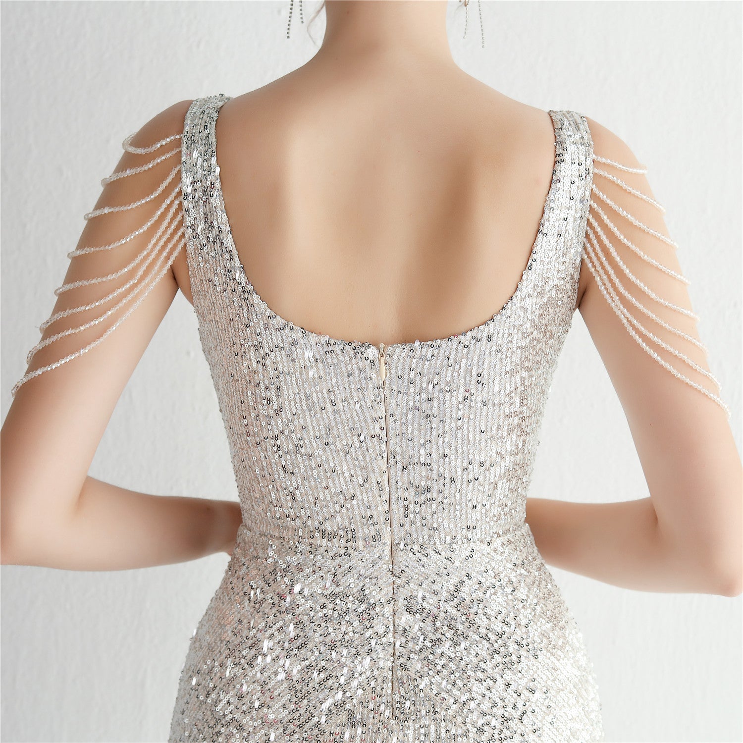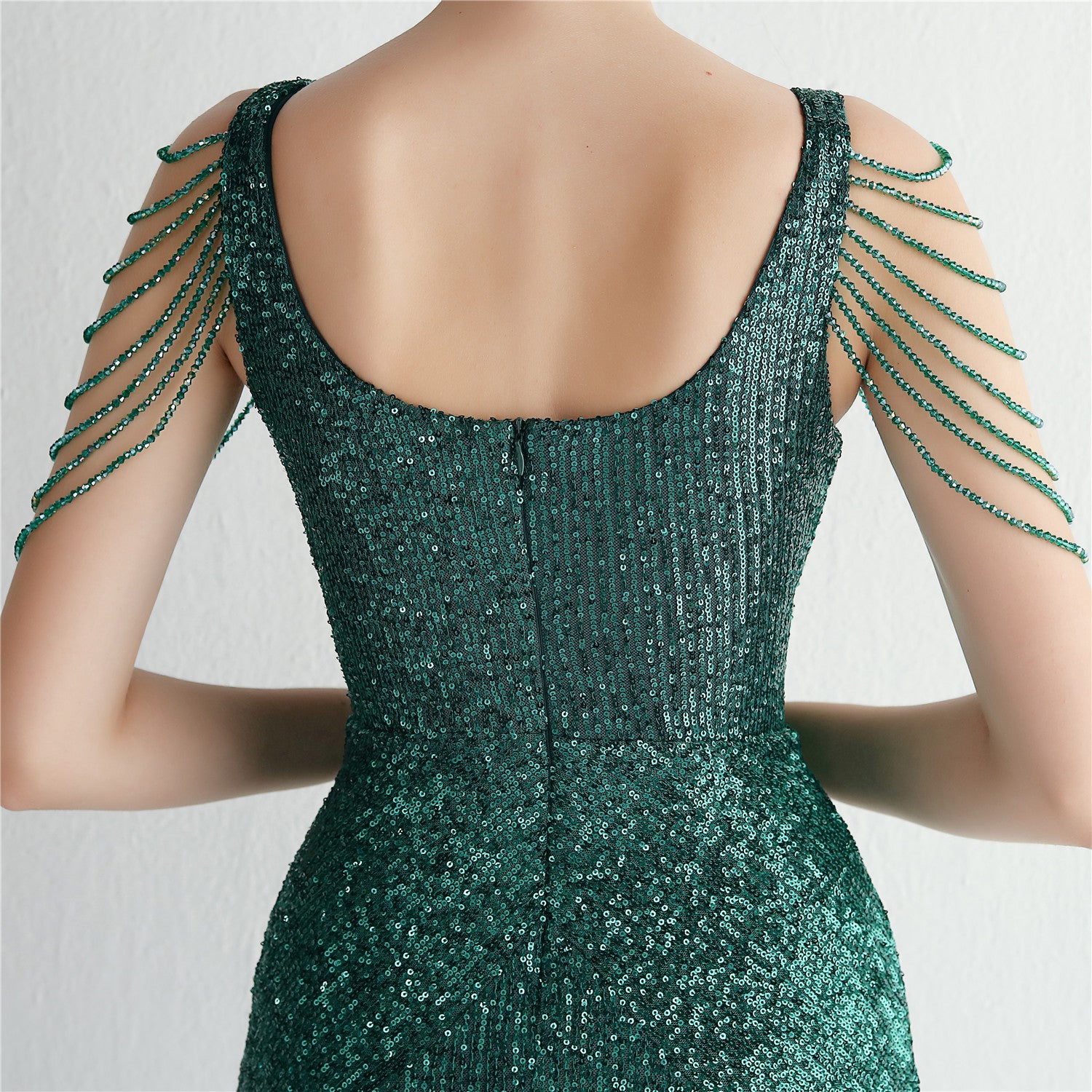 A slender fishtail maxi with a clean, streamlined silhouette. A V-neckline frames the bodice while sequin fringe adds subtle embellishment.