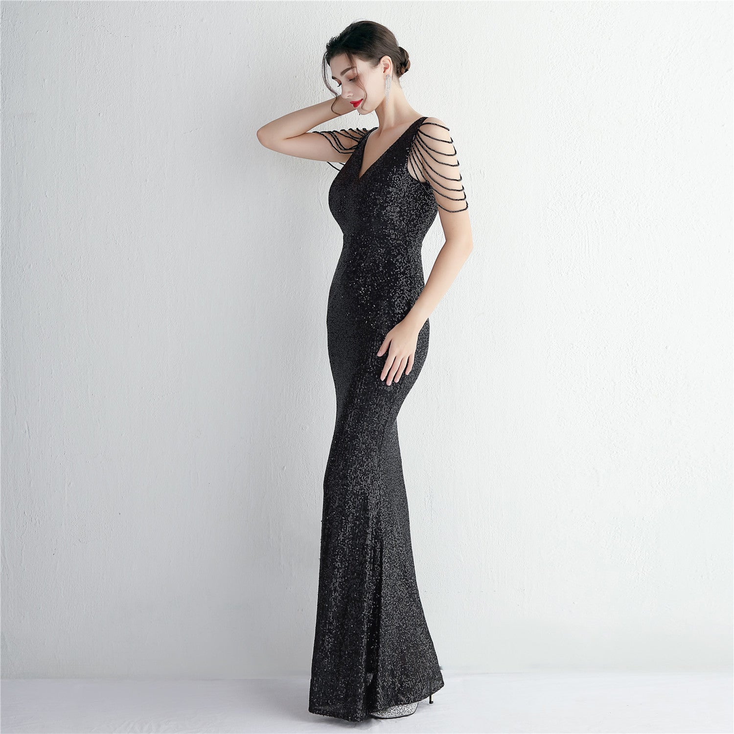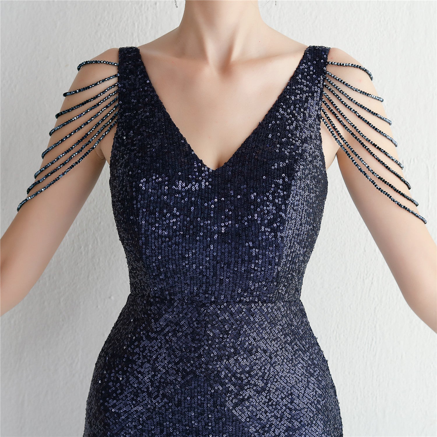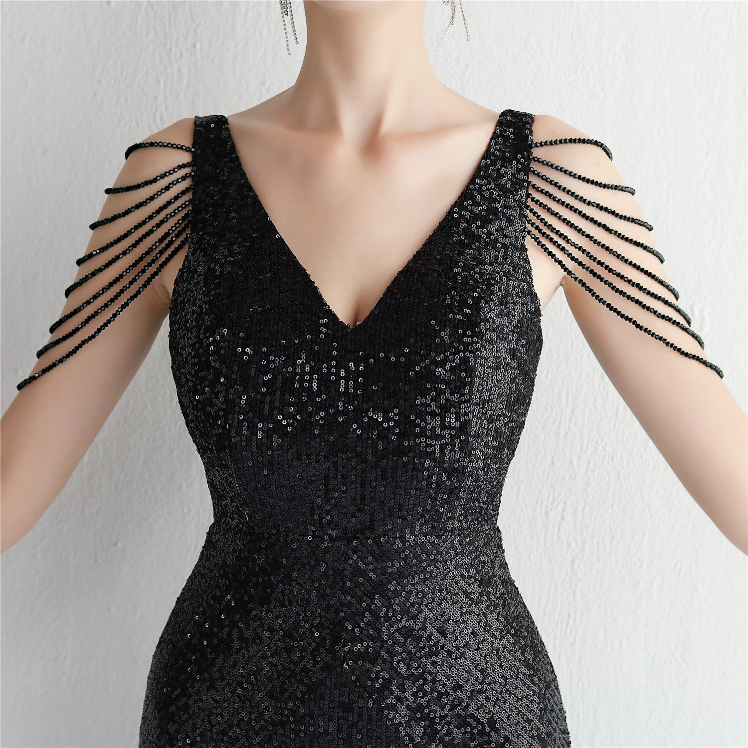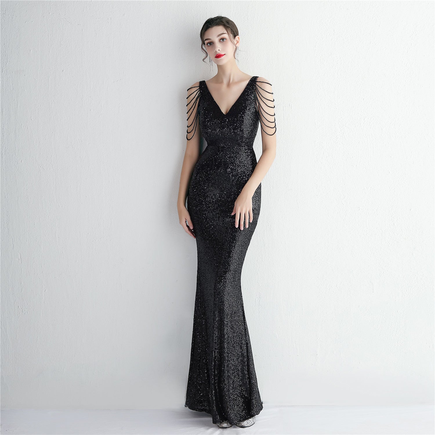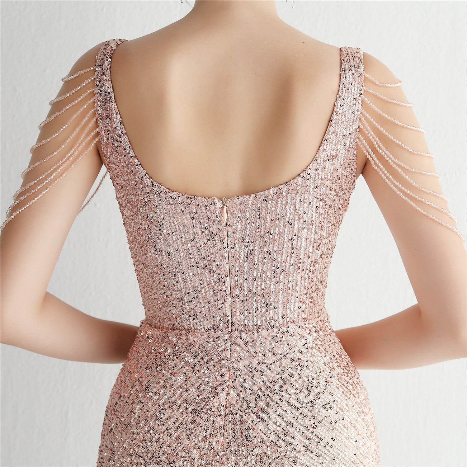 A slender fishtail maxi with a clean, streamlined silhouette. A V-neckline frames the bodice while sequin fringe adds subtle embellishment.