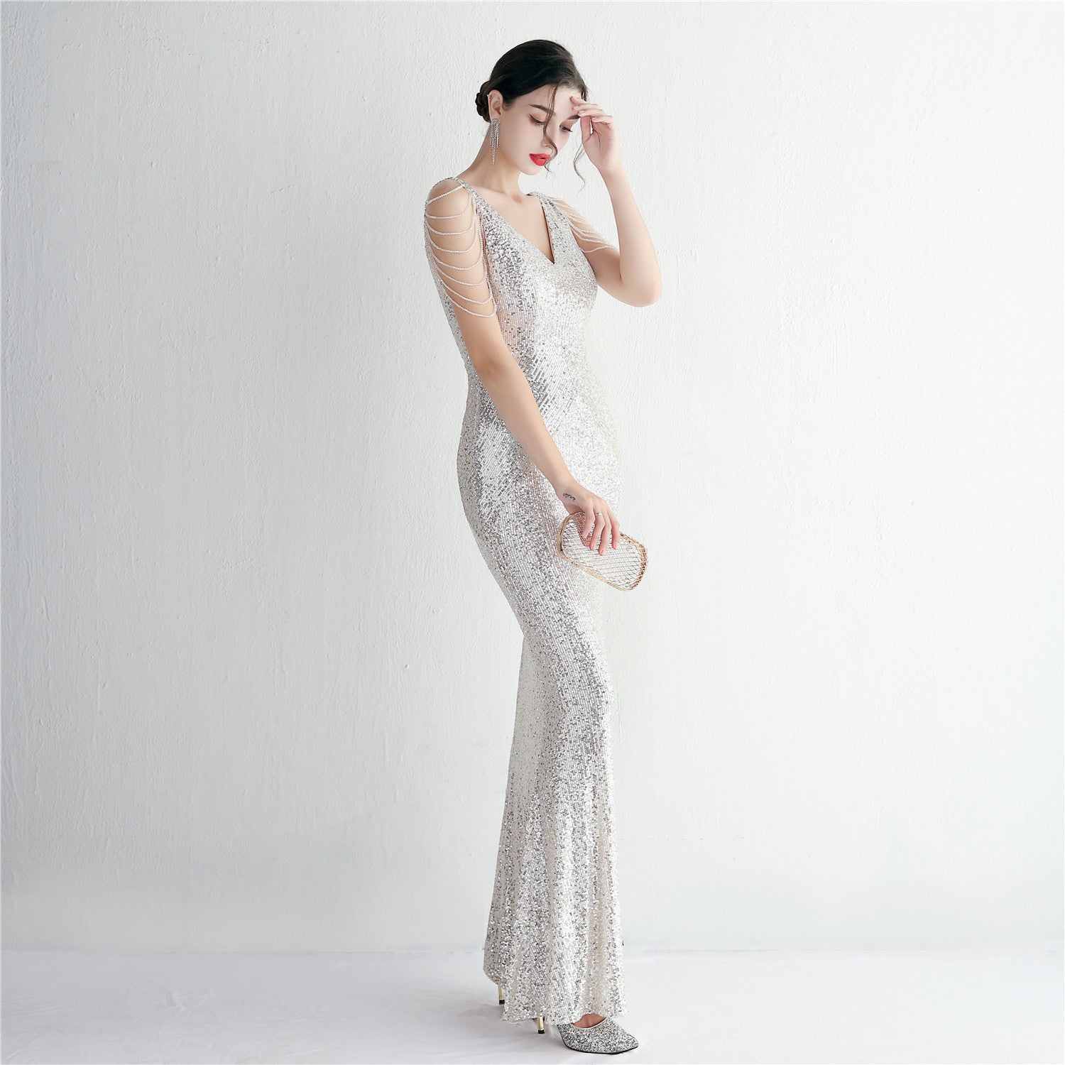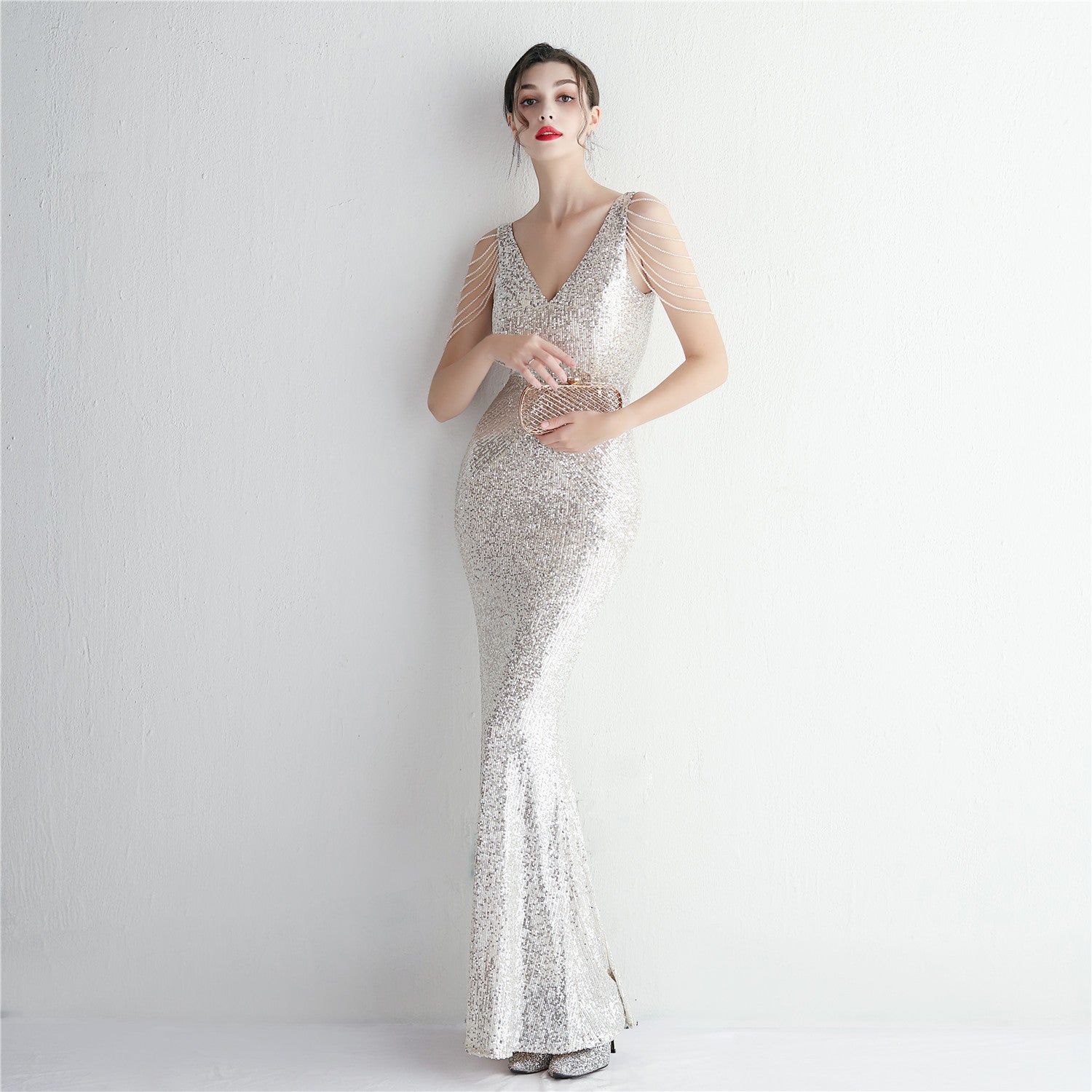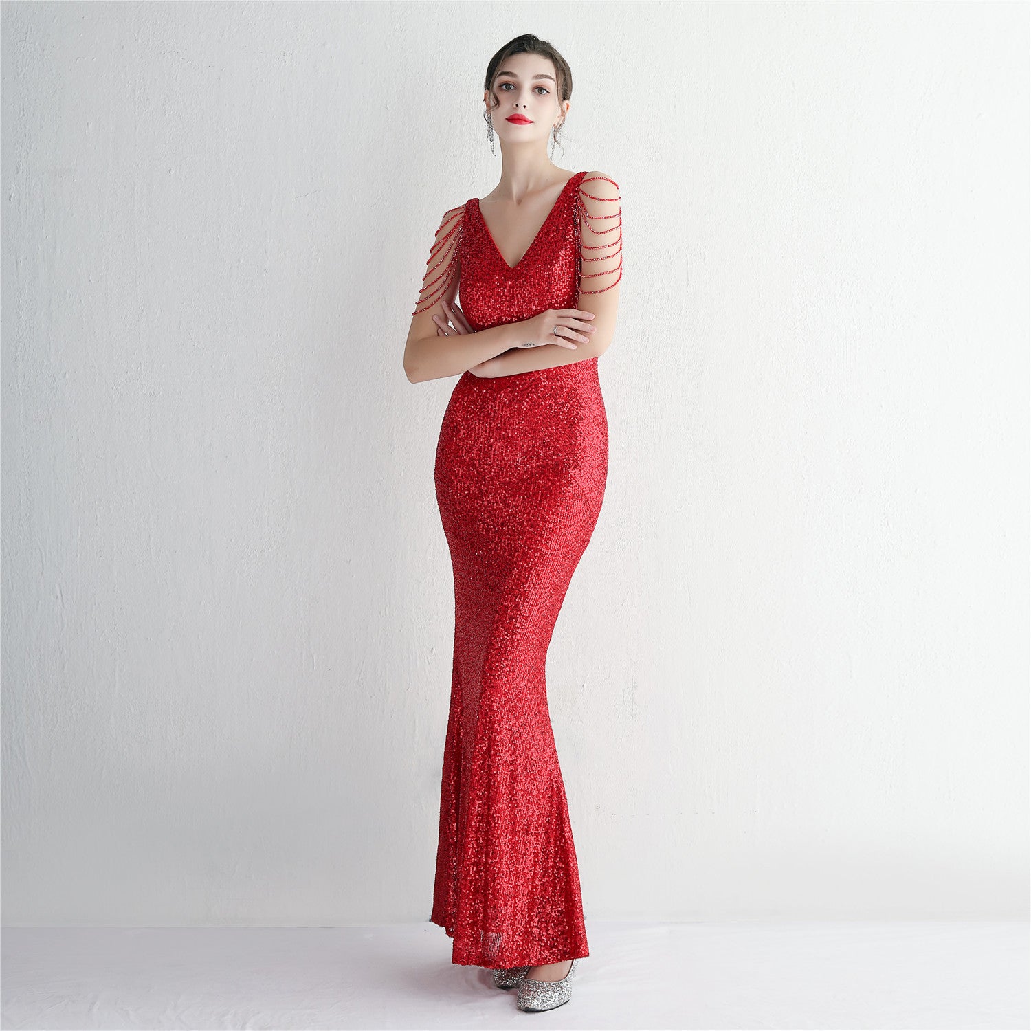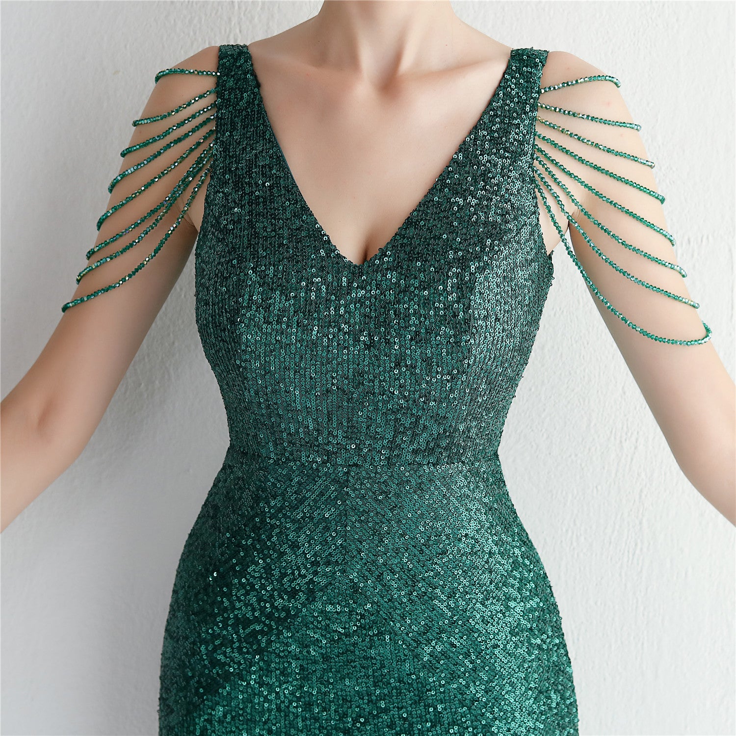 A slender fishtail maxi with a clean, streamlined silhouette. A V-neckline frames the bodice while sequin fringe adds subtle embellishment.