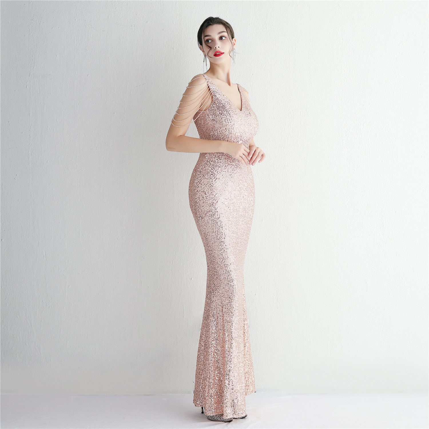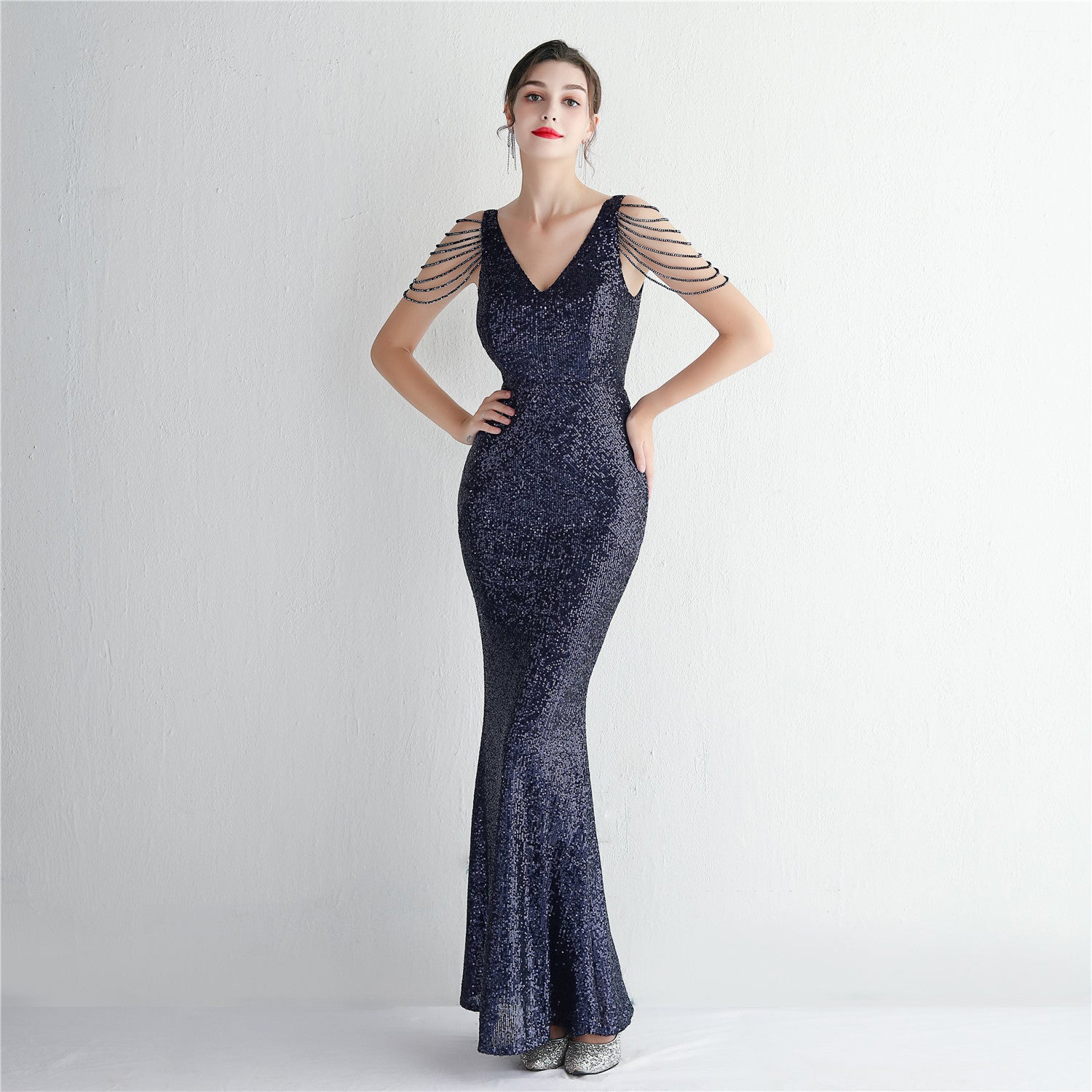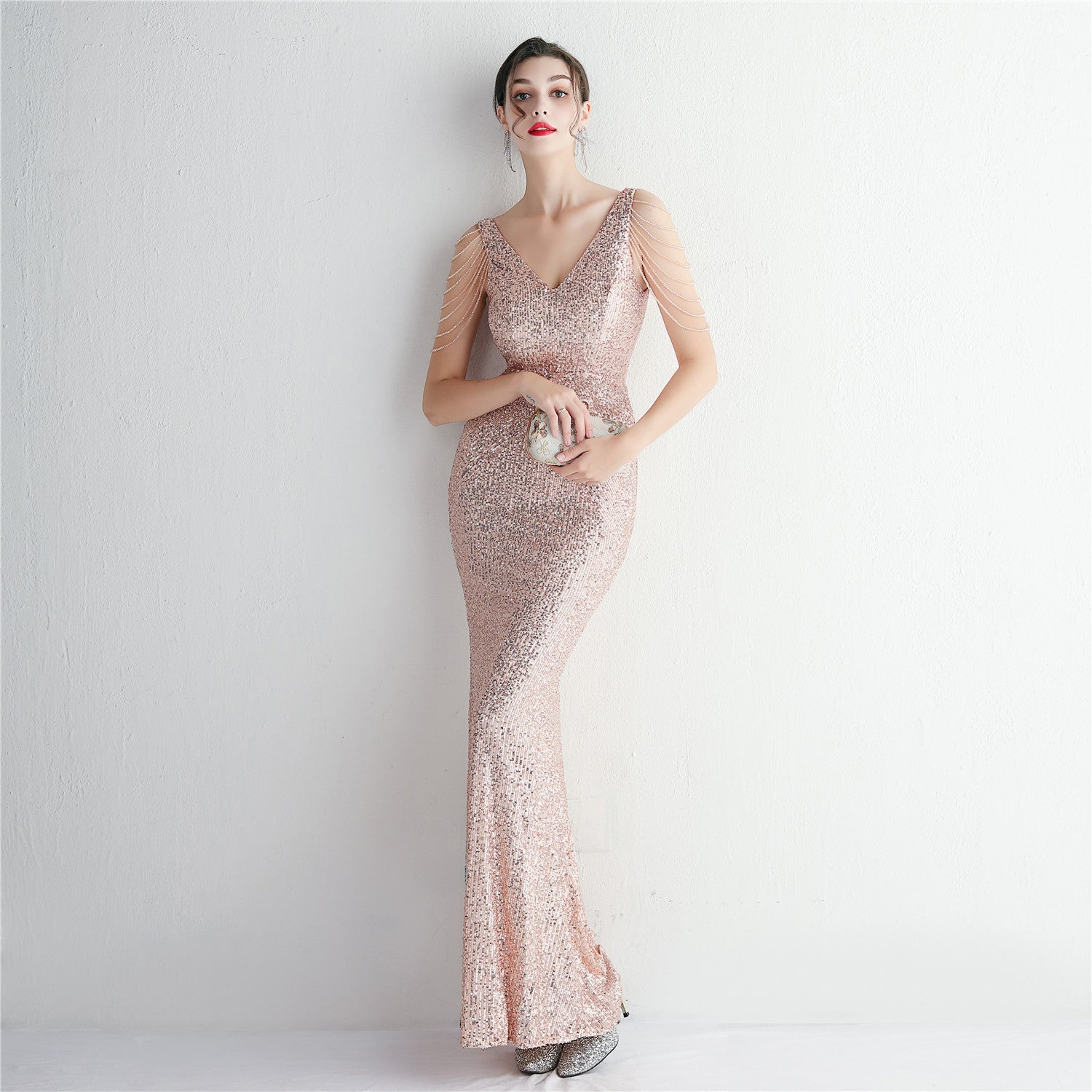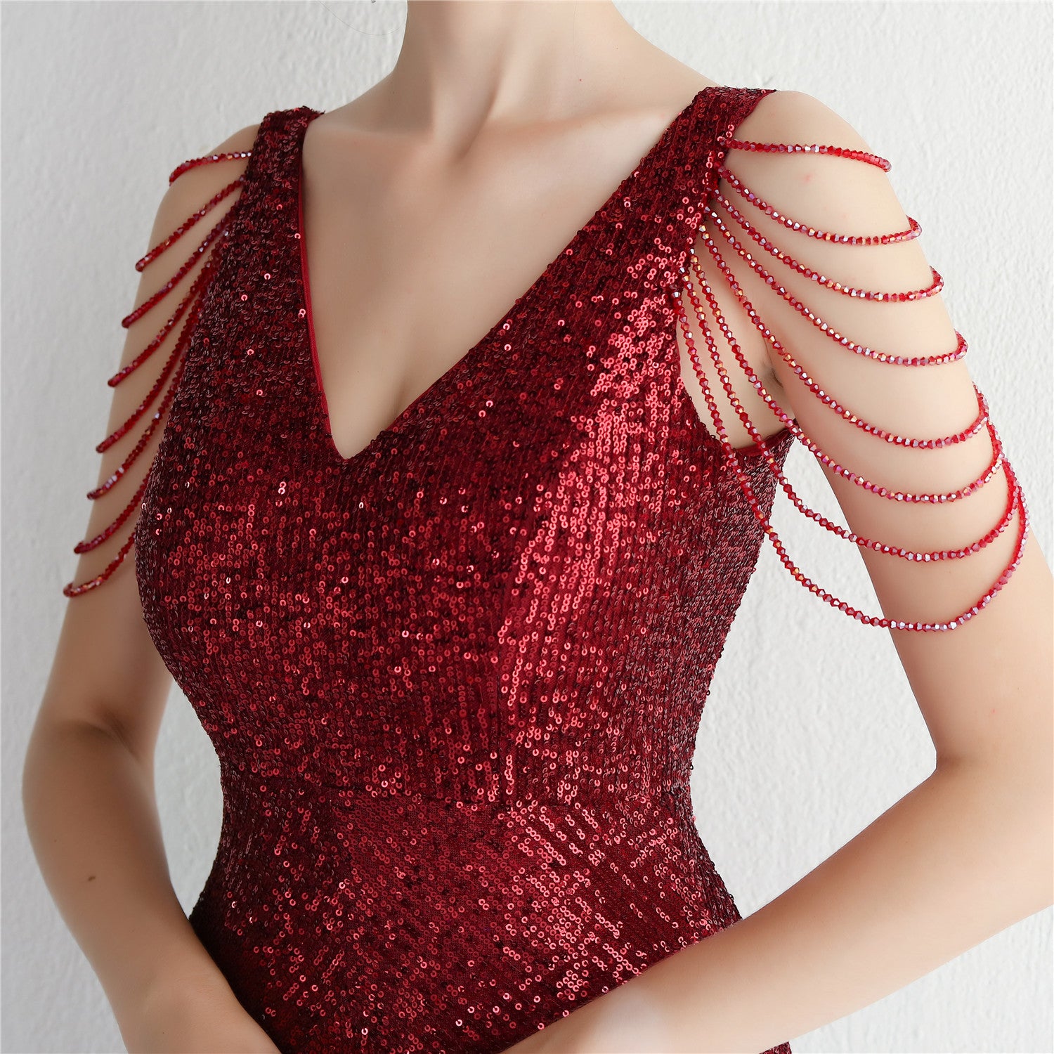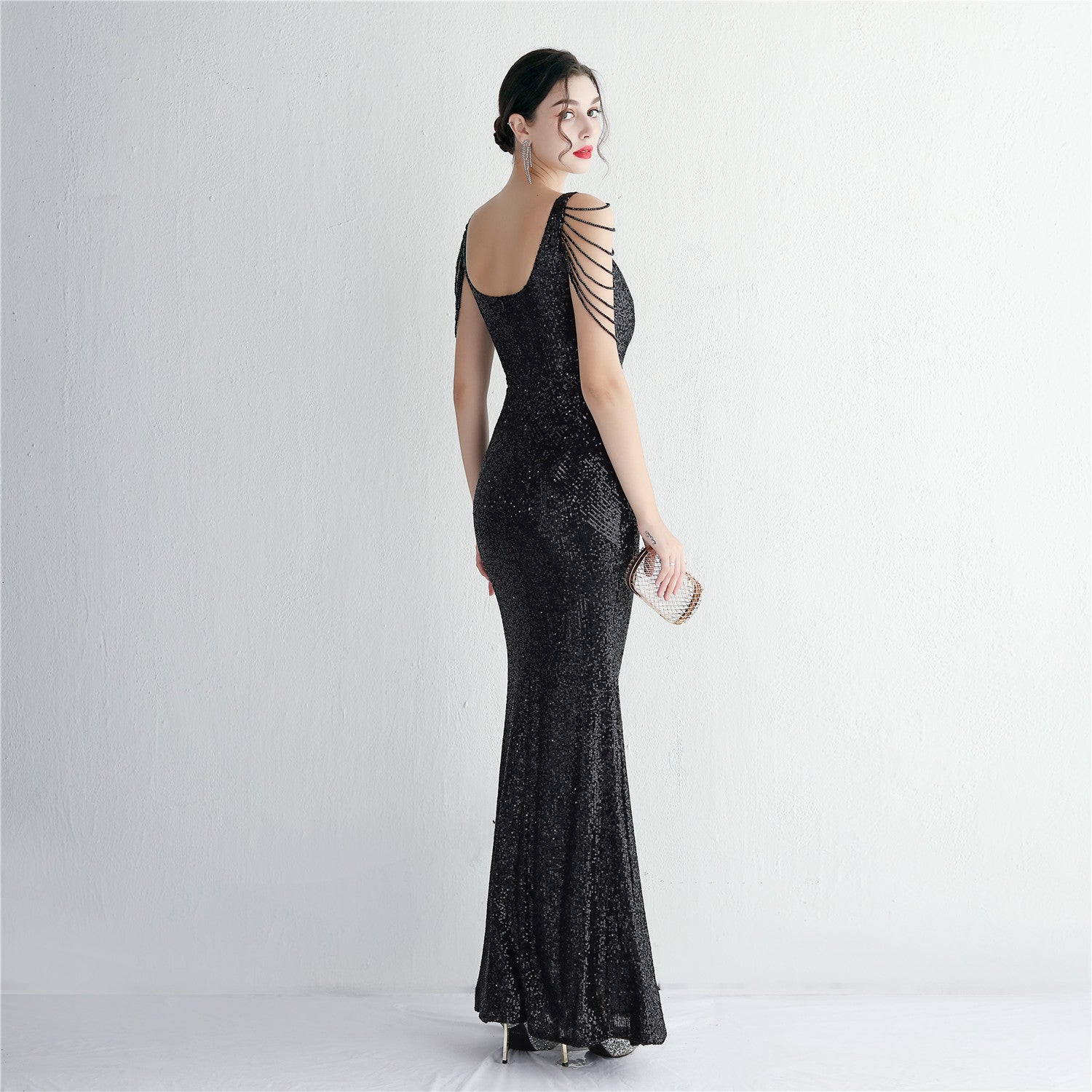 A slender fishtail maxi with a clean, streamlined silhouette. A V-neckline frames the bodice while sequin fringe adds subtle embellishment.