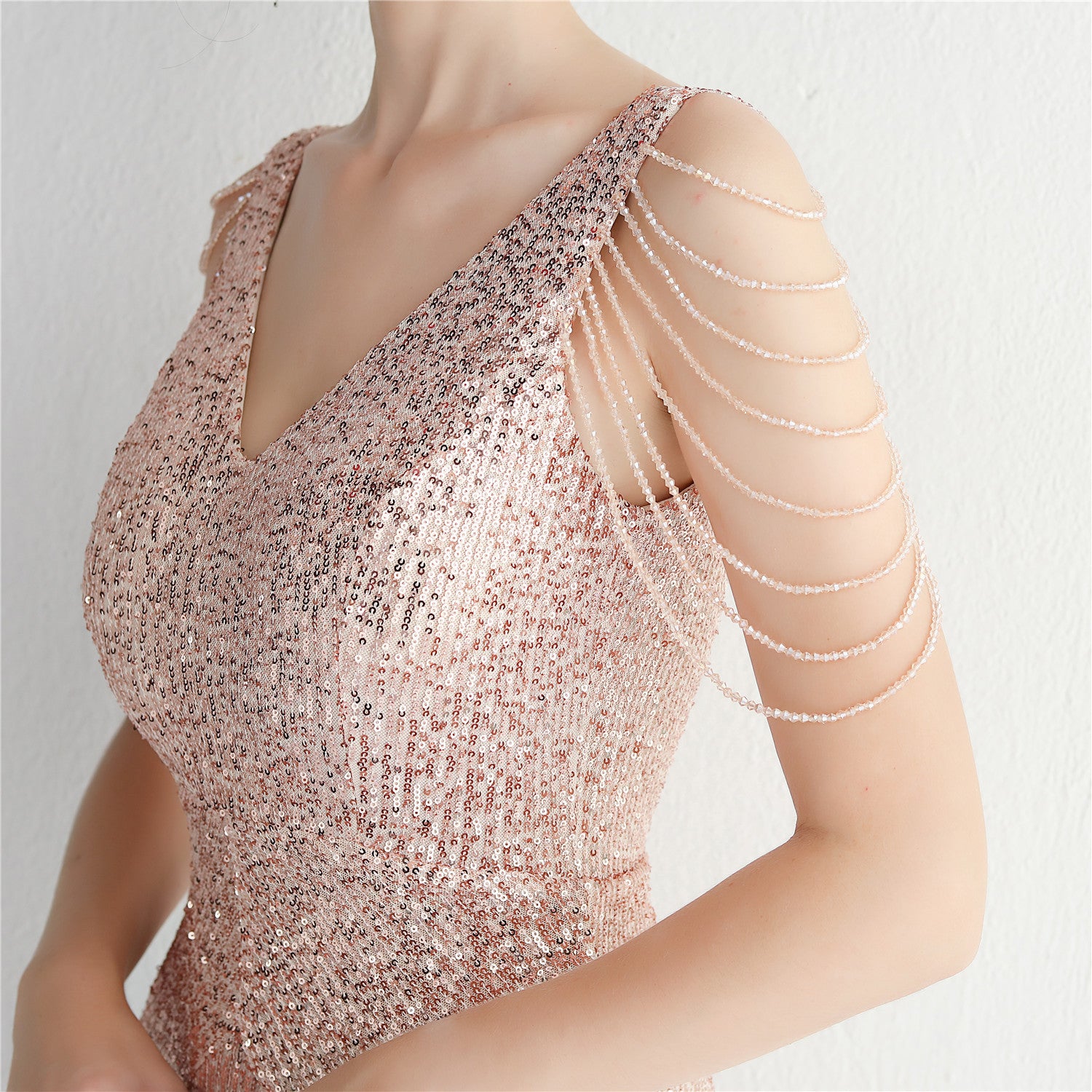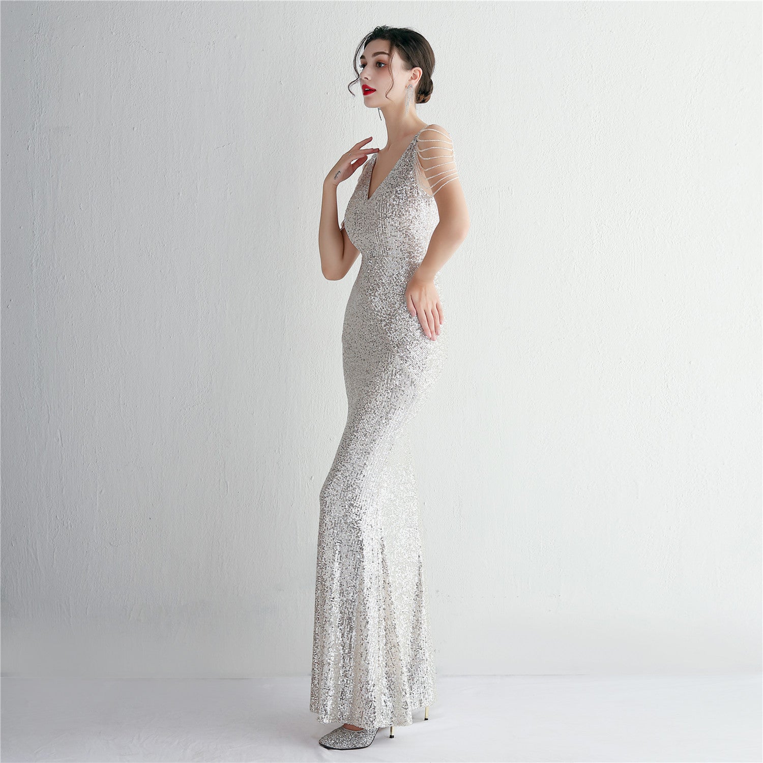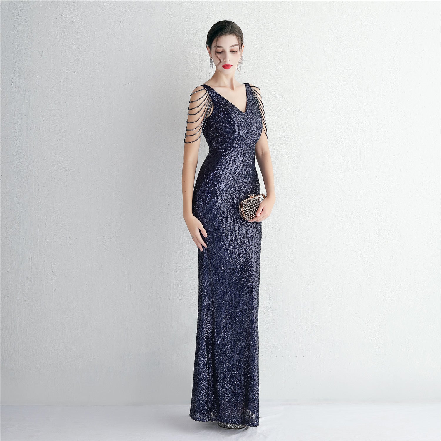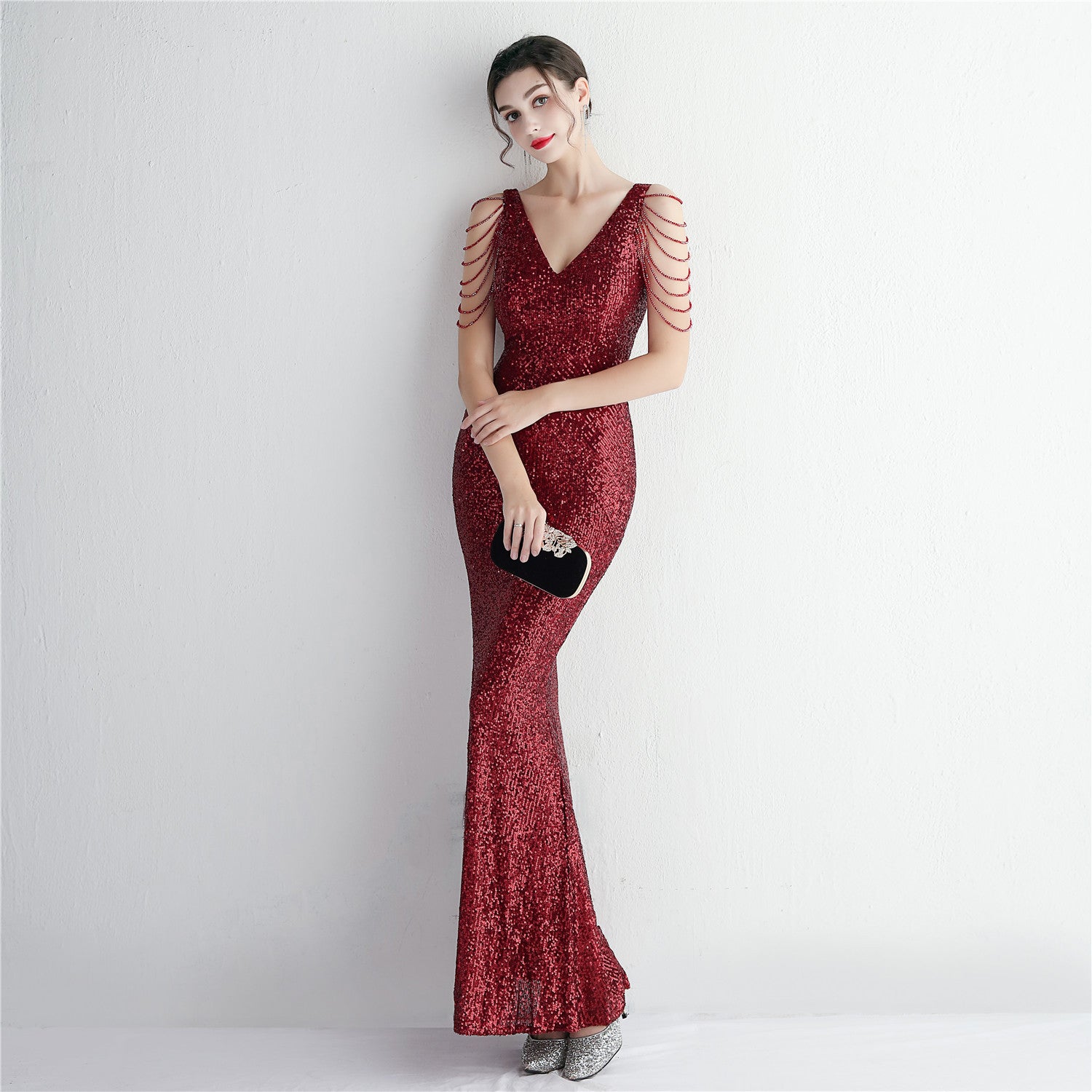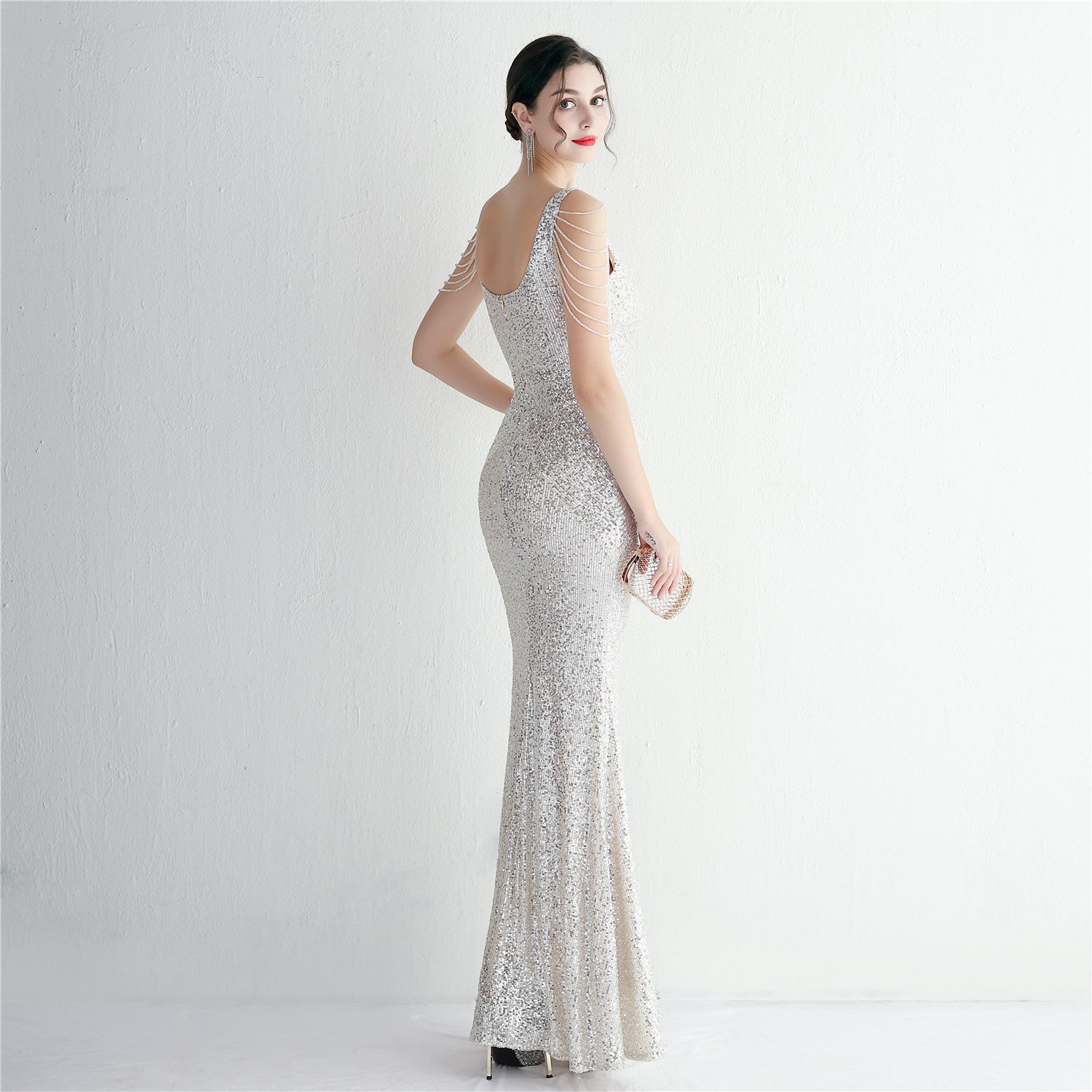 A slender fishtail maxi with a clean, streamlined silhouette. A V-neckline frames the bodice while sequin fringe adds subtle embellishment.
