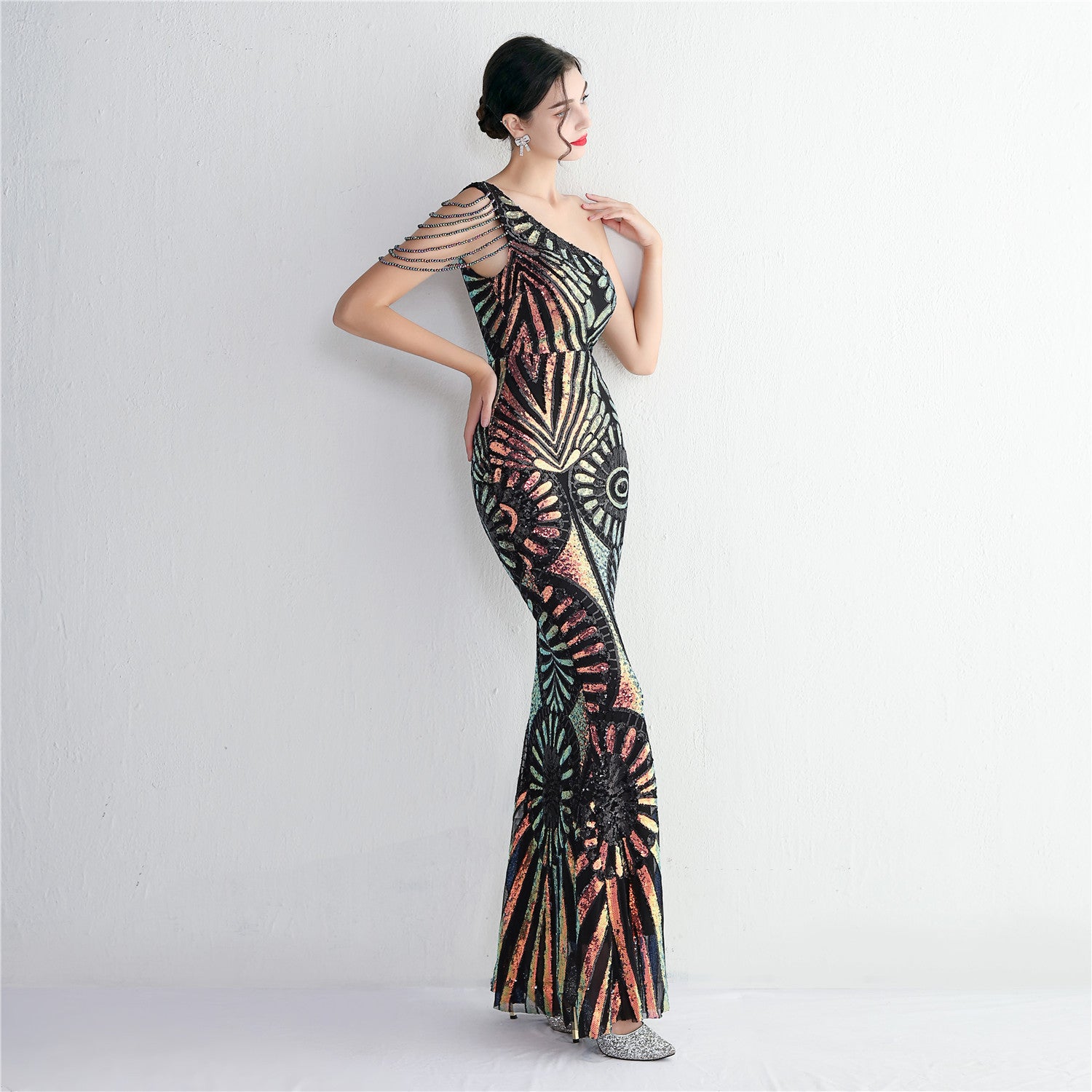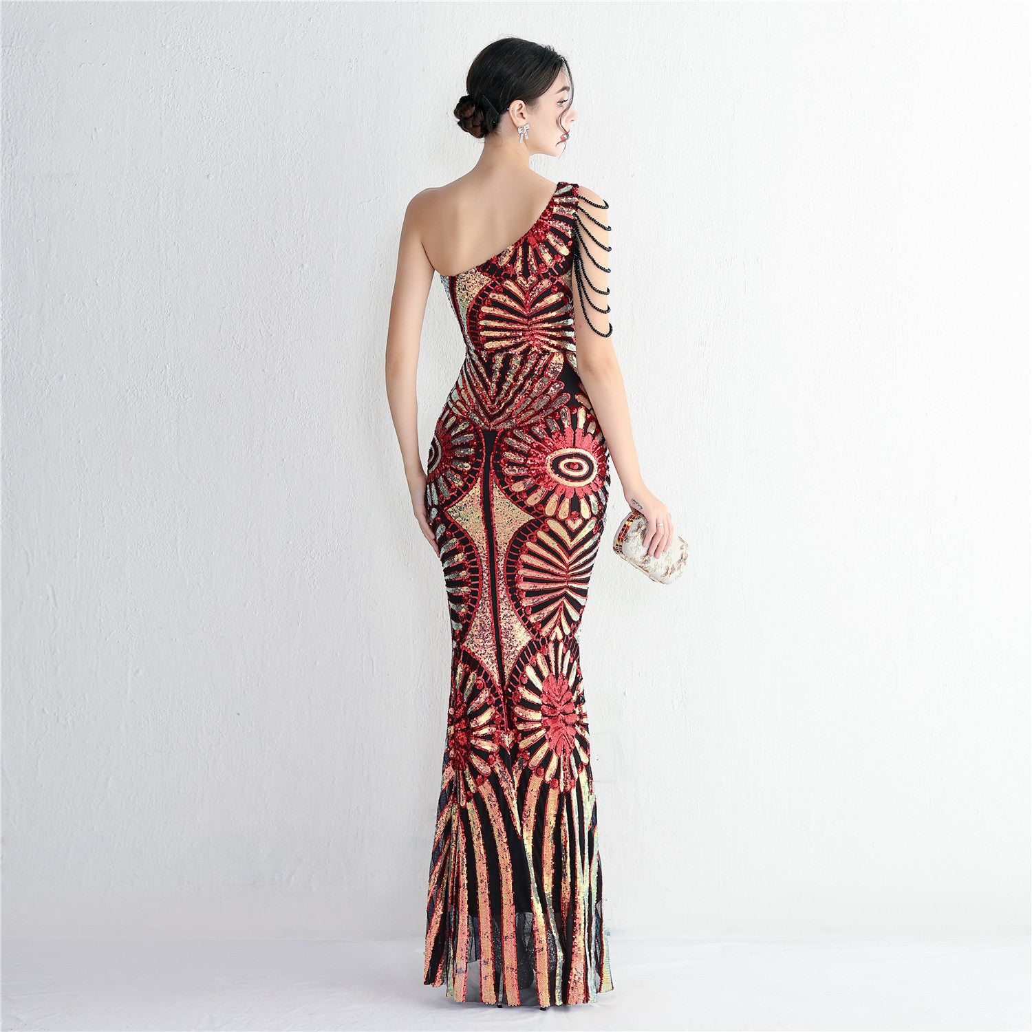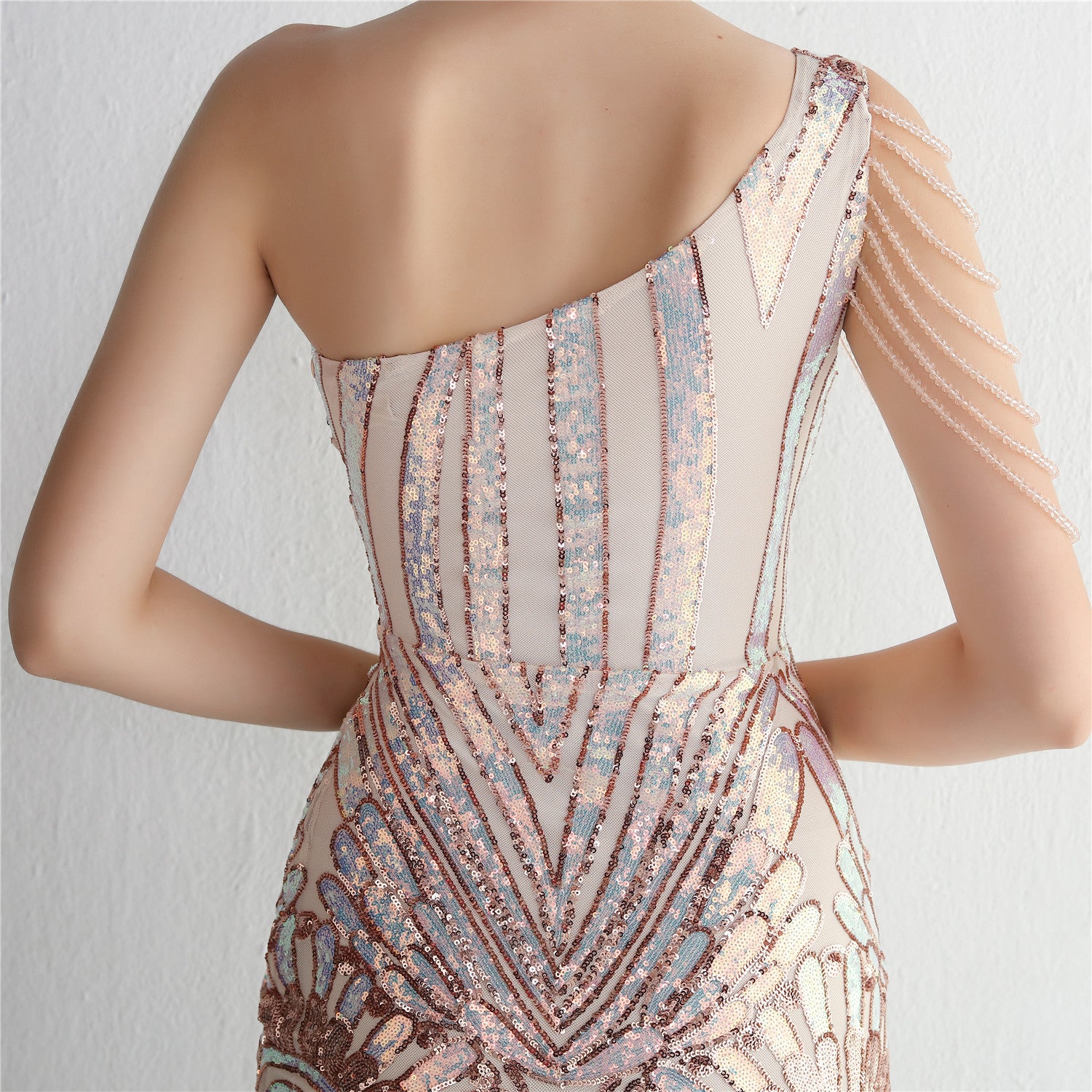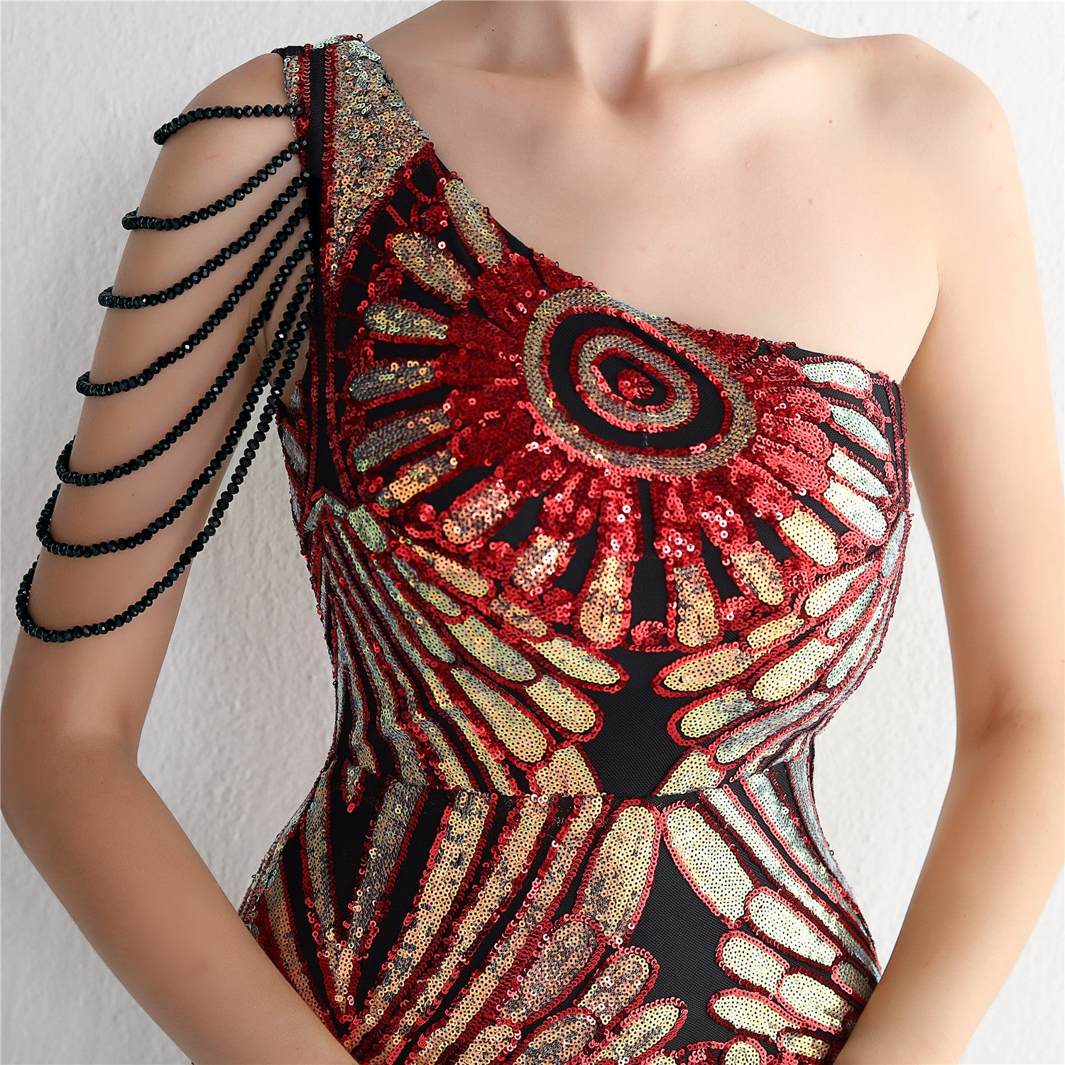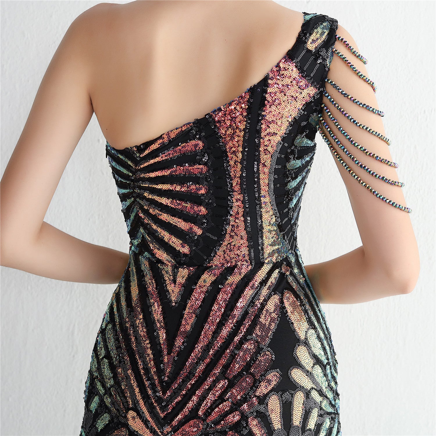 An elegant, slim-fit maxi with a dramatic one-shoulder neckline. Sequins and fringe trace an asymmetric silhouette for subtle movement.