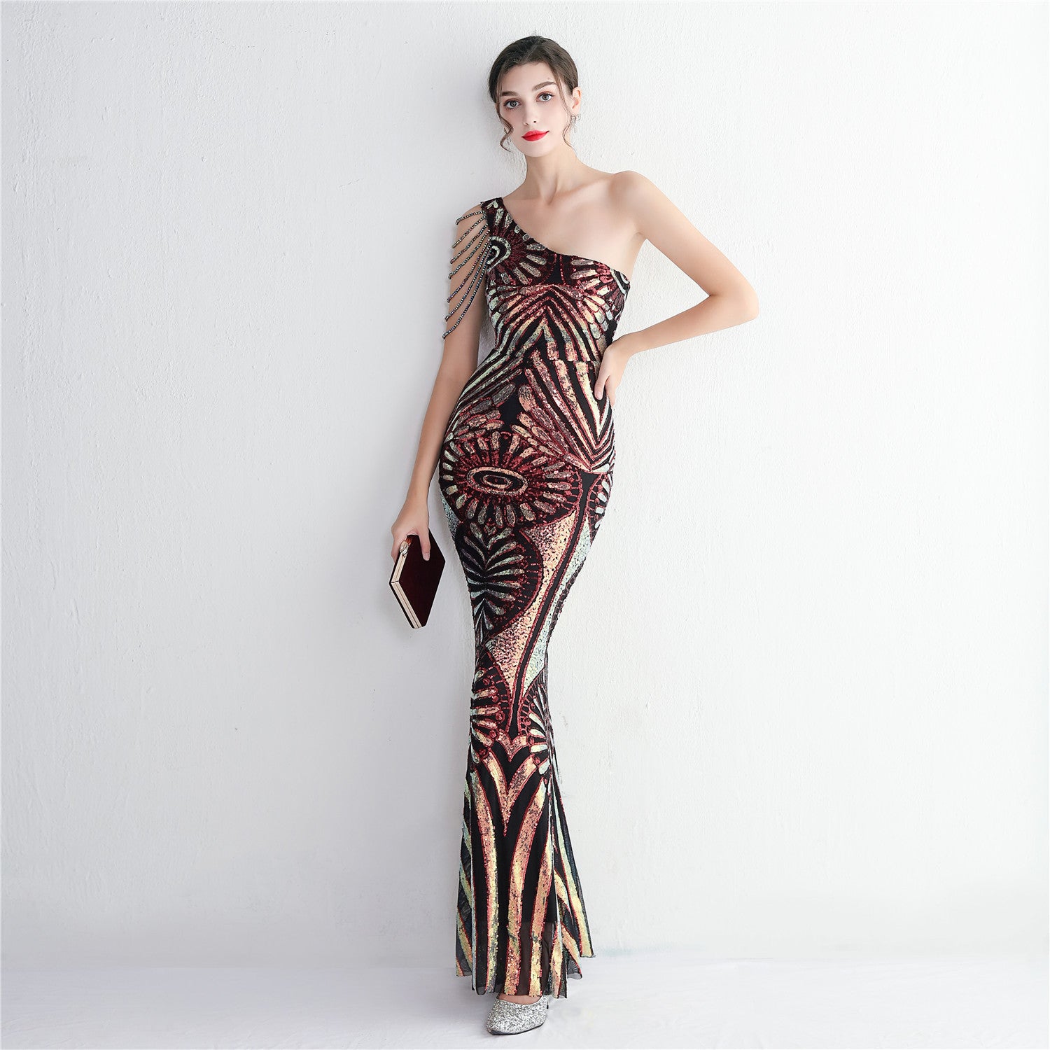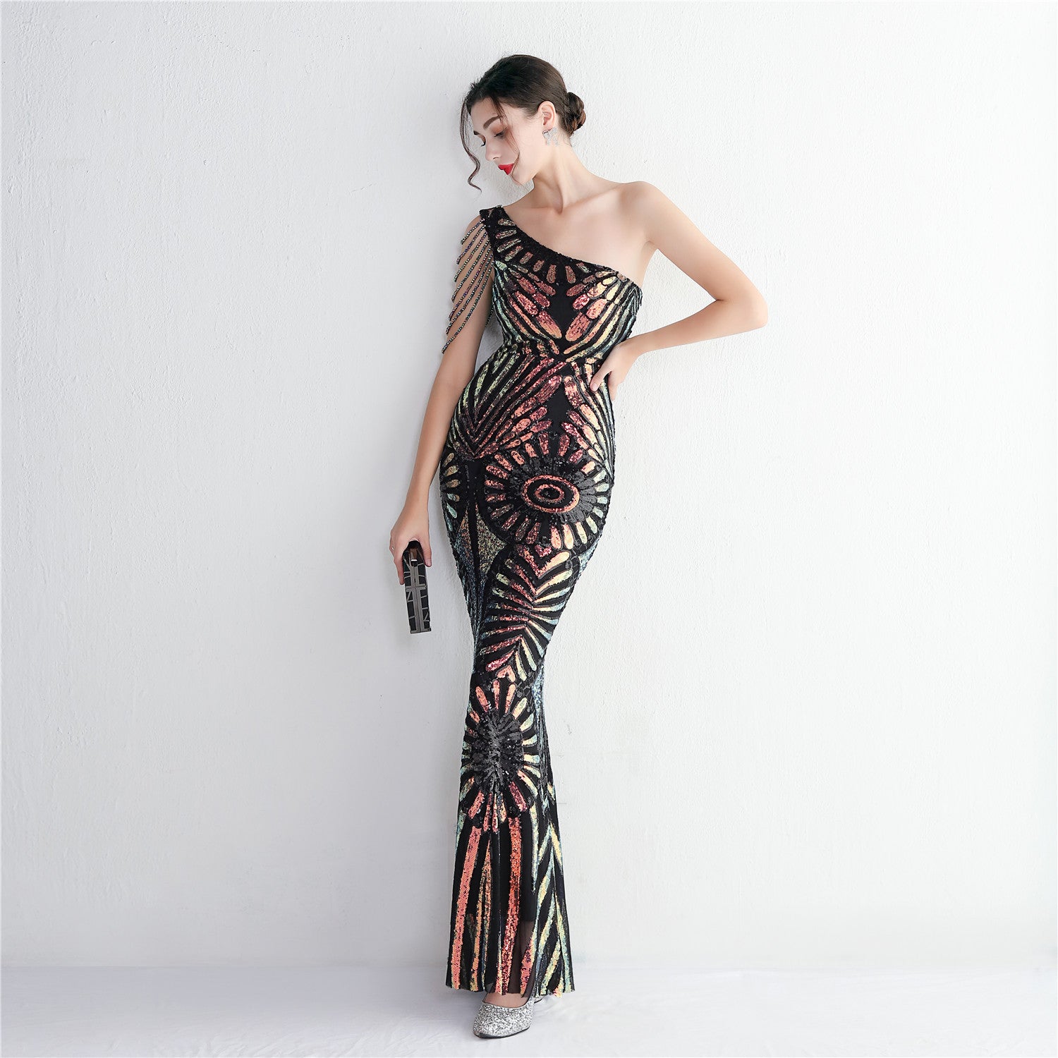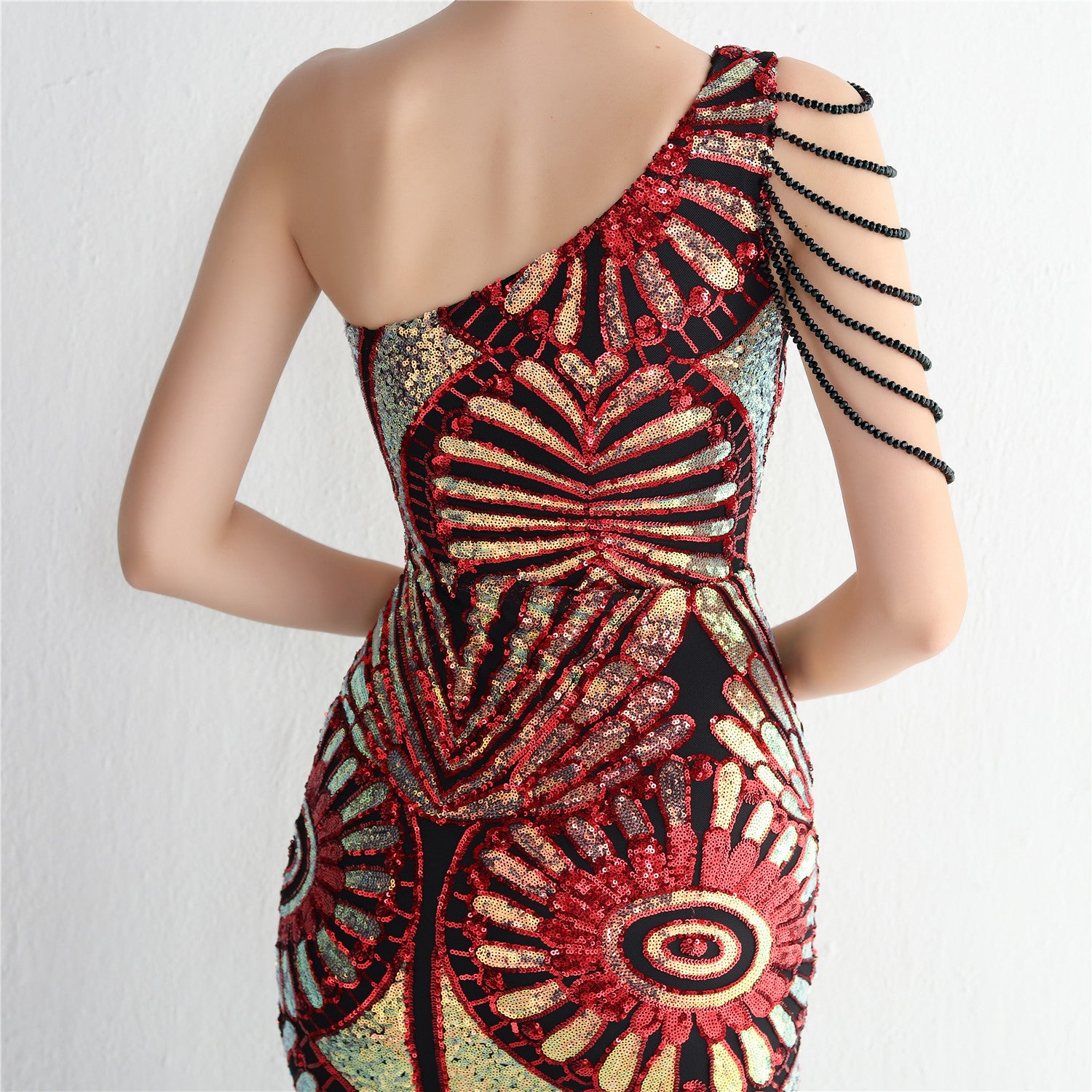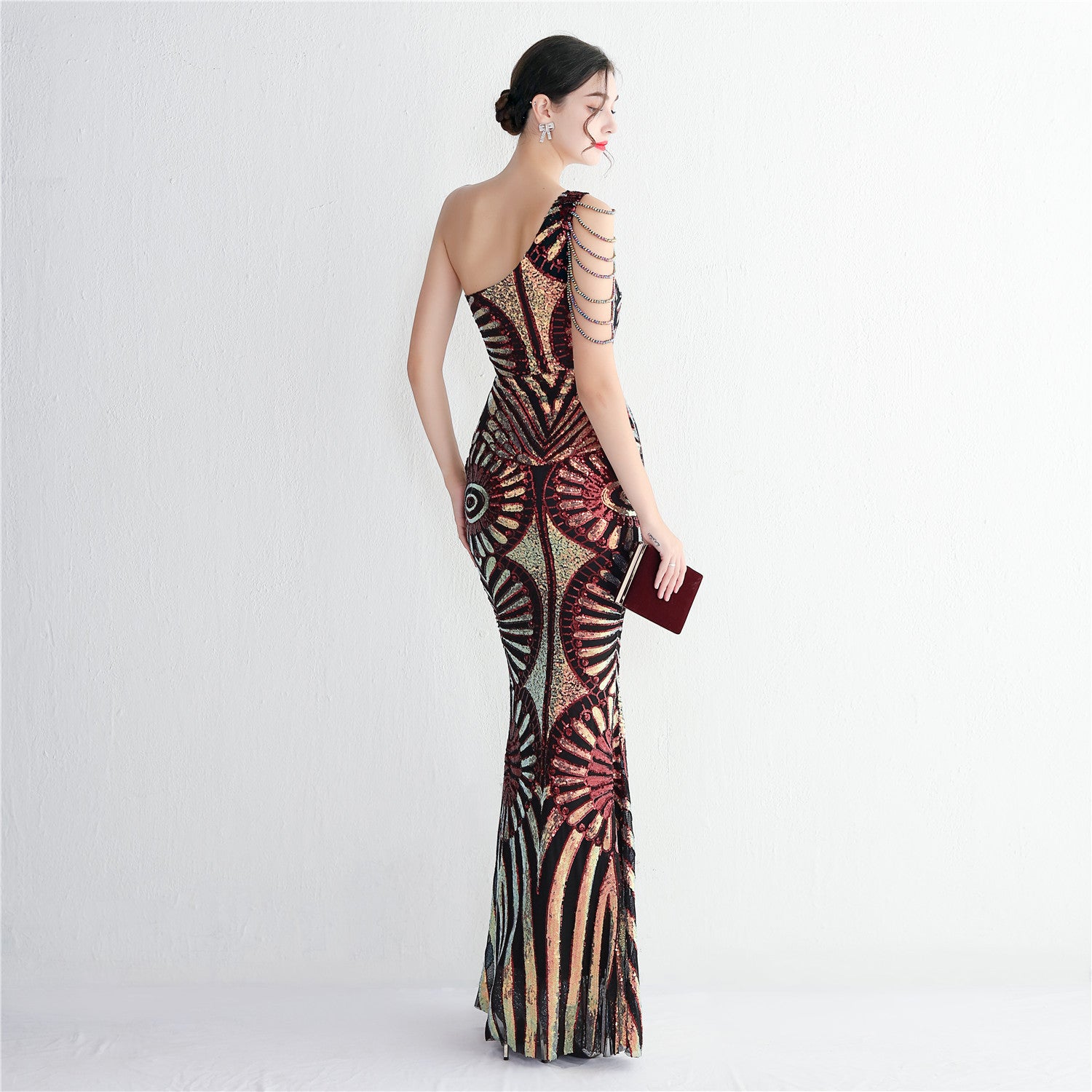 An elegant, slim-fit maxi with a dramatic one-shoulder neckline. Sequins and fringe trace an asymmetric silhouette for subtle movement.