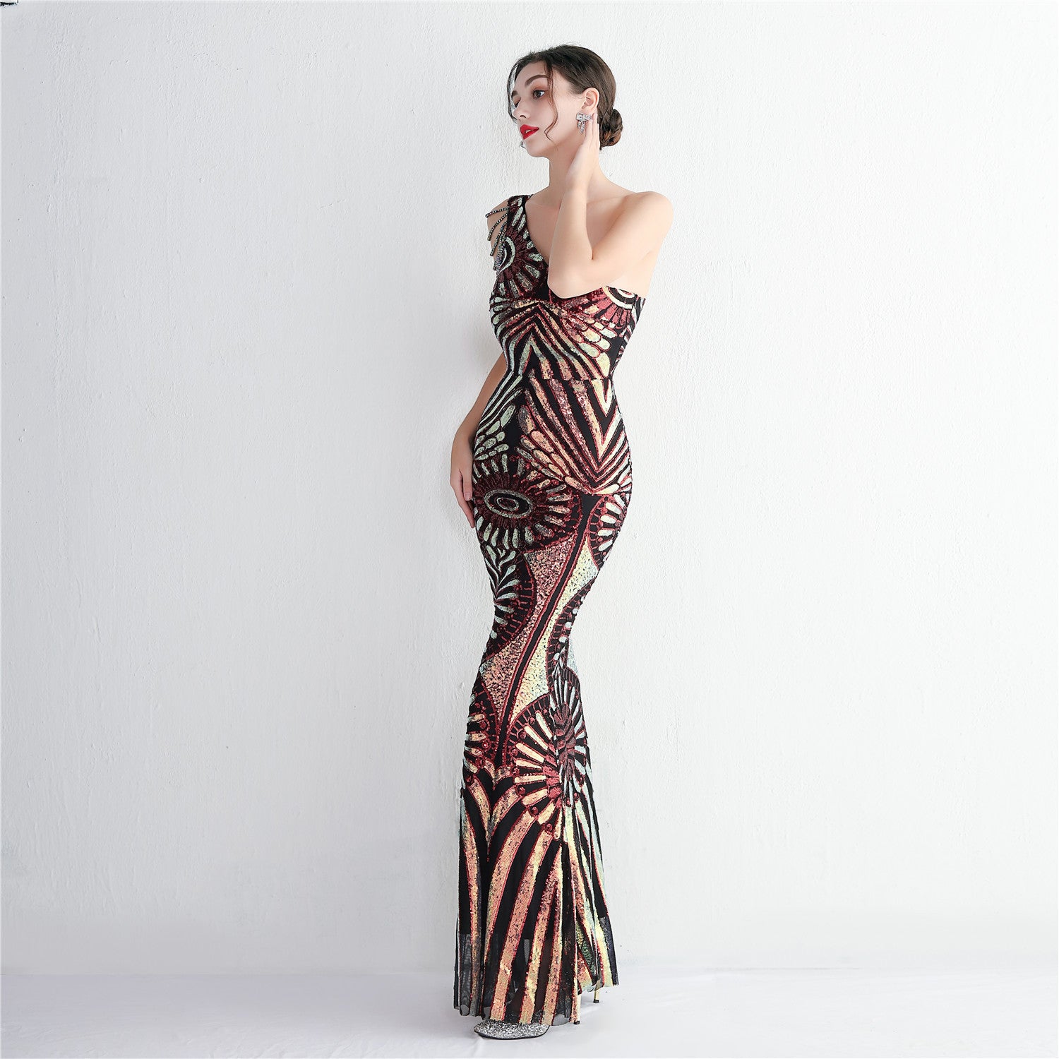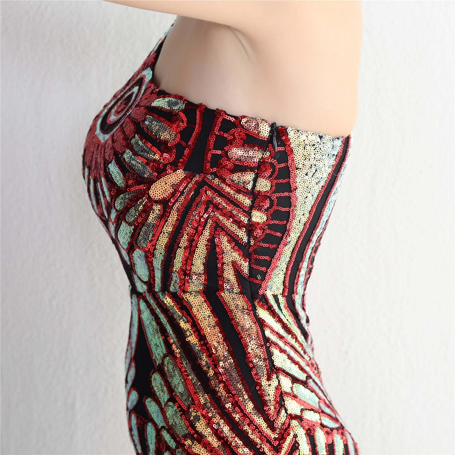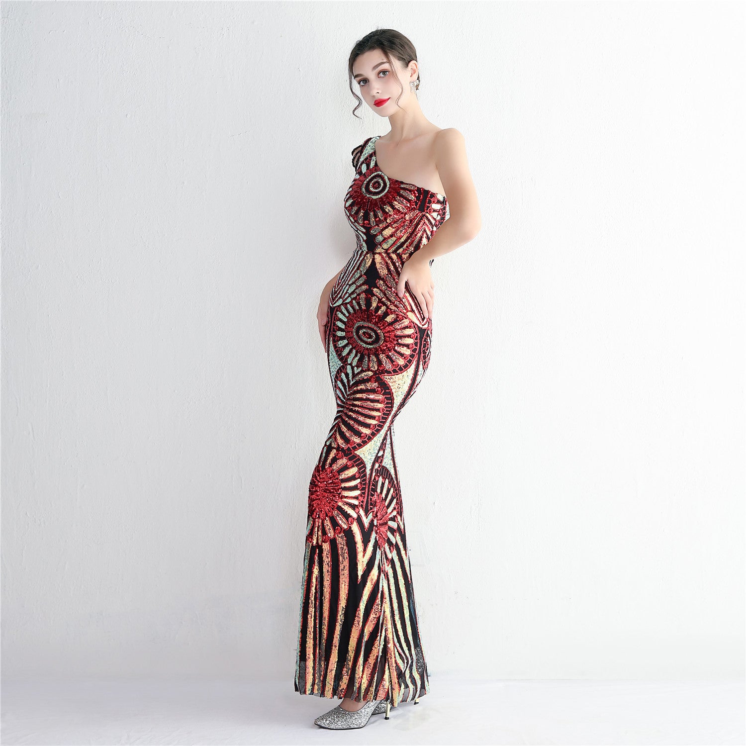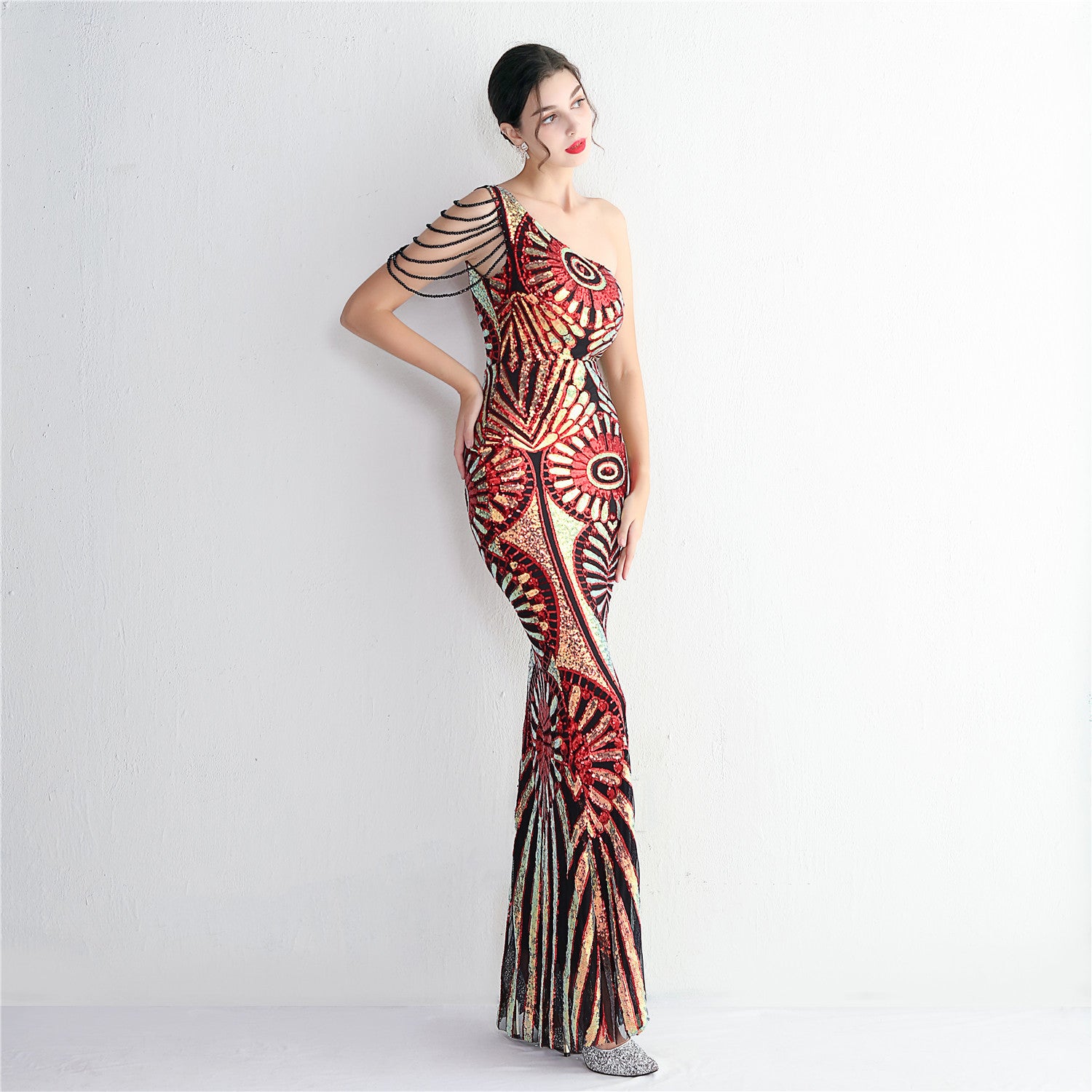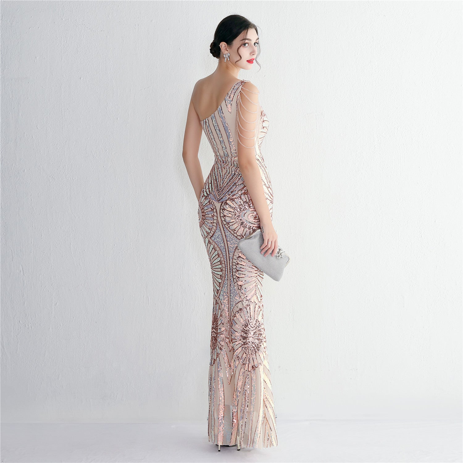 An elegant, slim-fit maxi with a dramatic one-shoulder neckline. Sequins and fringe trace an asymmetric silhouette for subtle movement.