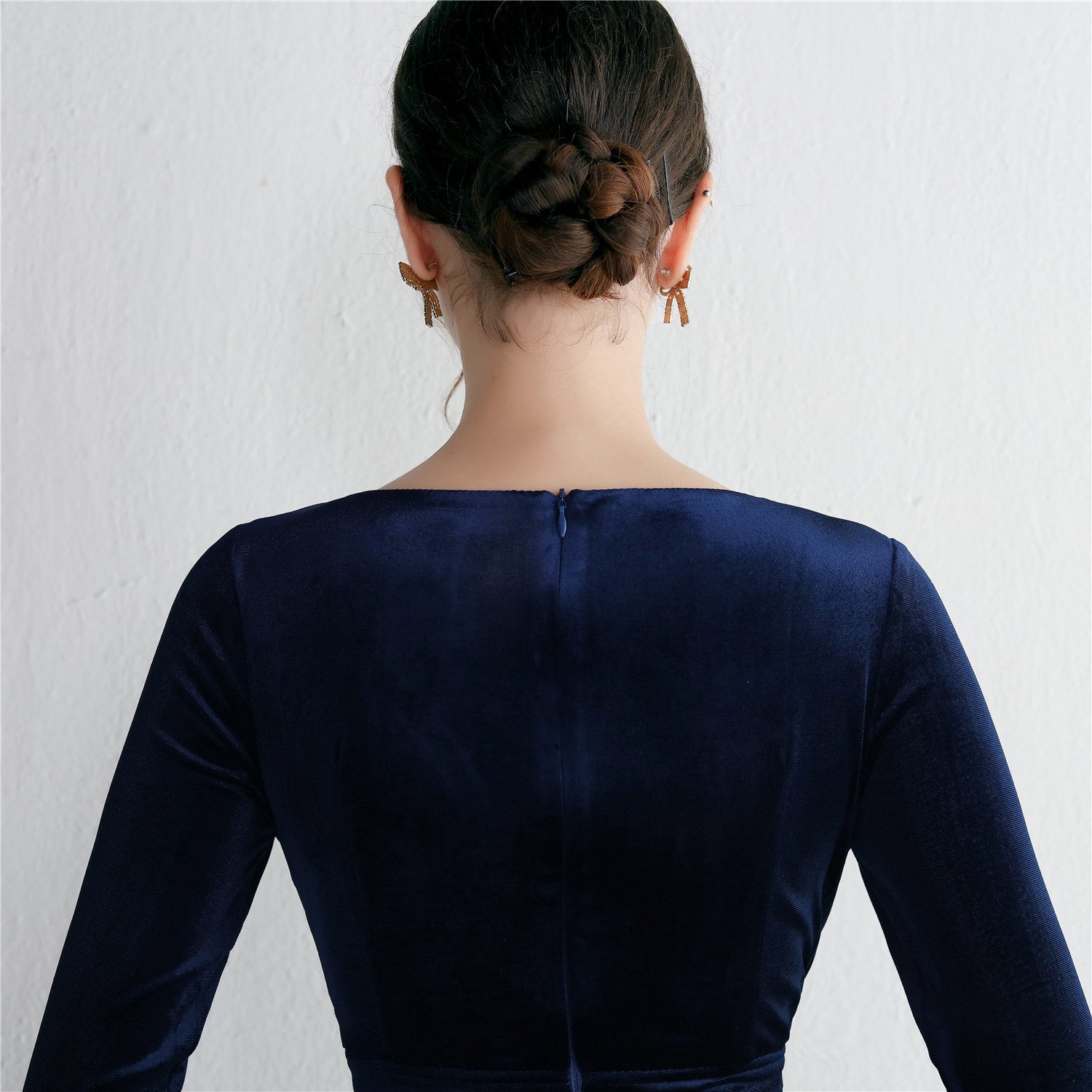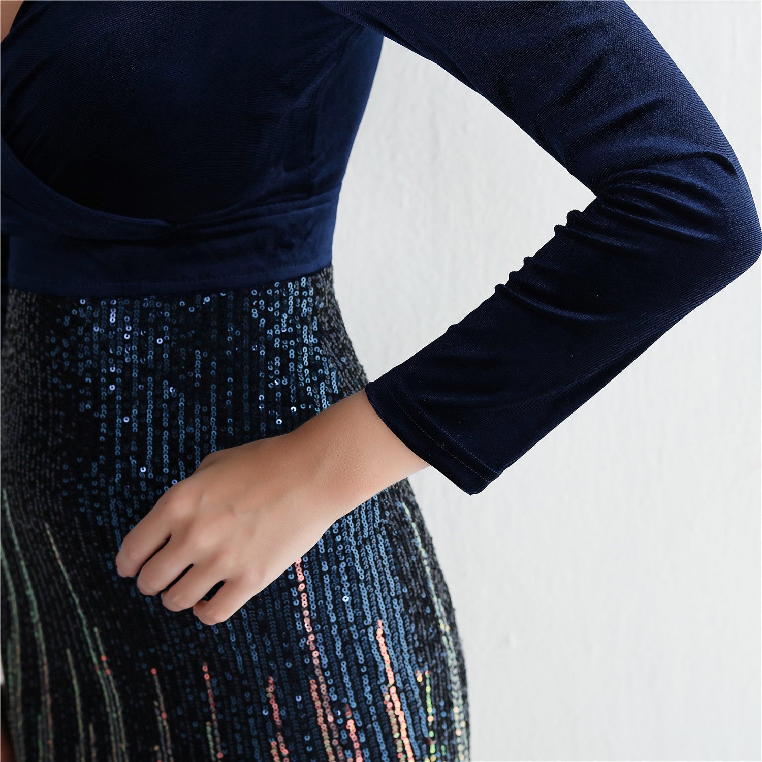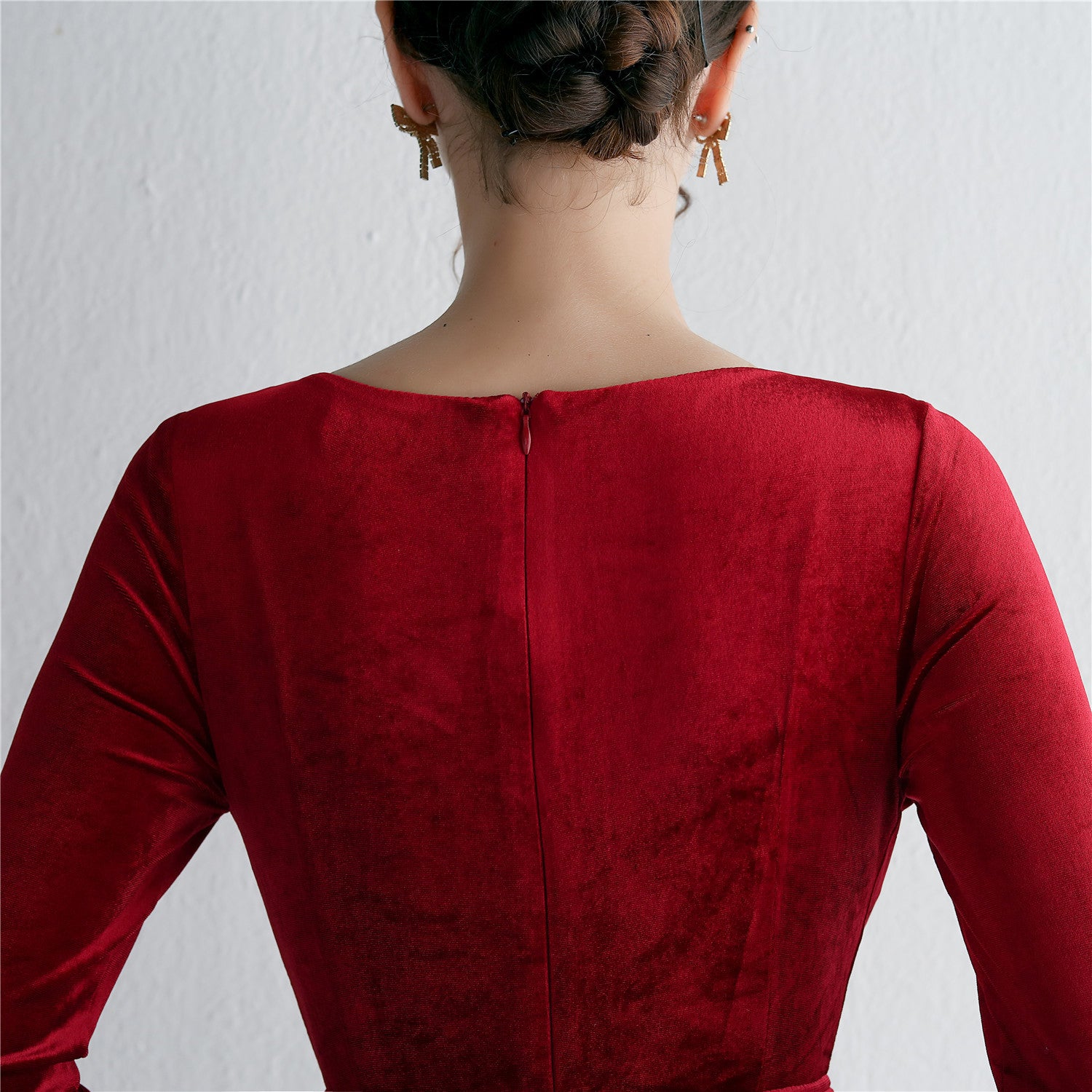 The dress follows a slim, body-skimming silhouette. A V-neckline with sequin embellishment accents the velvet, finished with a fishtail hem and long sleeves.