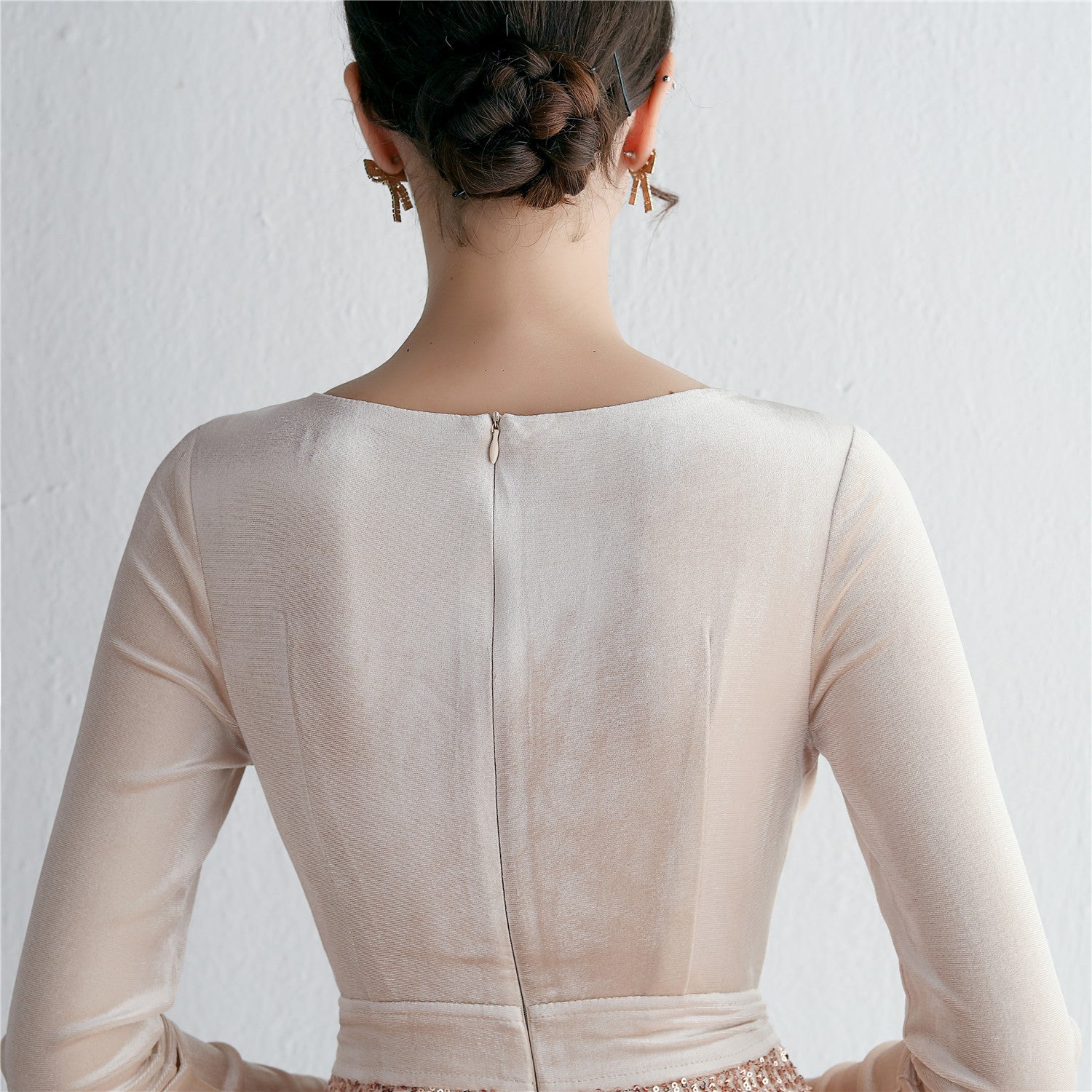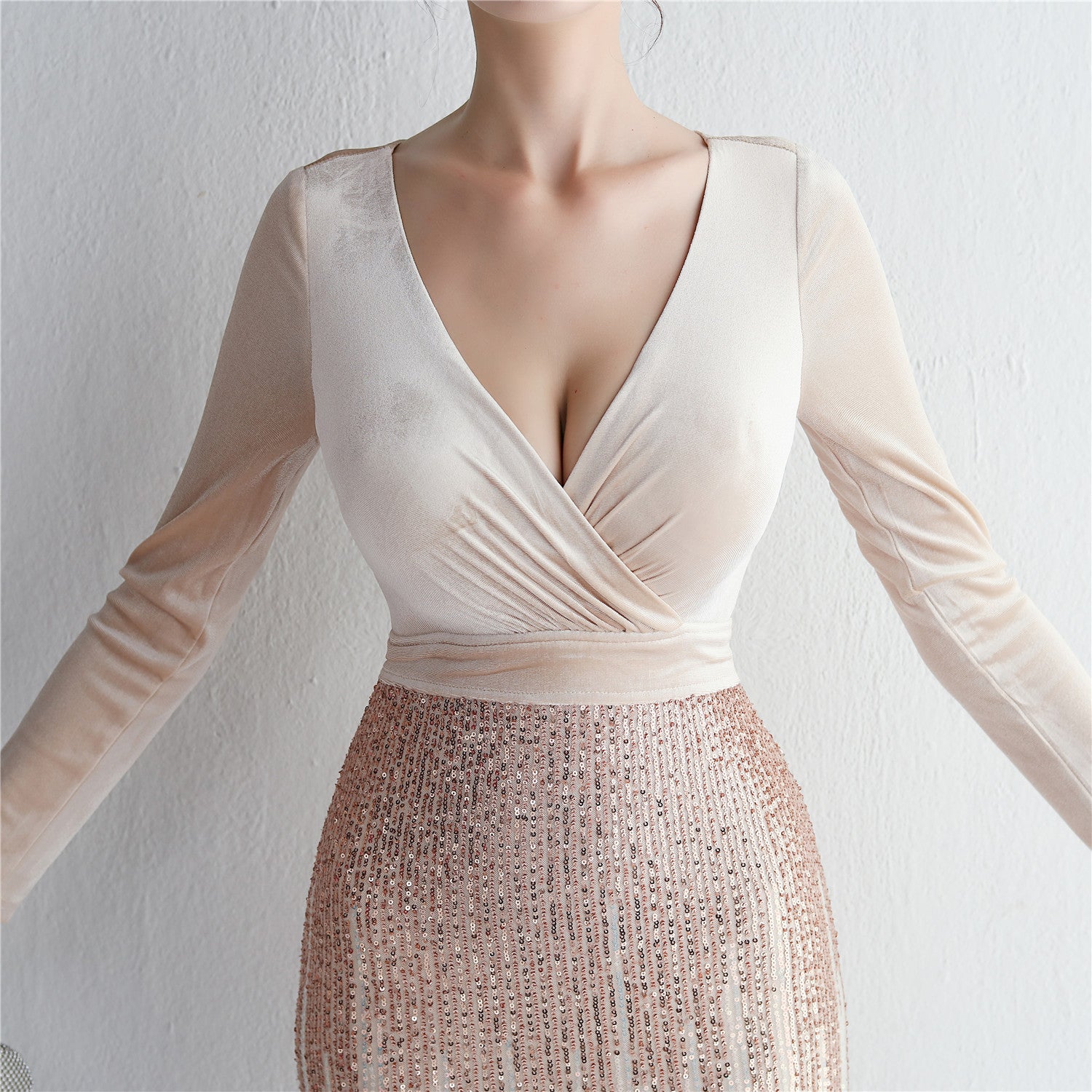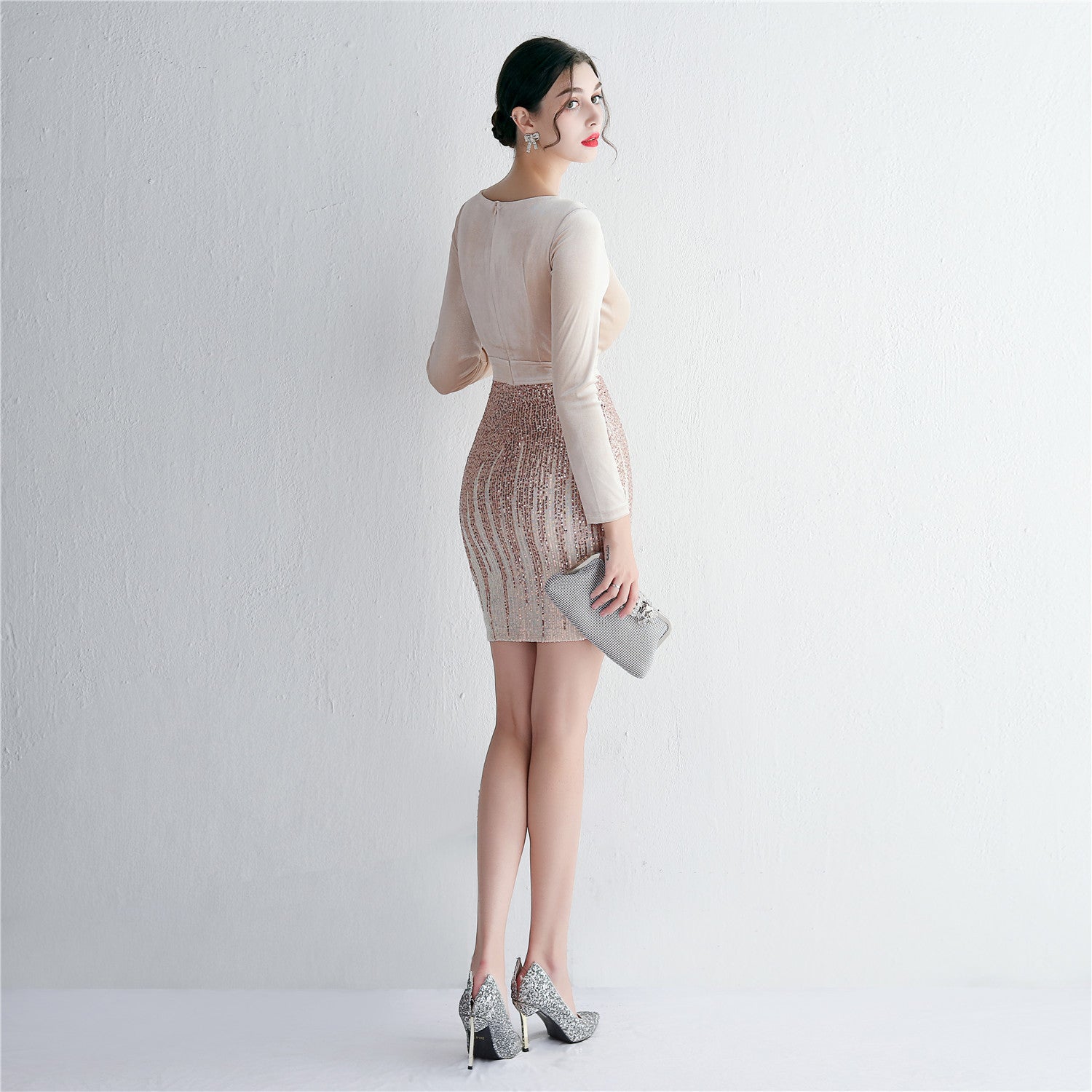 The dress follows a slim, body-skimming silhouette. A V-neckline with sequin embellishment accents the velvet, finished with a fishtail hem and long sleeves.