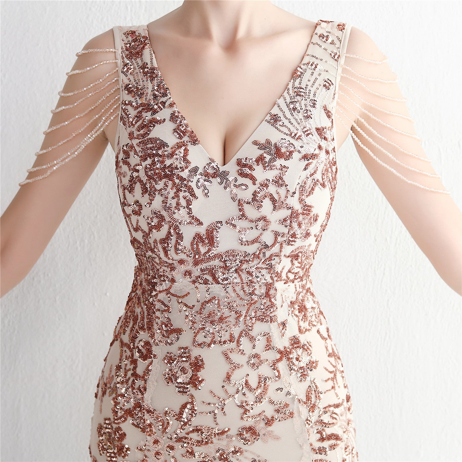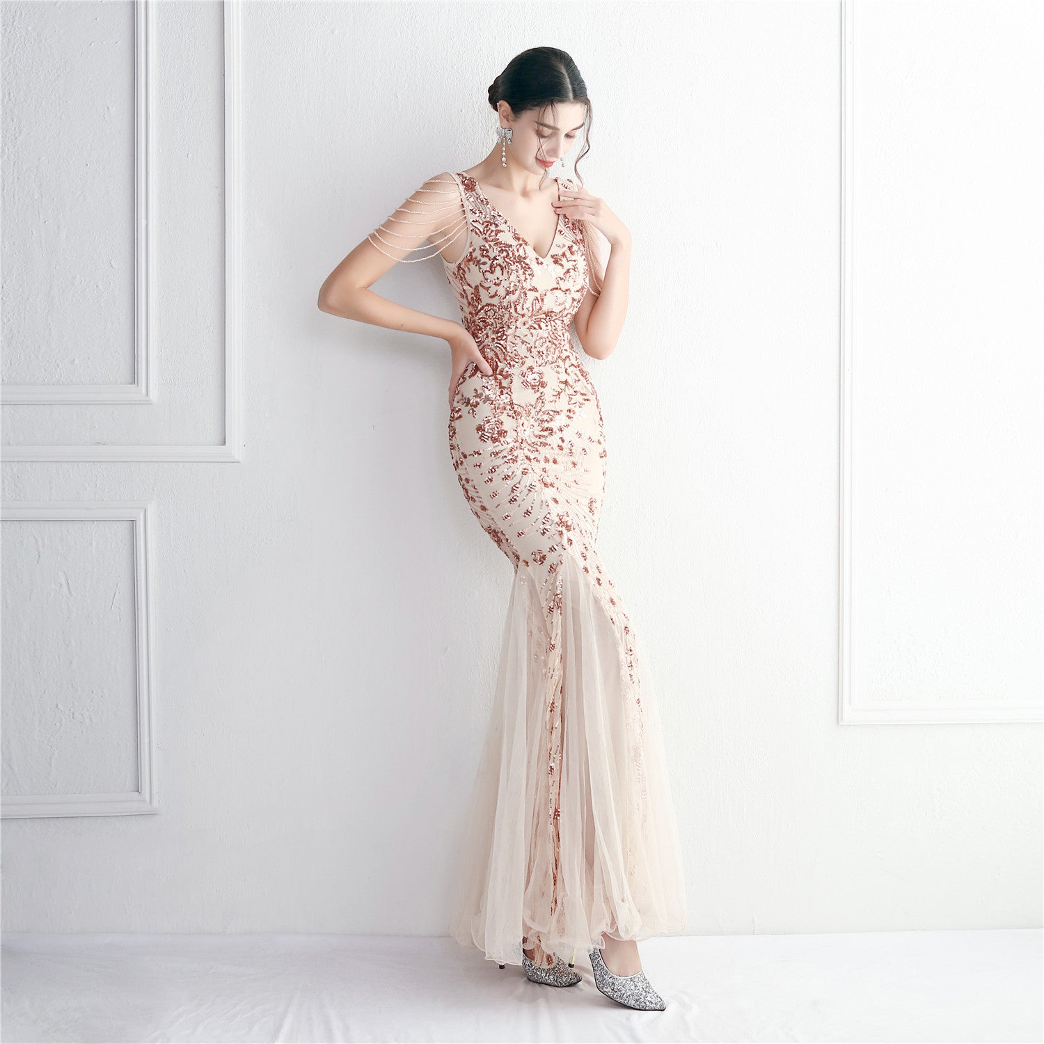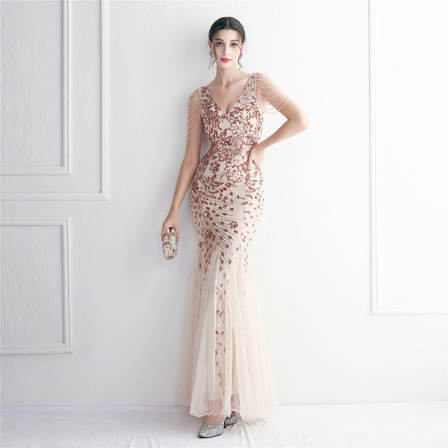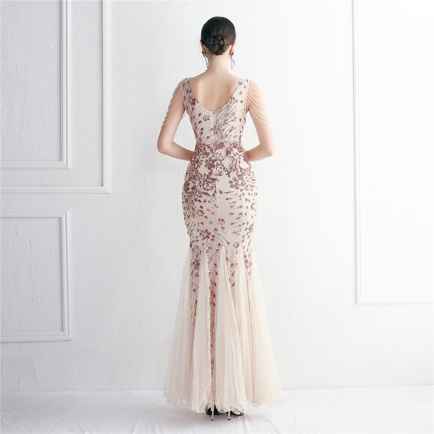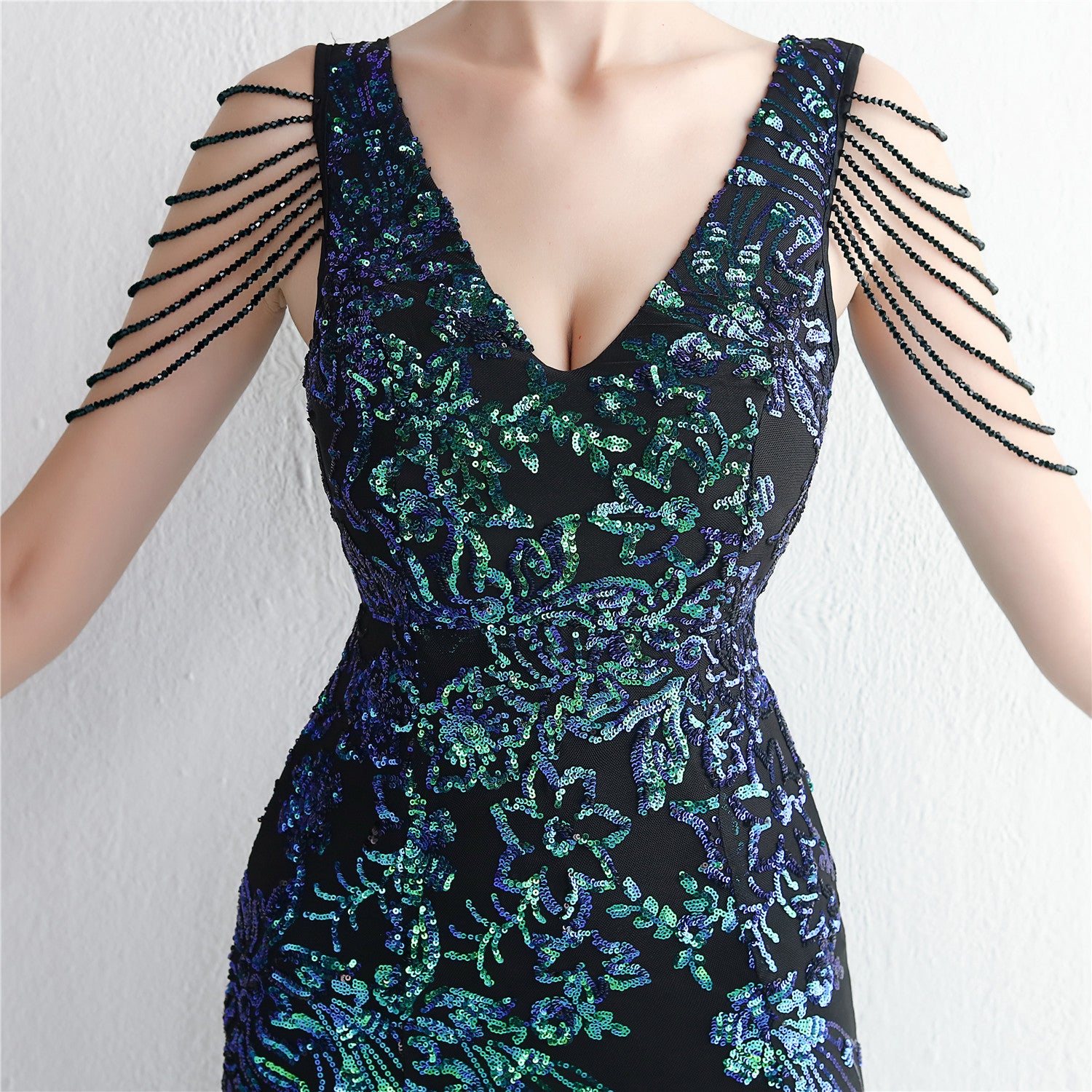 An elegant fishtail maxi with a slim silhouette. The V-neckline frames the collarbone, while floral sequin and bead embellishments accent lace or tulle, finished with fringe trim.