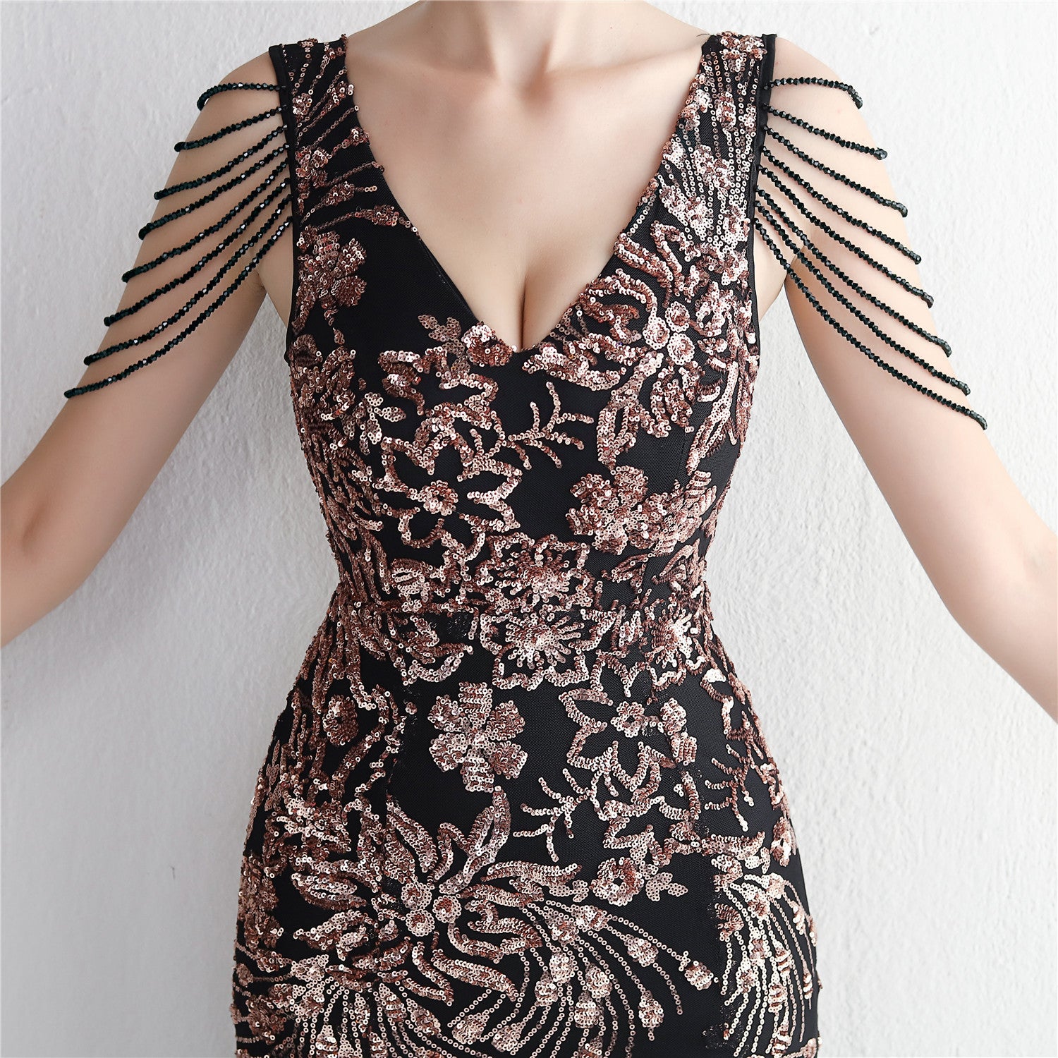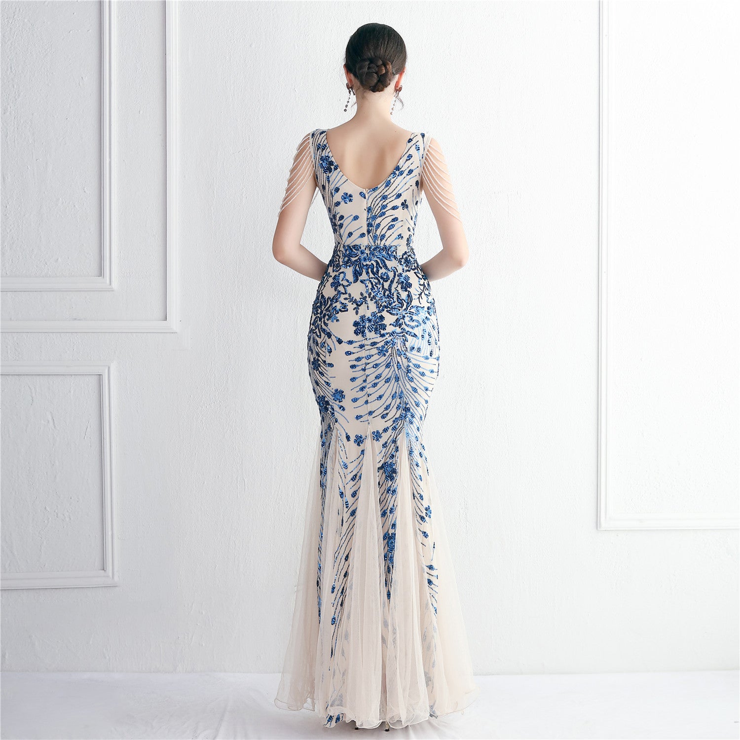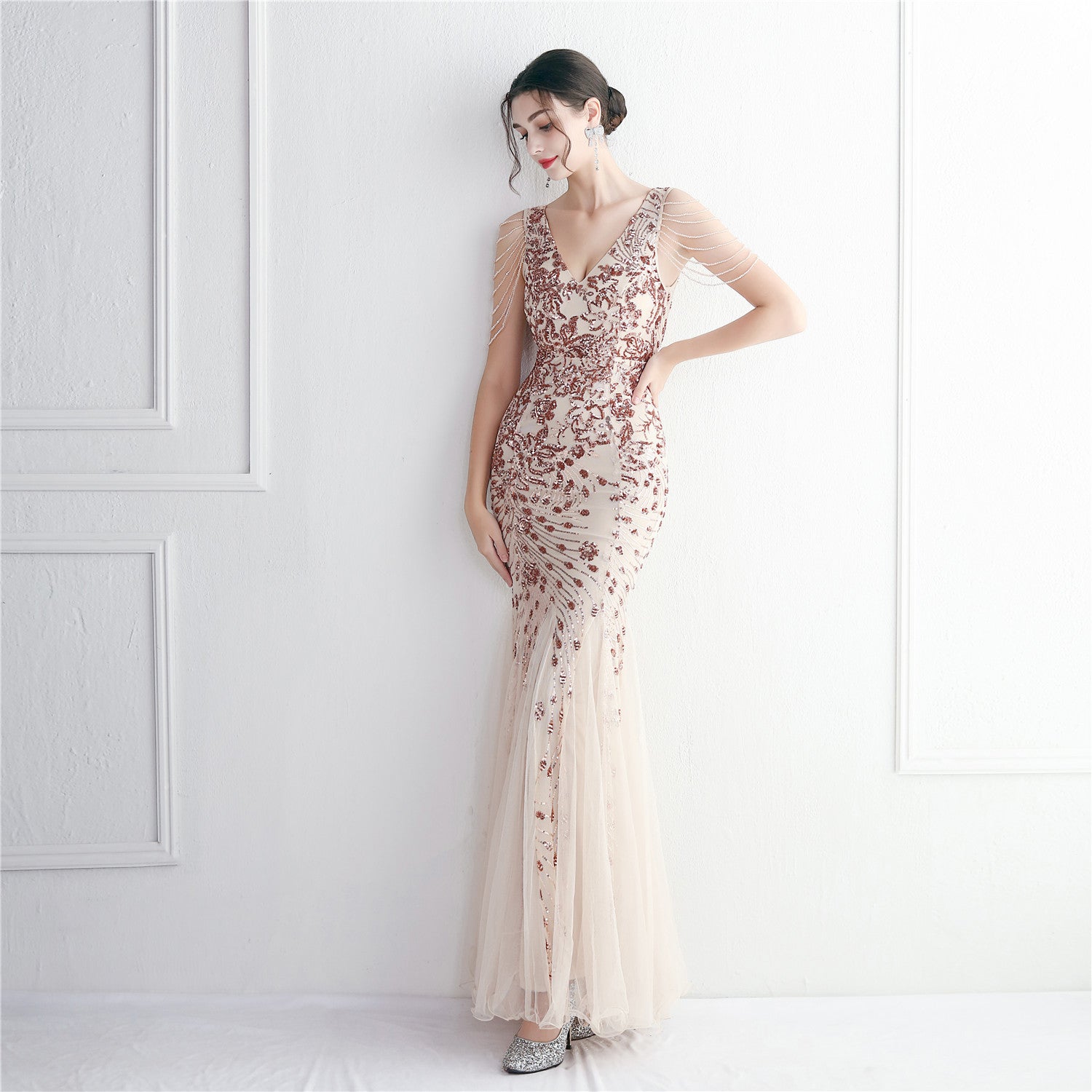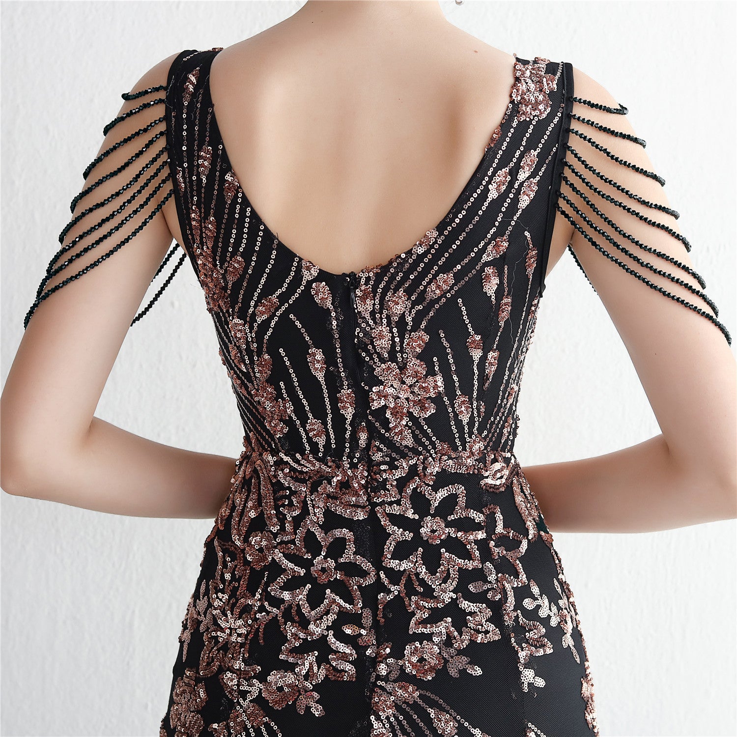 An elegant fishtail maxi with a slim silhouette. The V-neckline frames the collarbone, while floral sequin and bead embellishments accent lace or tulle, finished with fringe trim.