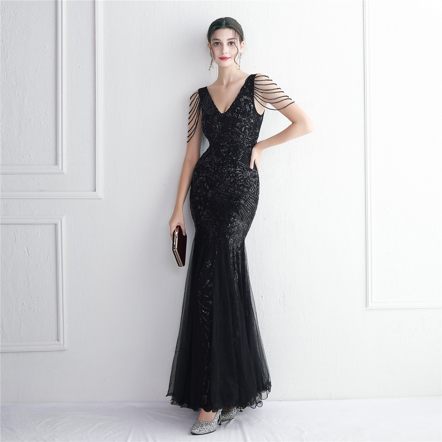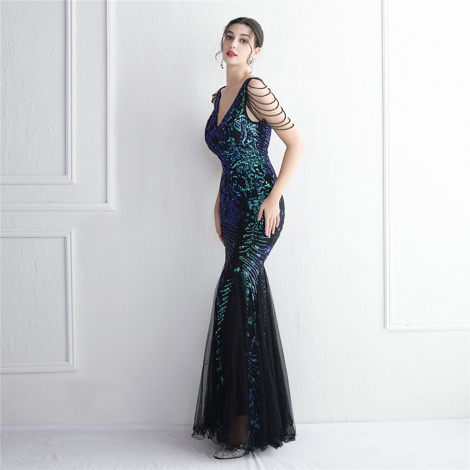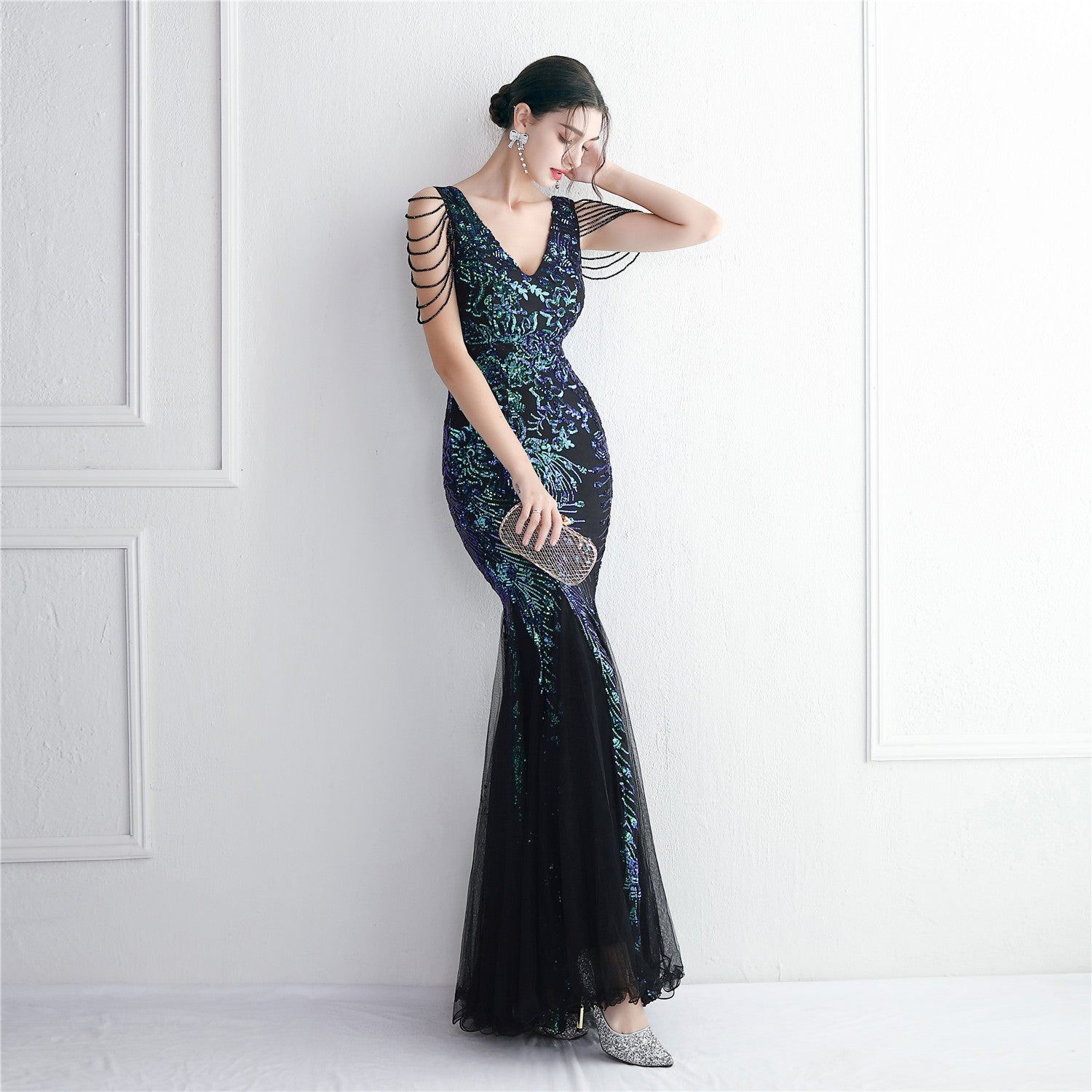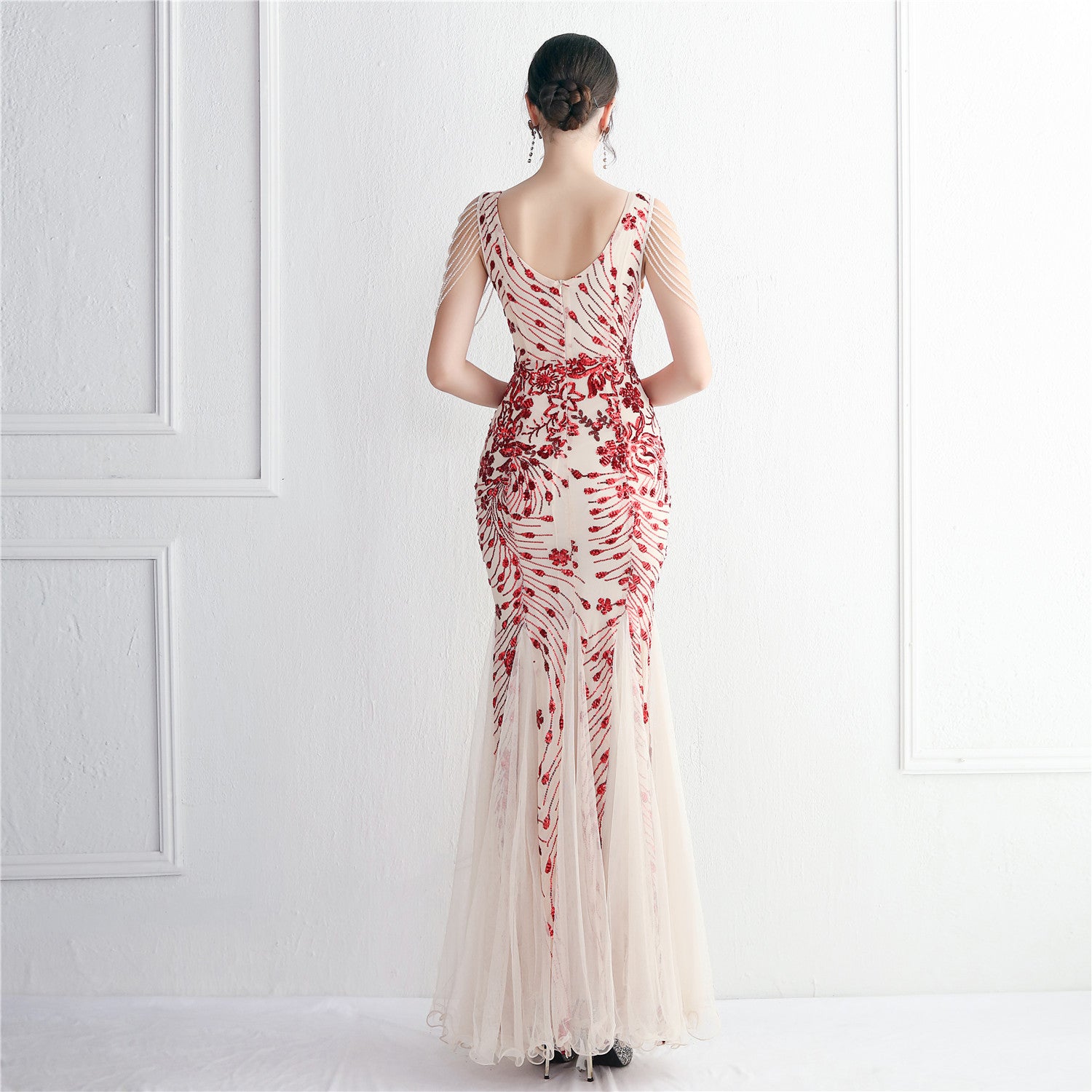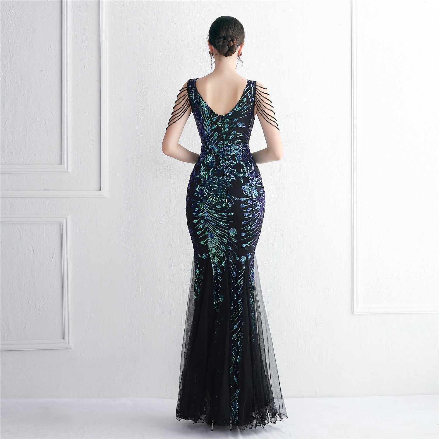 An elegant fishtail maxi with a slim silhouette. The V-neckline frames the collarbone, while floral sequin and bead embellishments accent lace or tulle, finished with fringe trim.